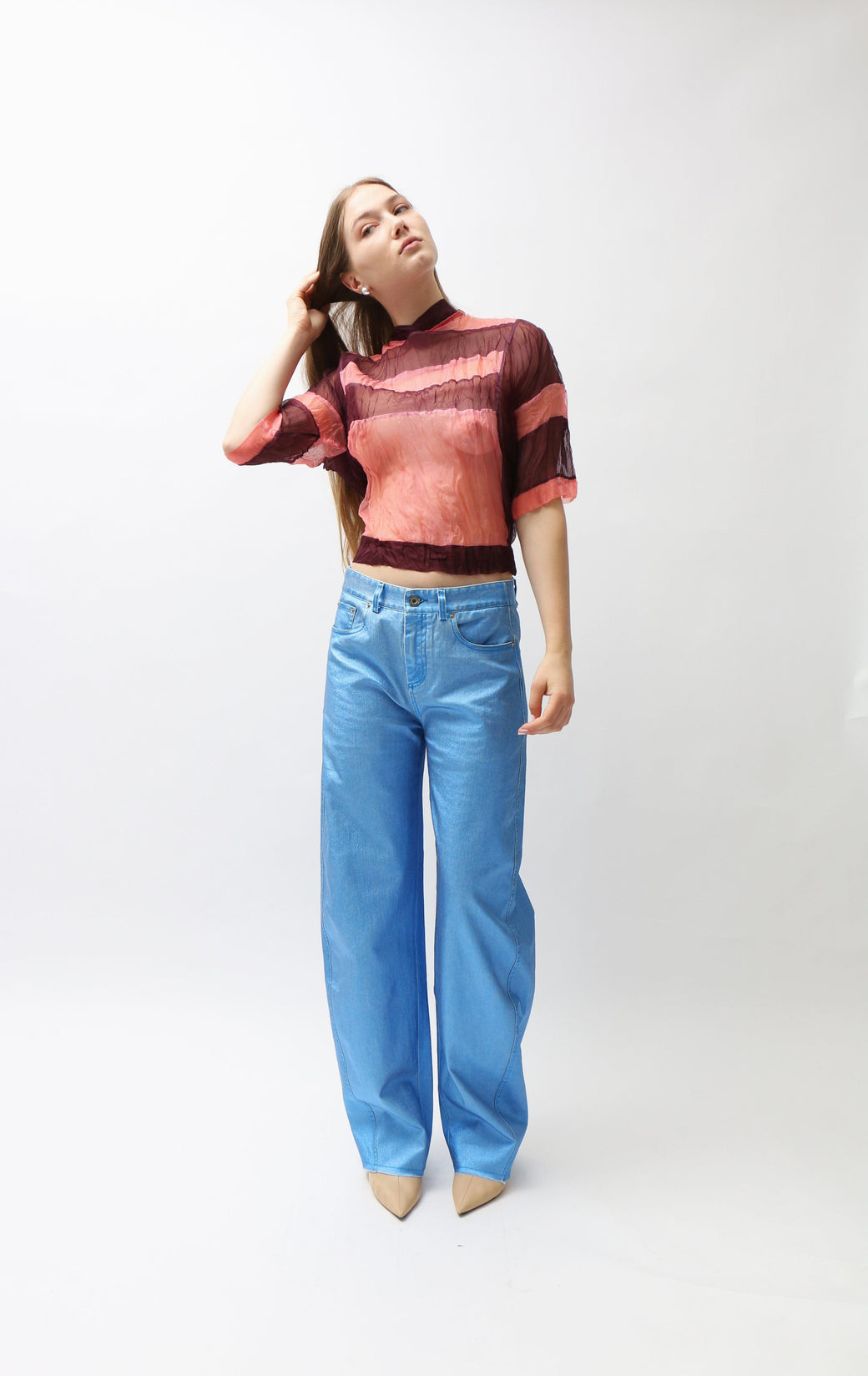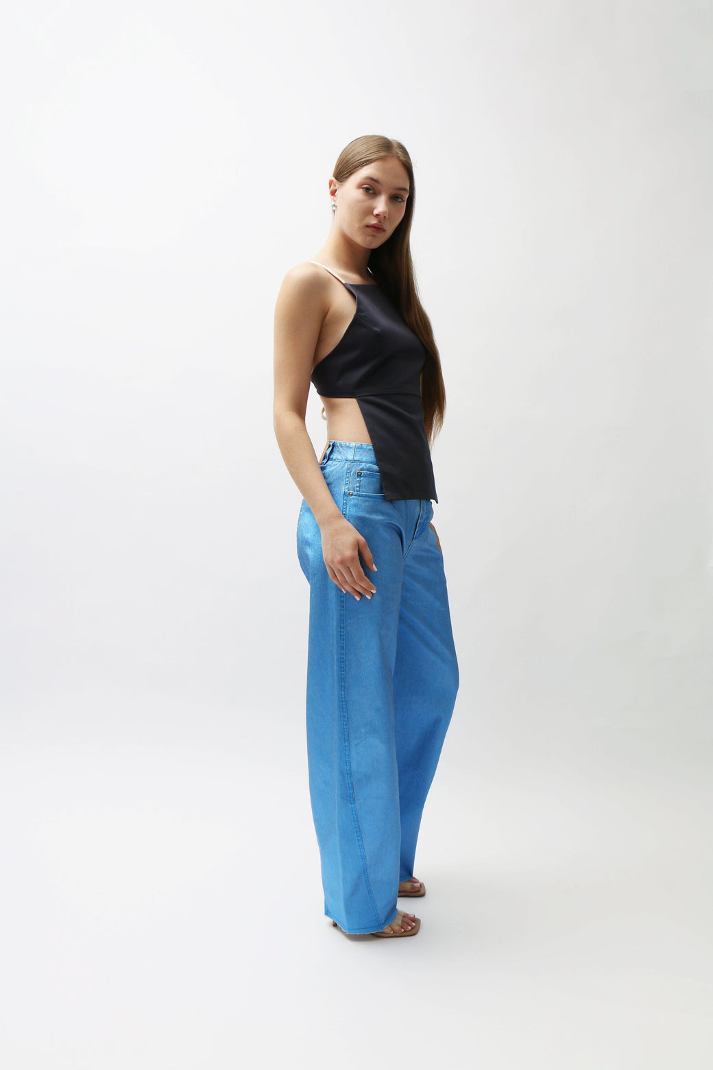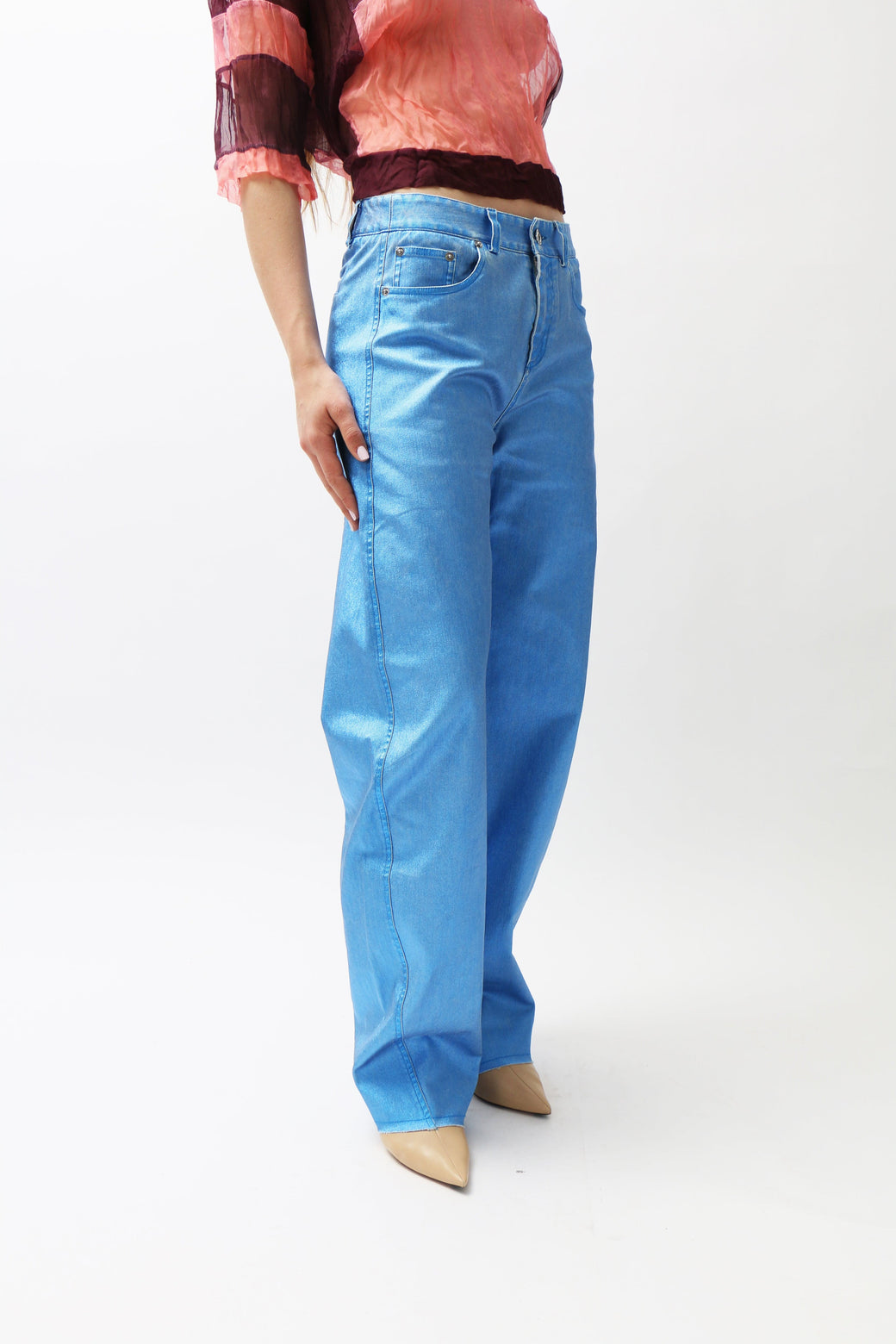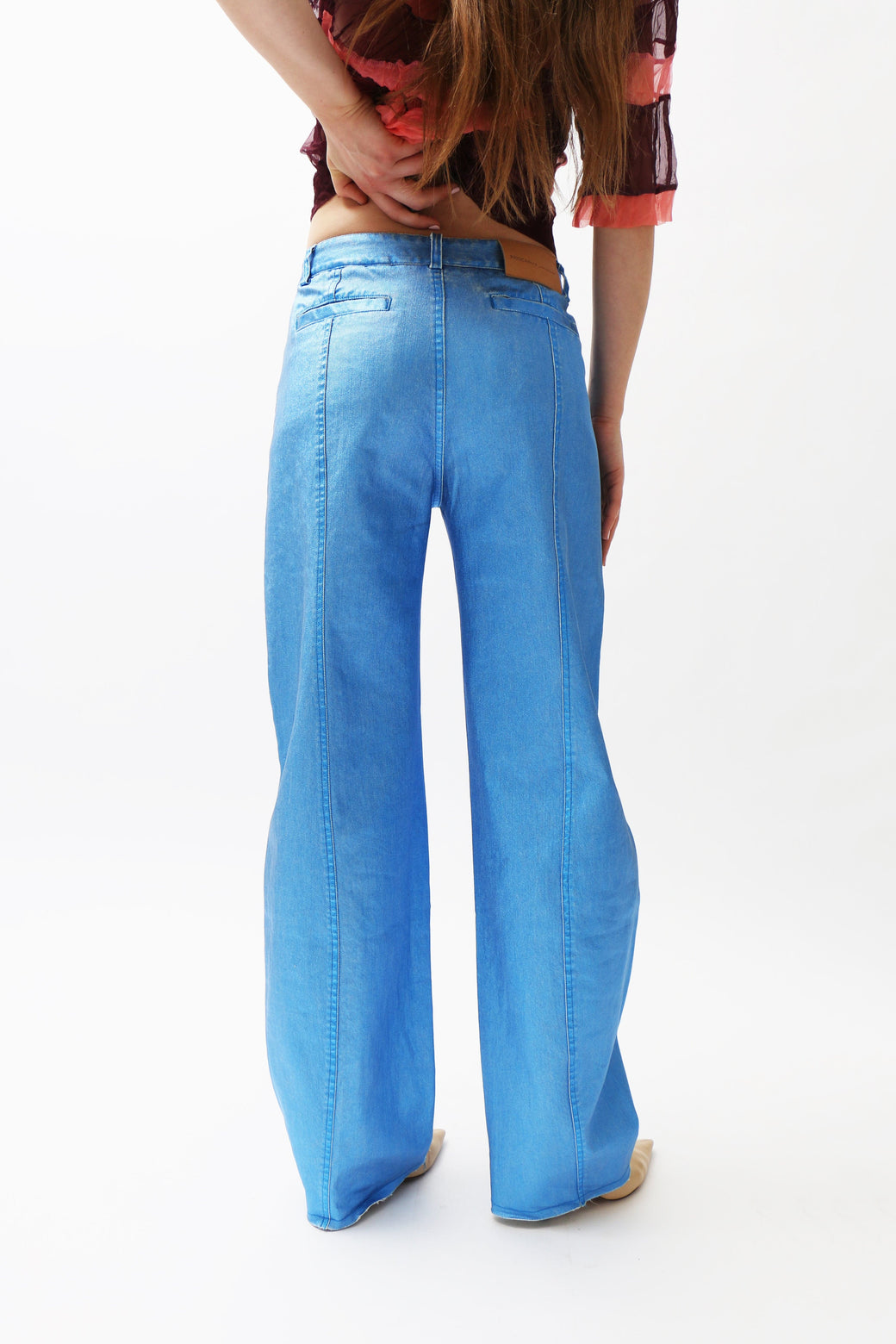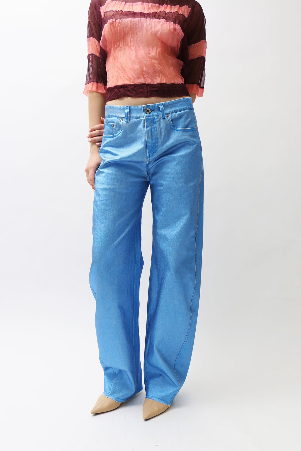 Metallic blue washed denim jeans, designed with a flattering cocoon-twist silhouette. Finished with back welt pockets and tonal seam stitching for a clean, cohesive look.