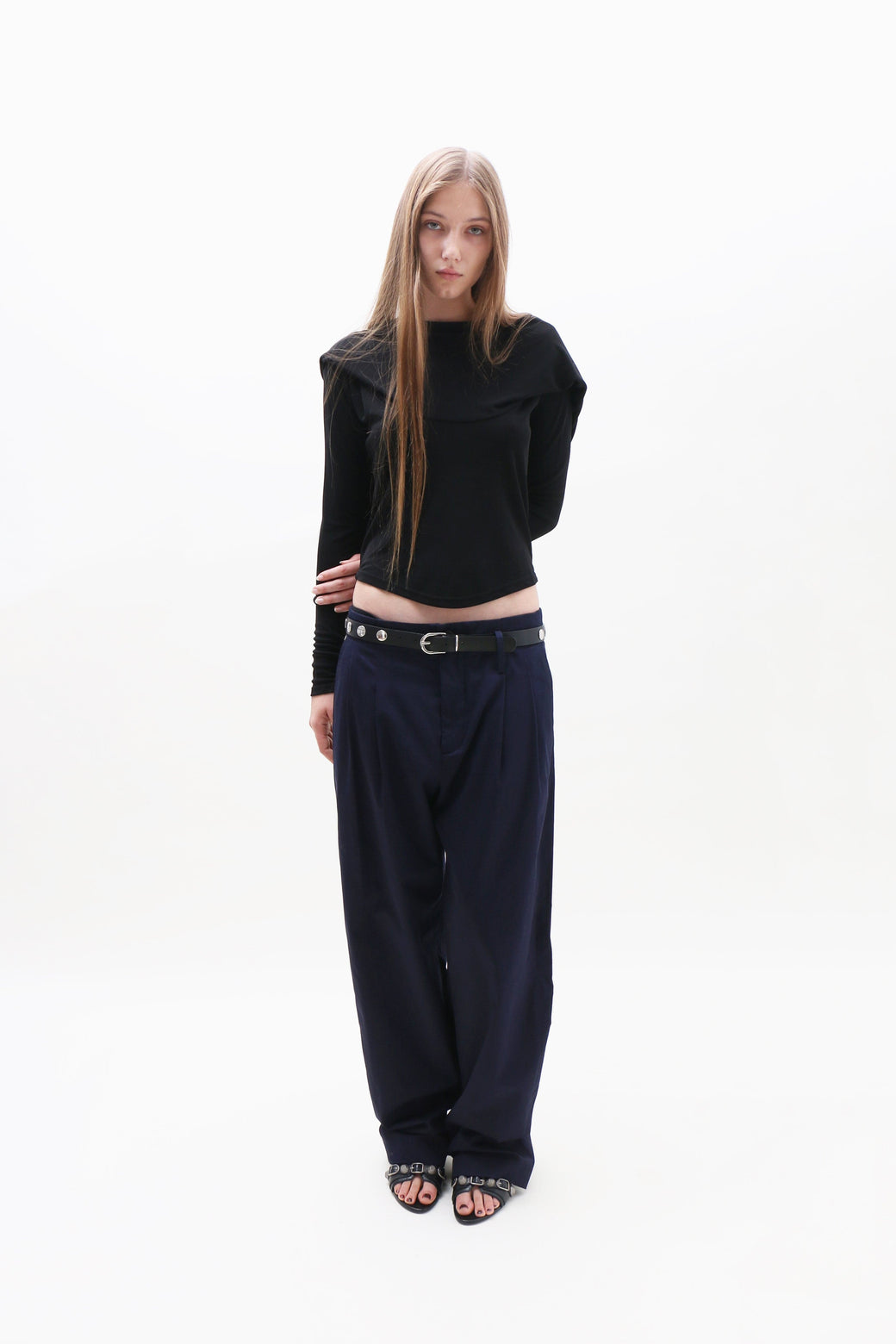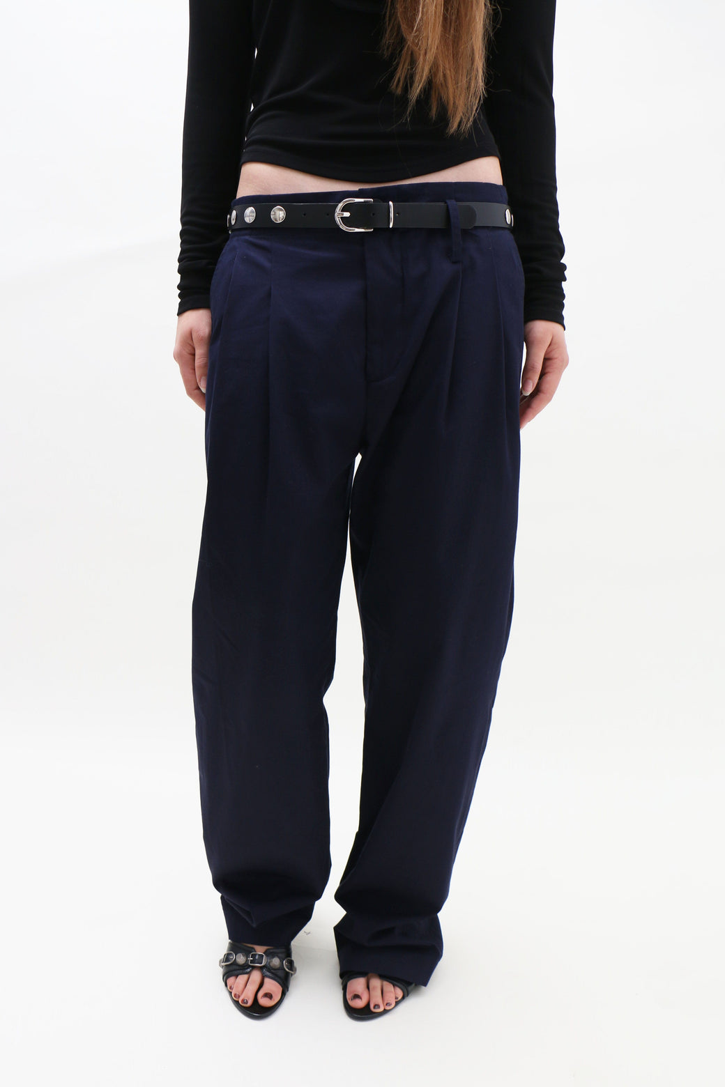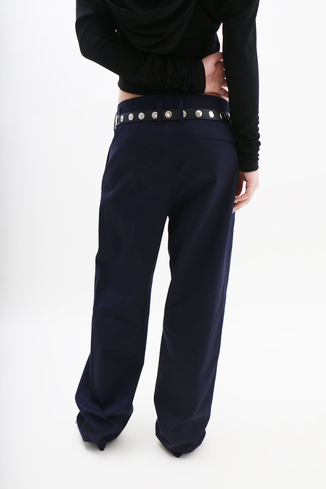 Mid-rise straight-leg trousers in navy cotton, designed with front pleats and side welt pockets. Finished with a zip-front closure and button fastening. Unlined. Unisex sizing.