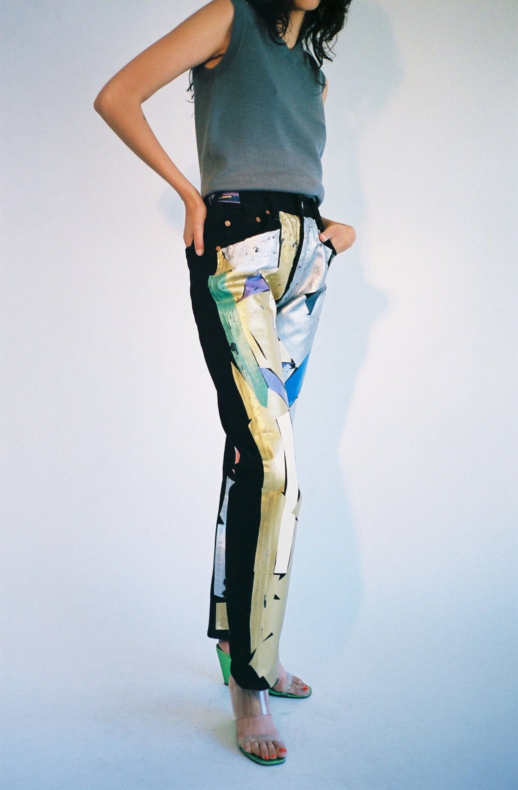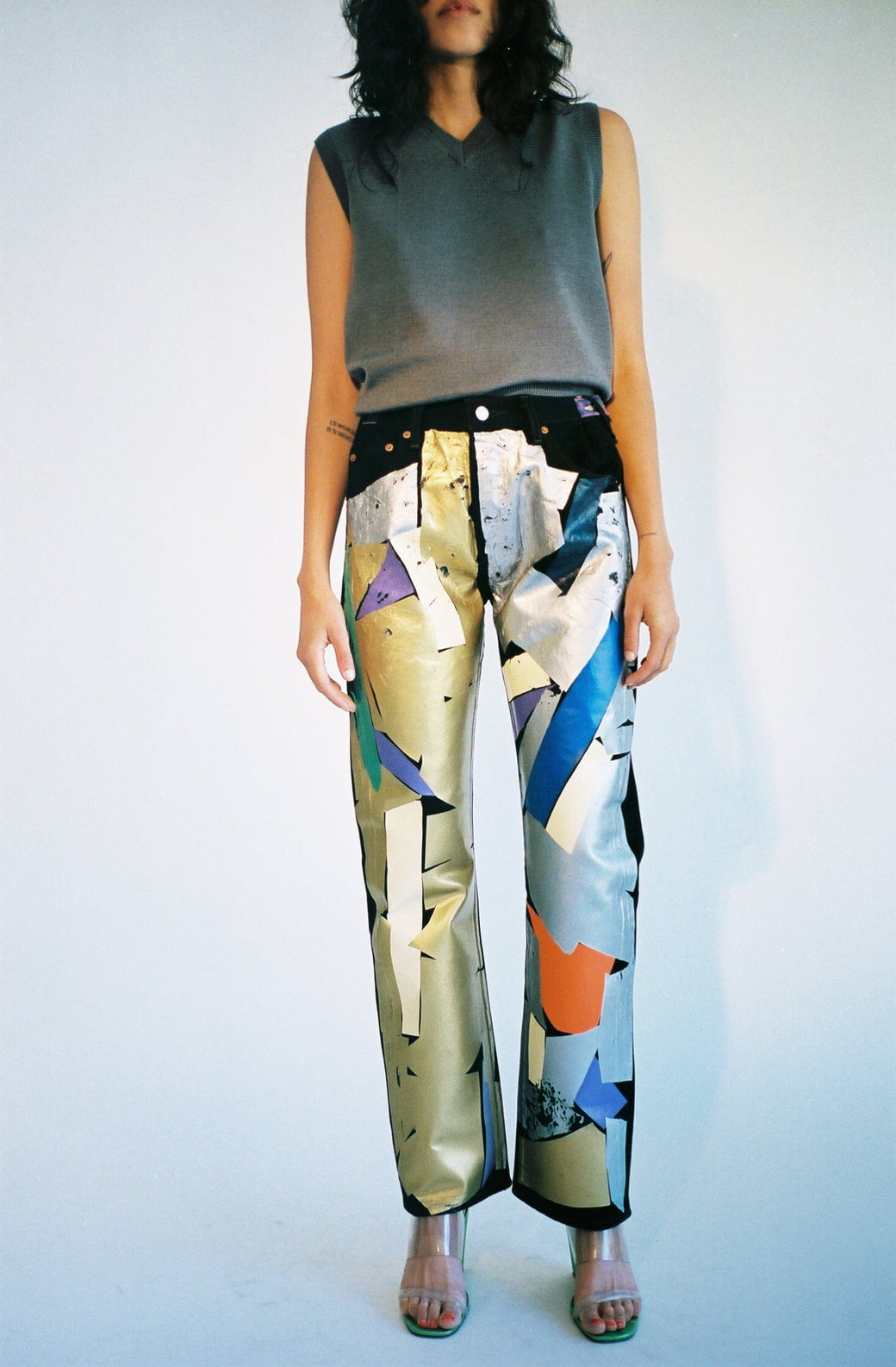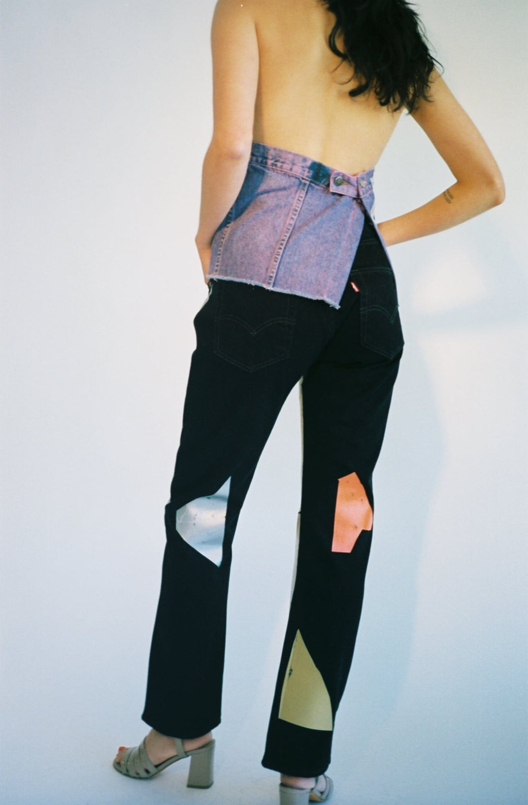 Re-worked denim in black with a peeling paint print. Mid rise with a straight-leg silhouette. Five-pocket style, zip fly with a button closure. Worn with the Thunder Halter and Deep Fog Apollo Vest.