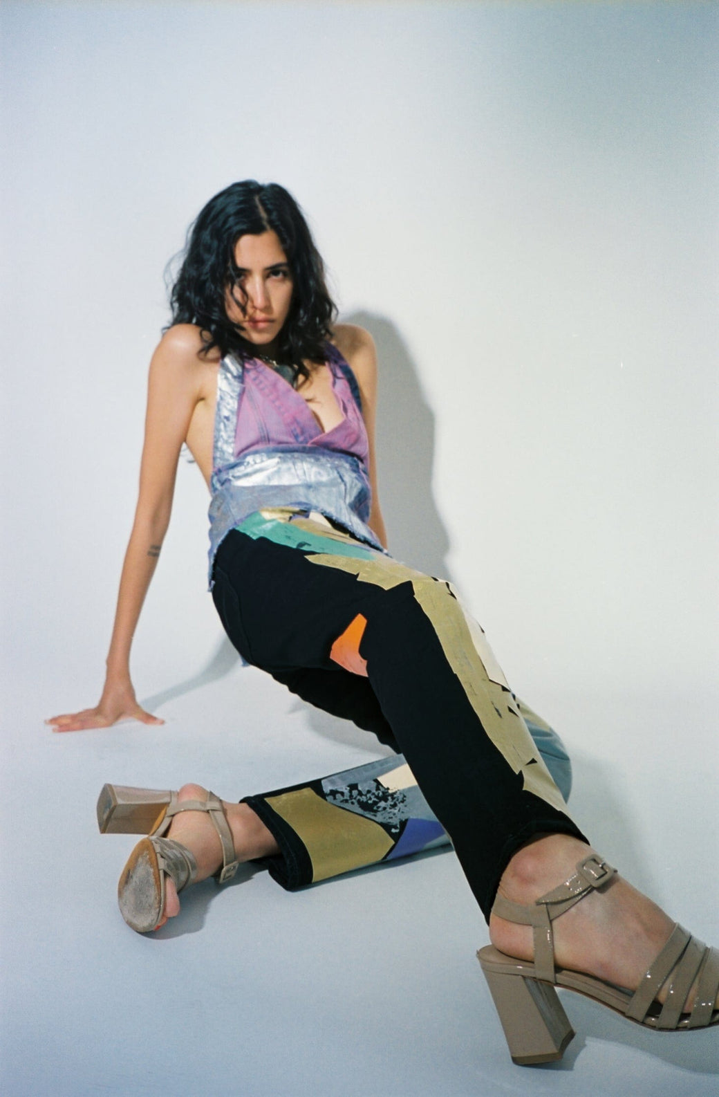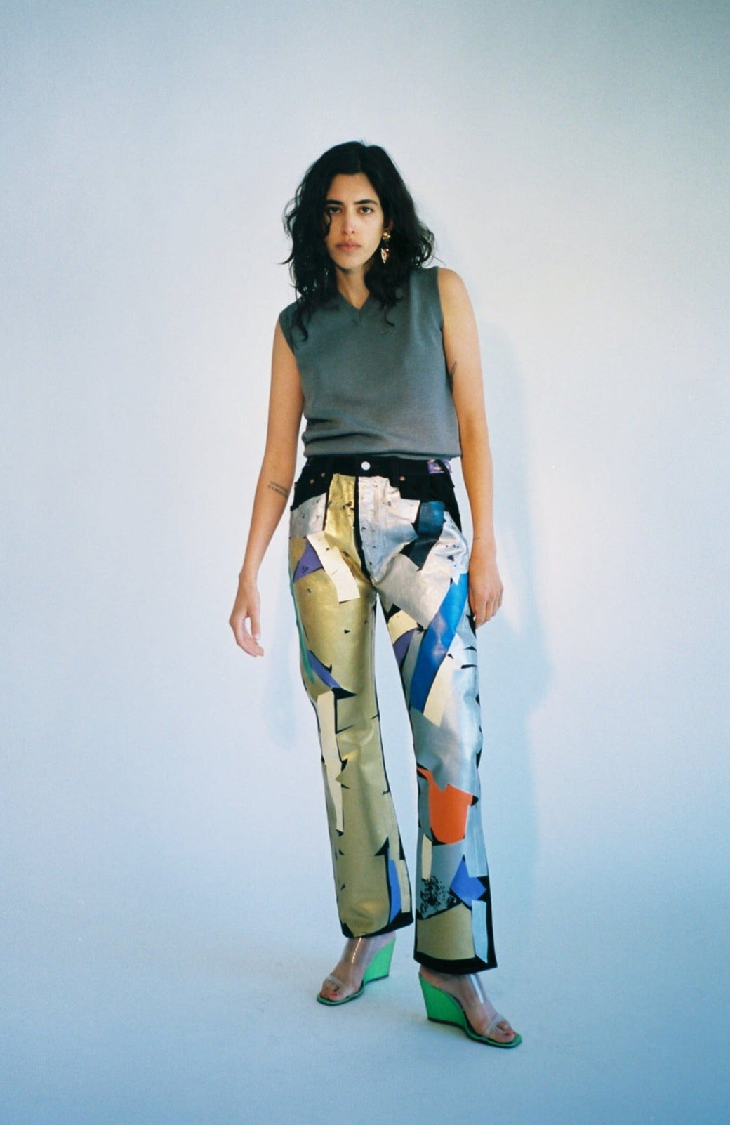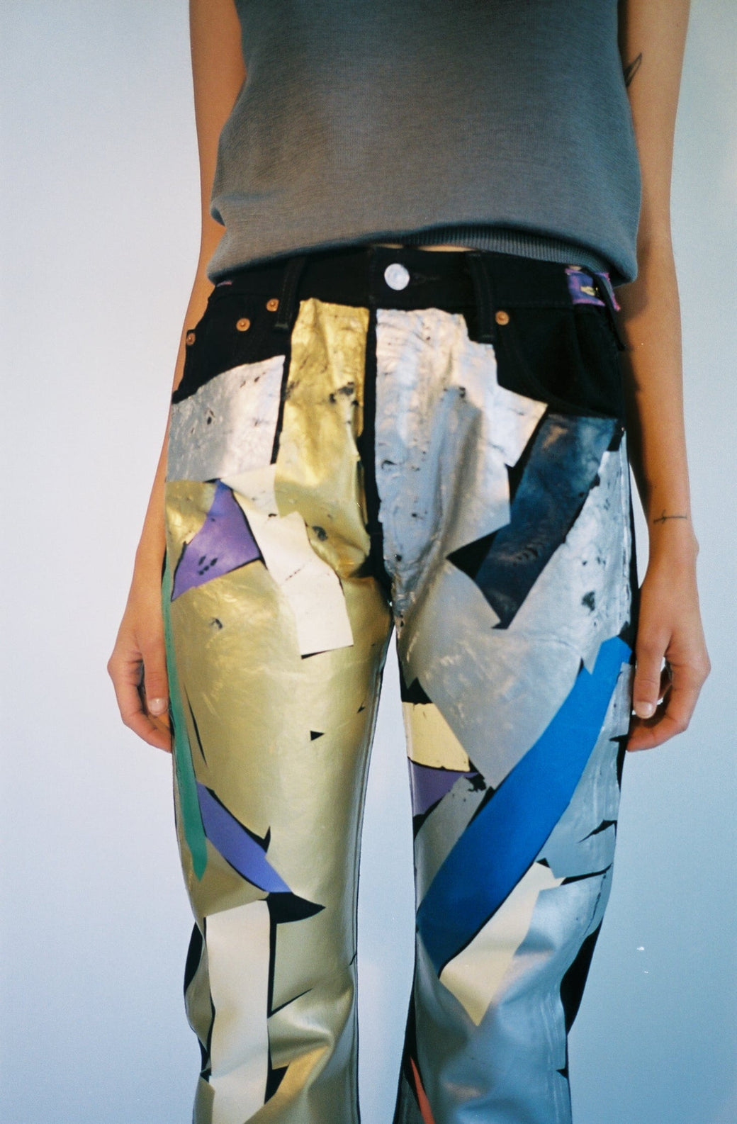 Re-worked denim in black with a peeling paint print. Mid rise with a straight-leg silhouette. Five-pocket style, zip fly with a button closure. Worn with the Thunder Halter and Deep Fog Apollo Vest.