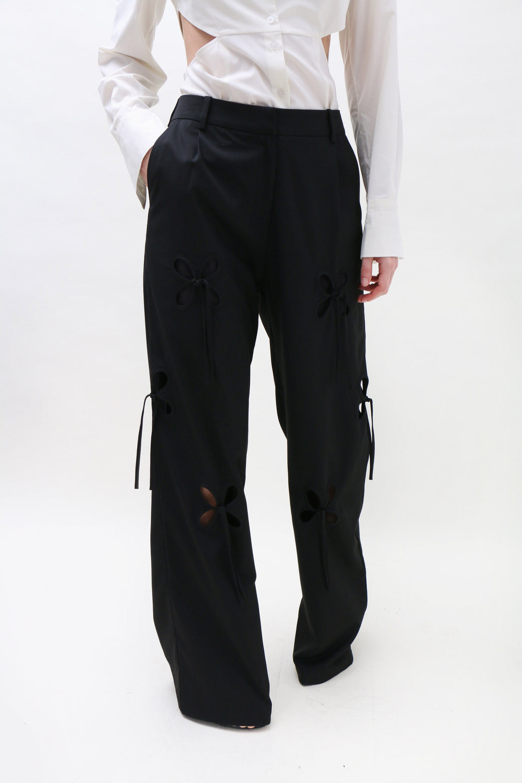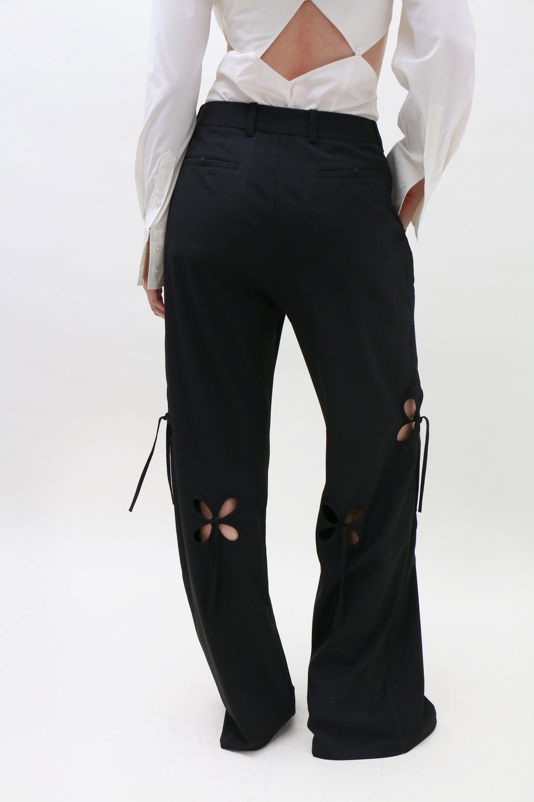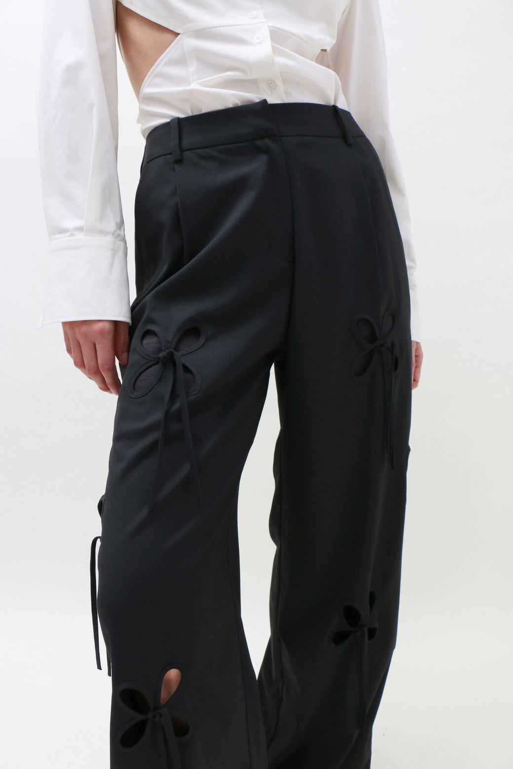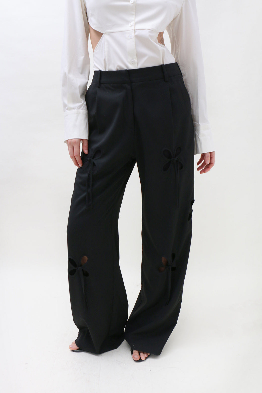 Black wool suiting trousers in silk with center-front pleats, featuring signature J.Kim petal-shaped flower cutouts and functional pockets.