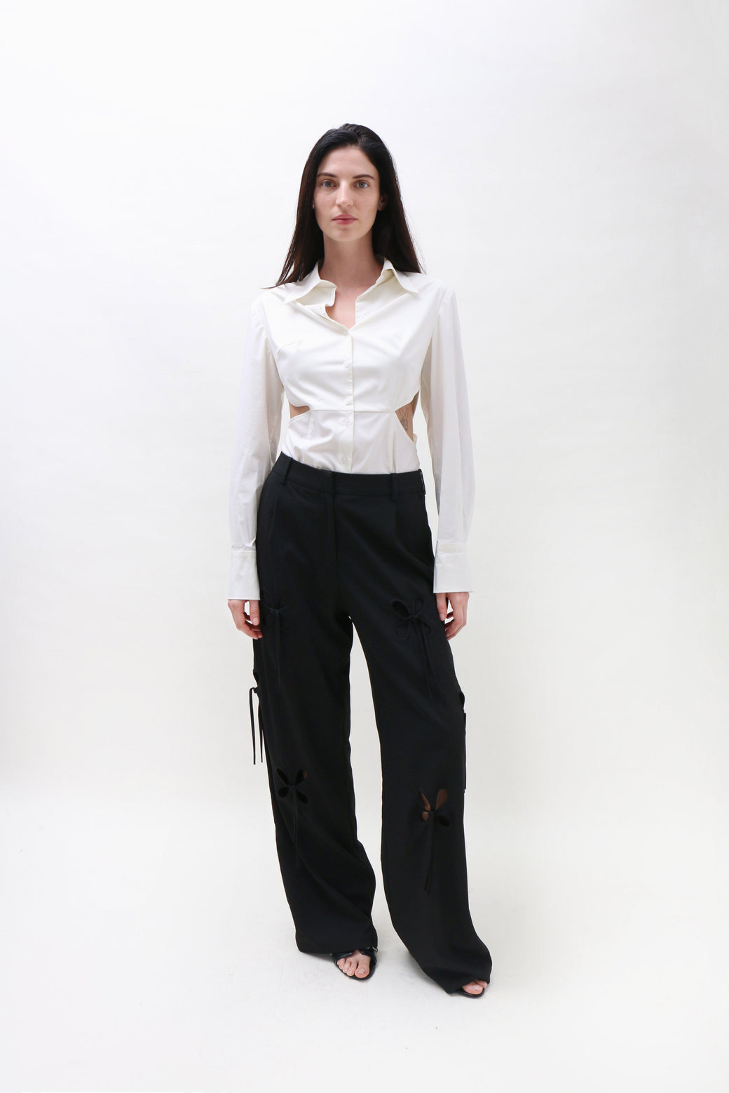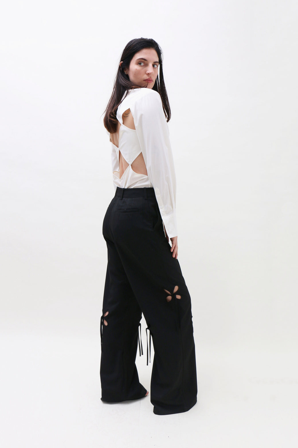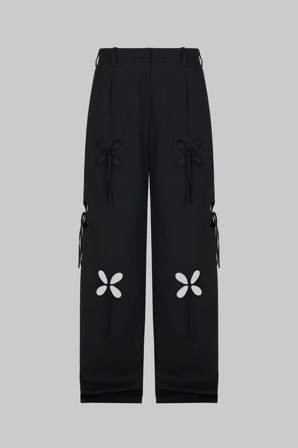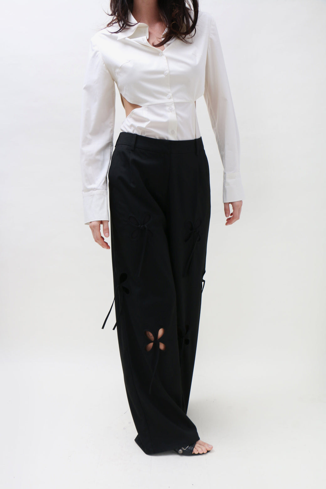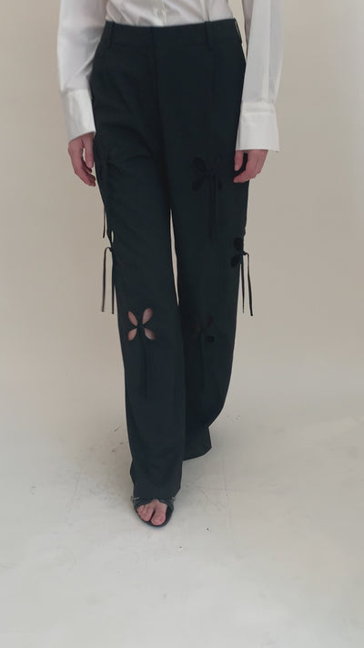 Black wool suiting trousers in silk with center-front pleats, featuring signature J.Kim petal-shaped flower cutouts and functional pockets.