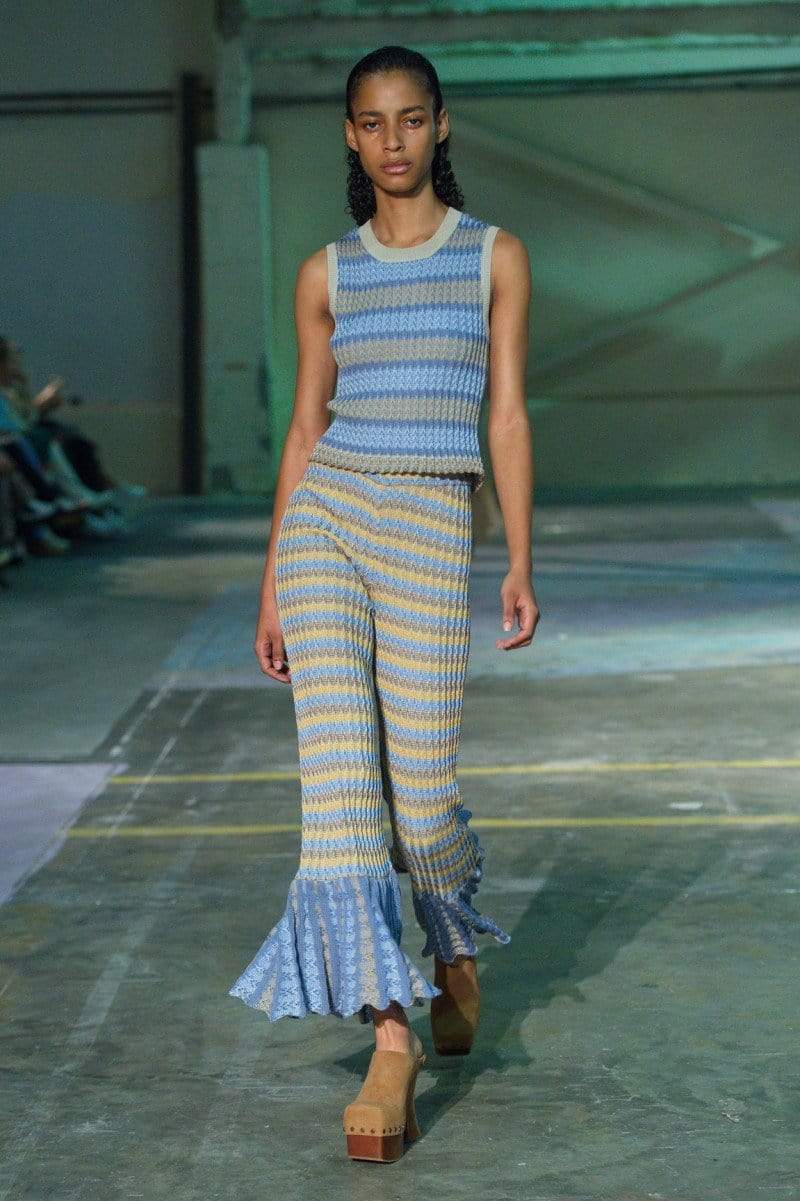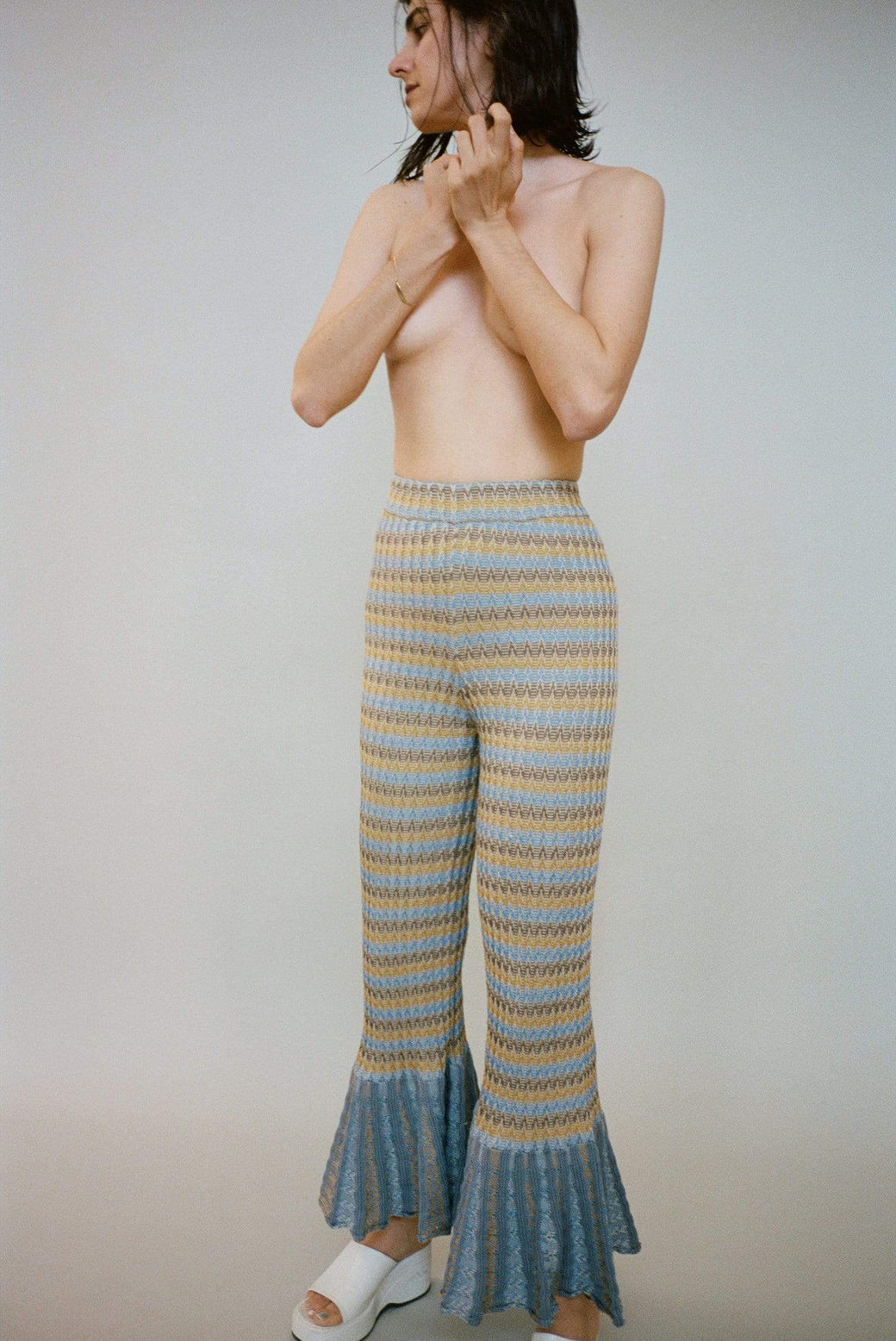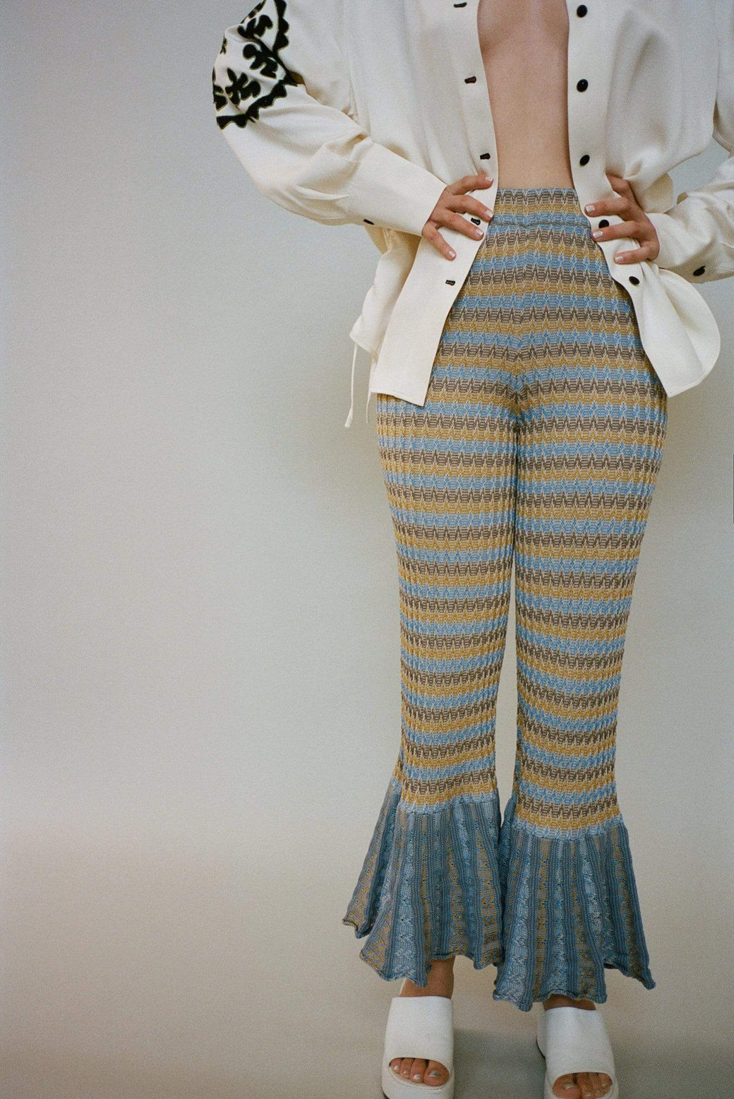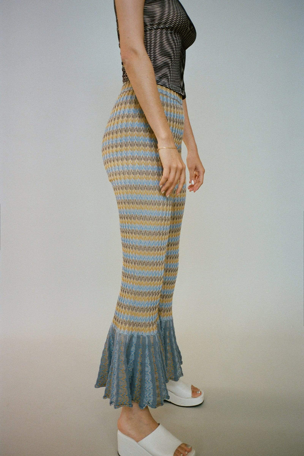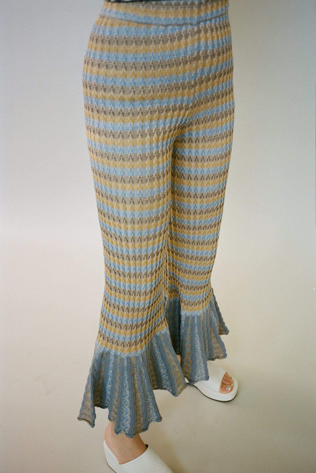A slim fit knit pant featuring a wide flare knit on the cross-grain.
