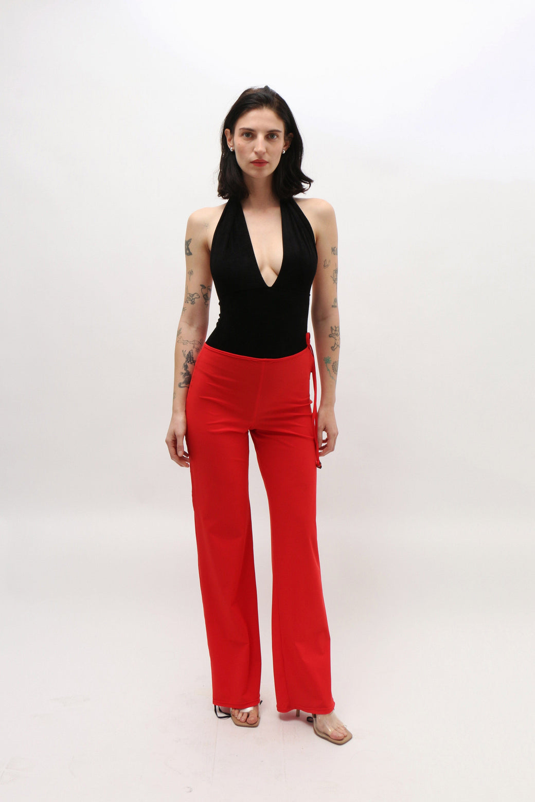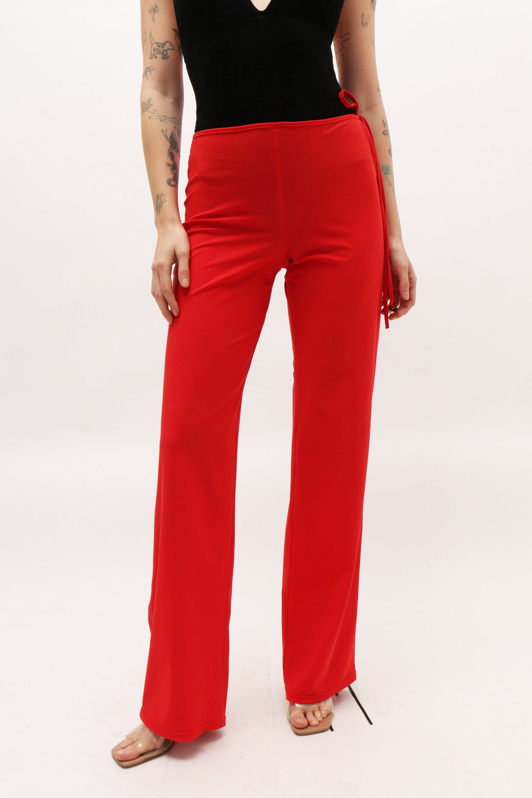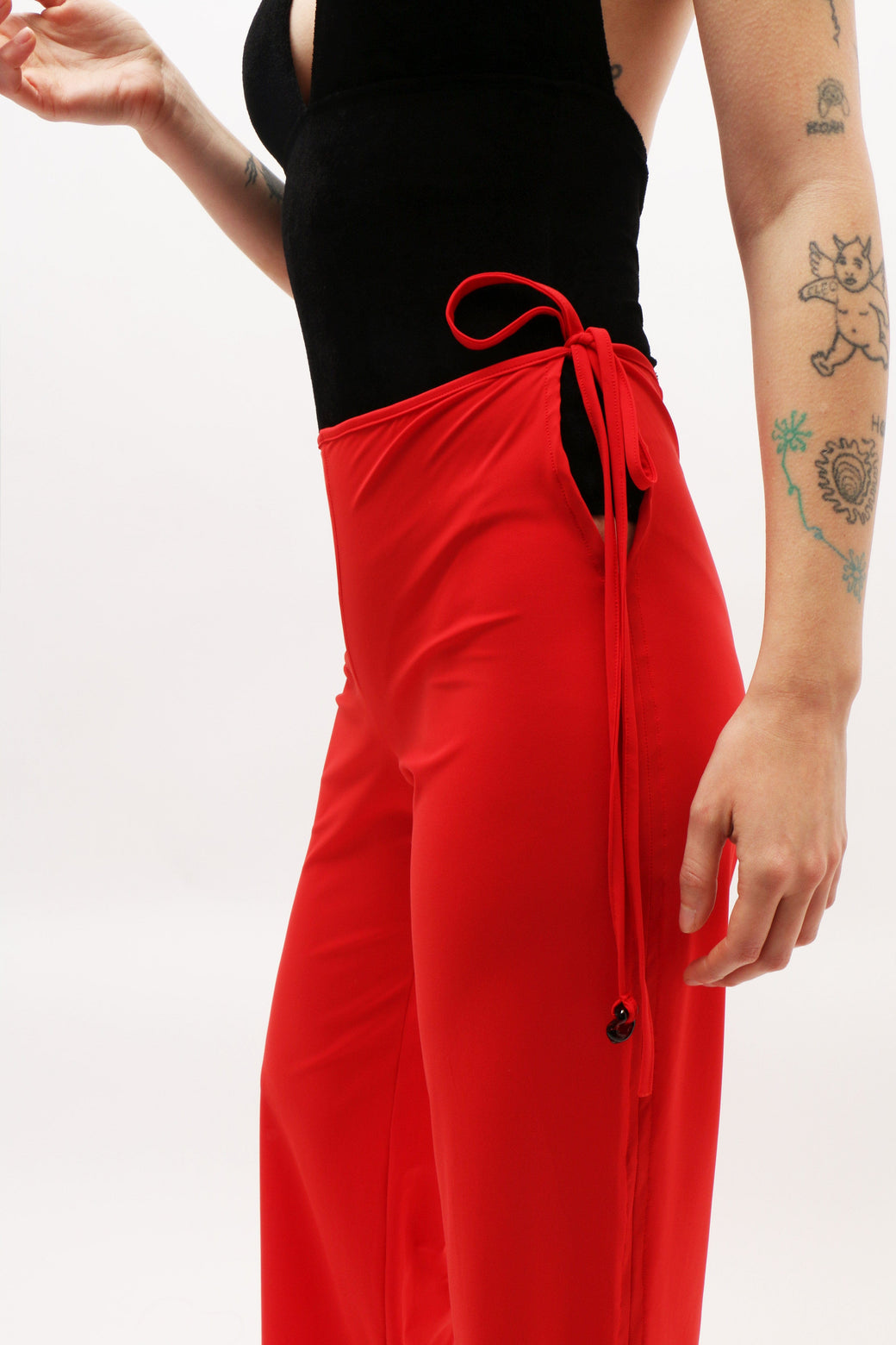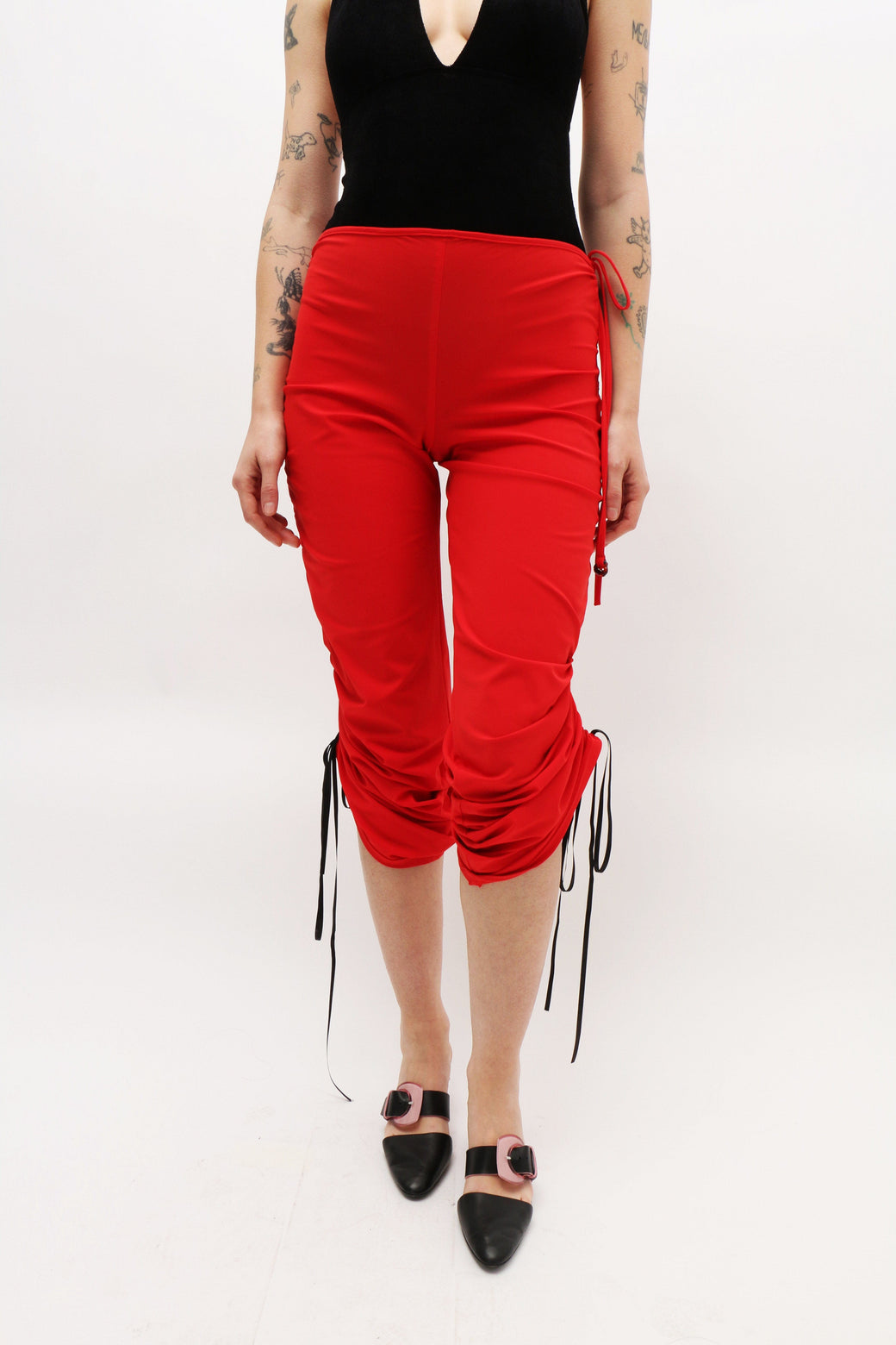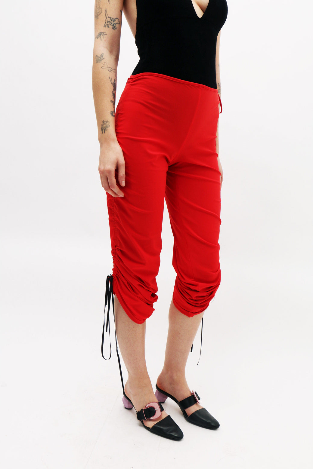 Red bootleg pants with gathered ribbon along the bottom hem and adjustable drawstrings on the sides for a customizable fit. Featuring unique borosilicate glass buttons. Made from stretch jersey deadstock fabric from Lucille Thièvre's French fashion house.