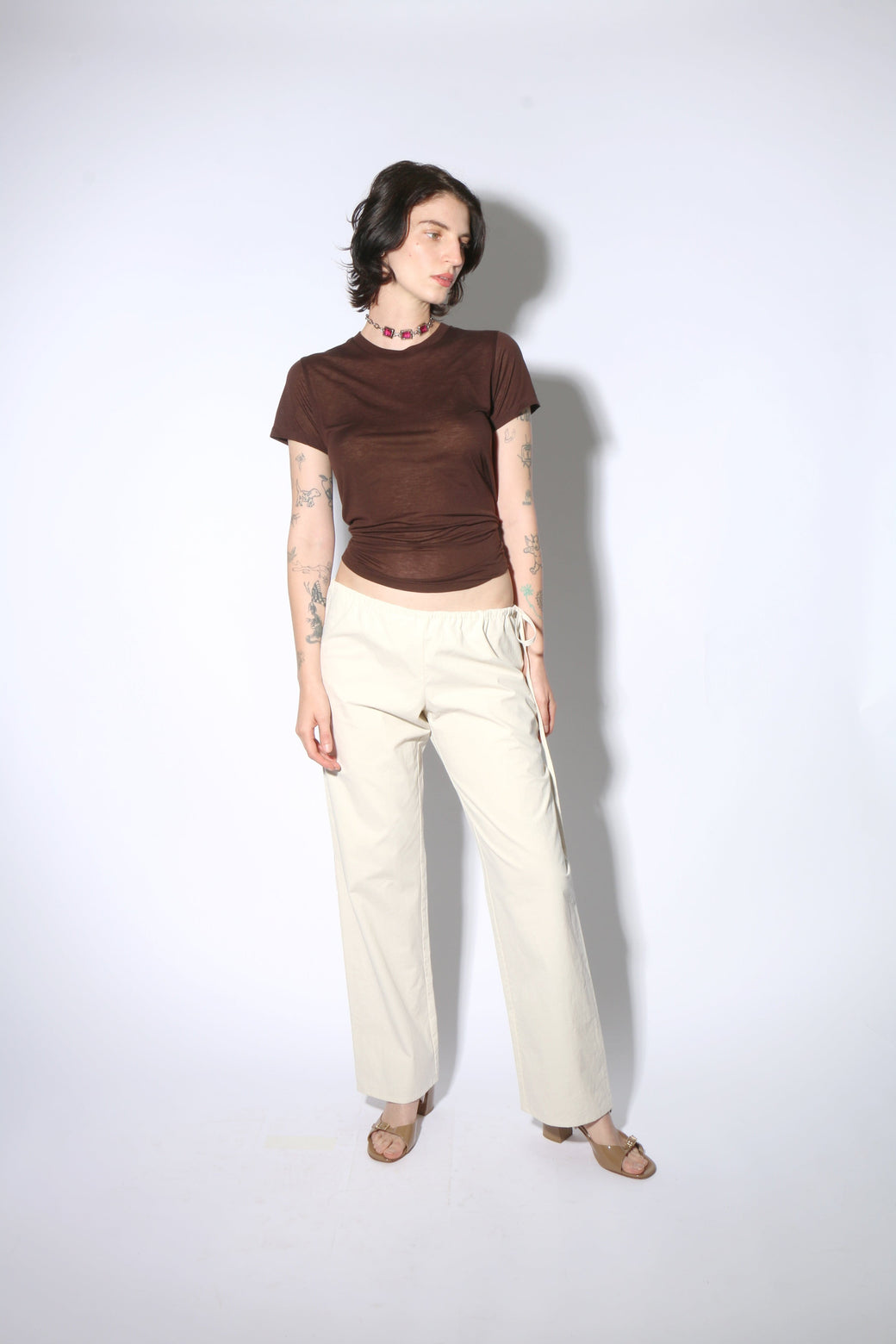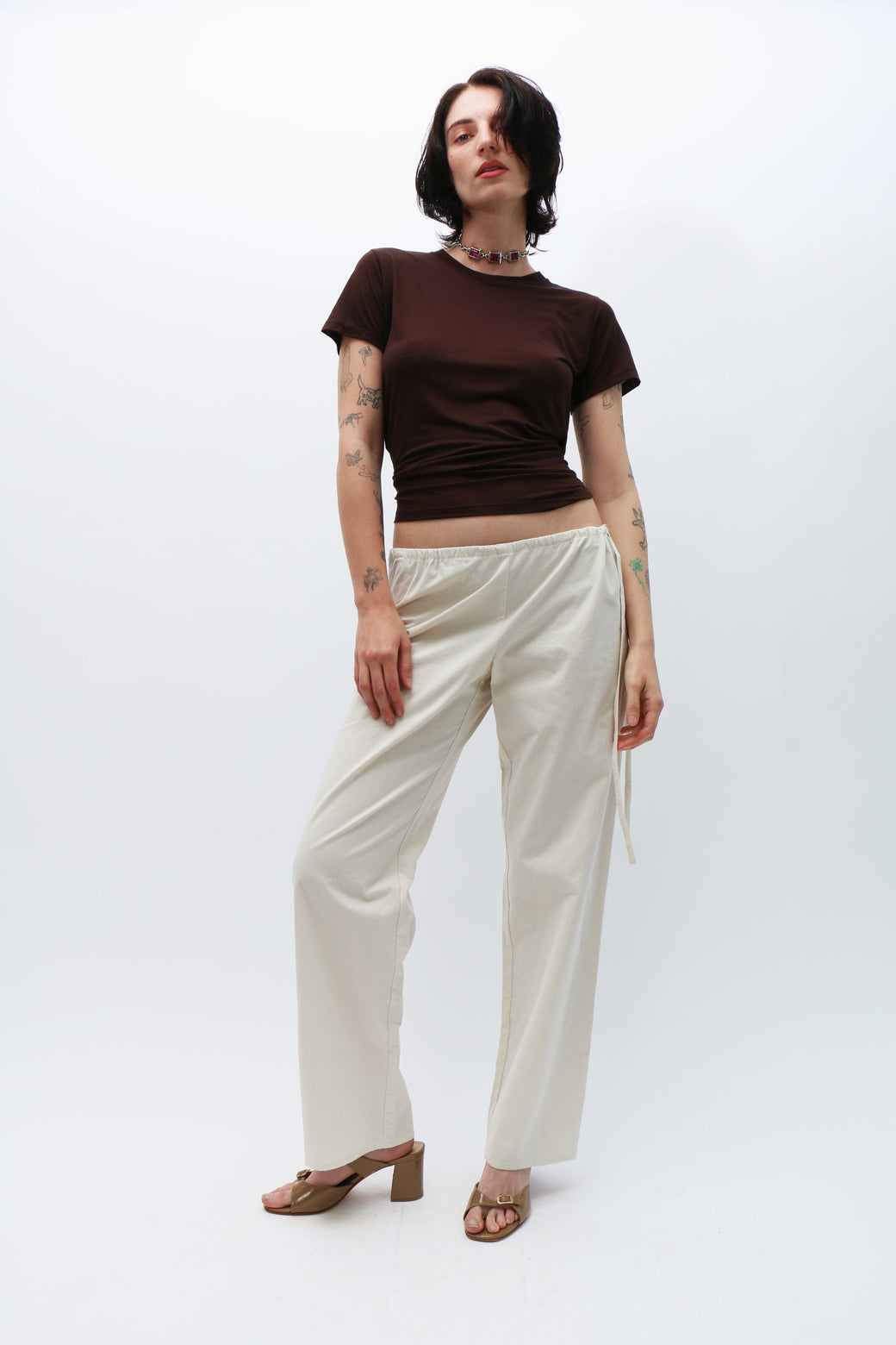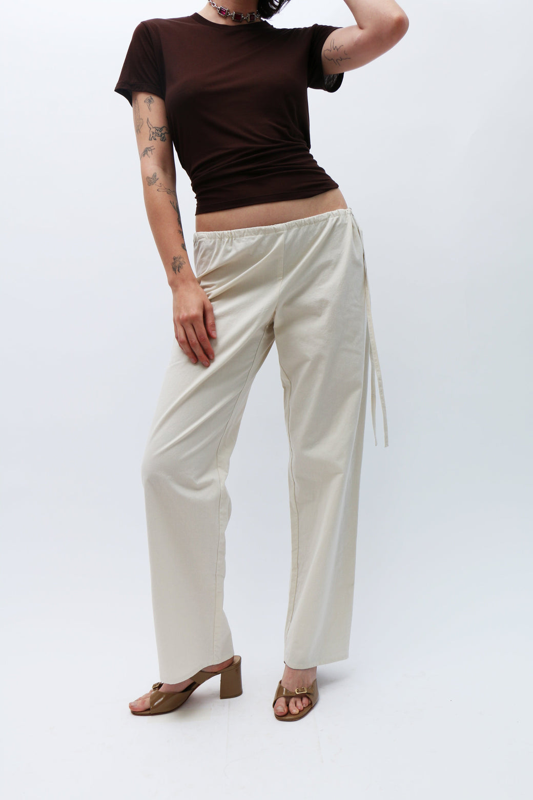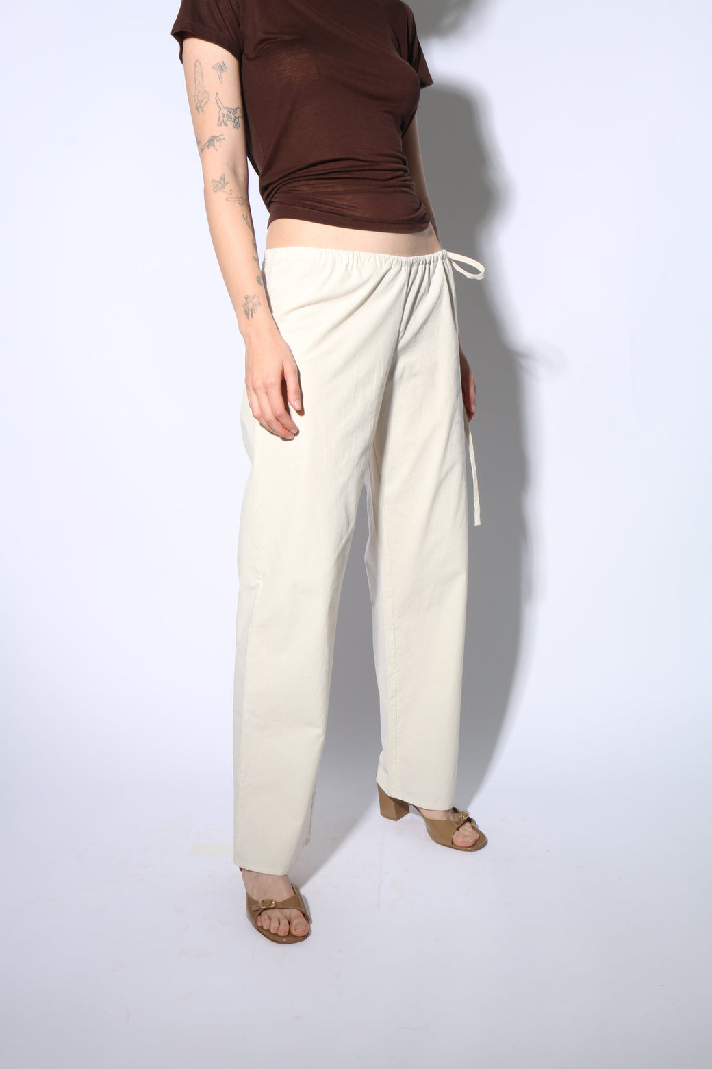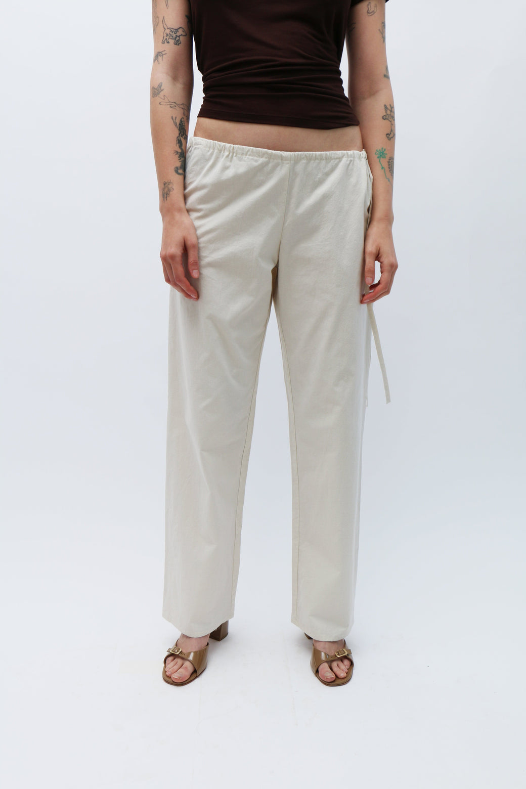 Off white cotton poplin pants with fully adjustable tie waist. Low-rise fit, enhanced by a gathered waist. The pants are adorned with a long self-tie bow along the side.