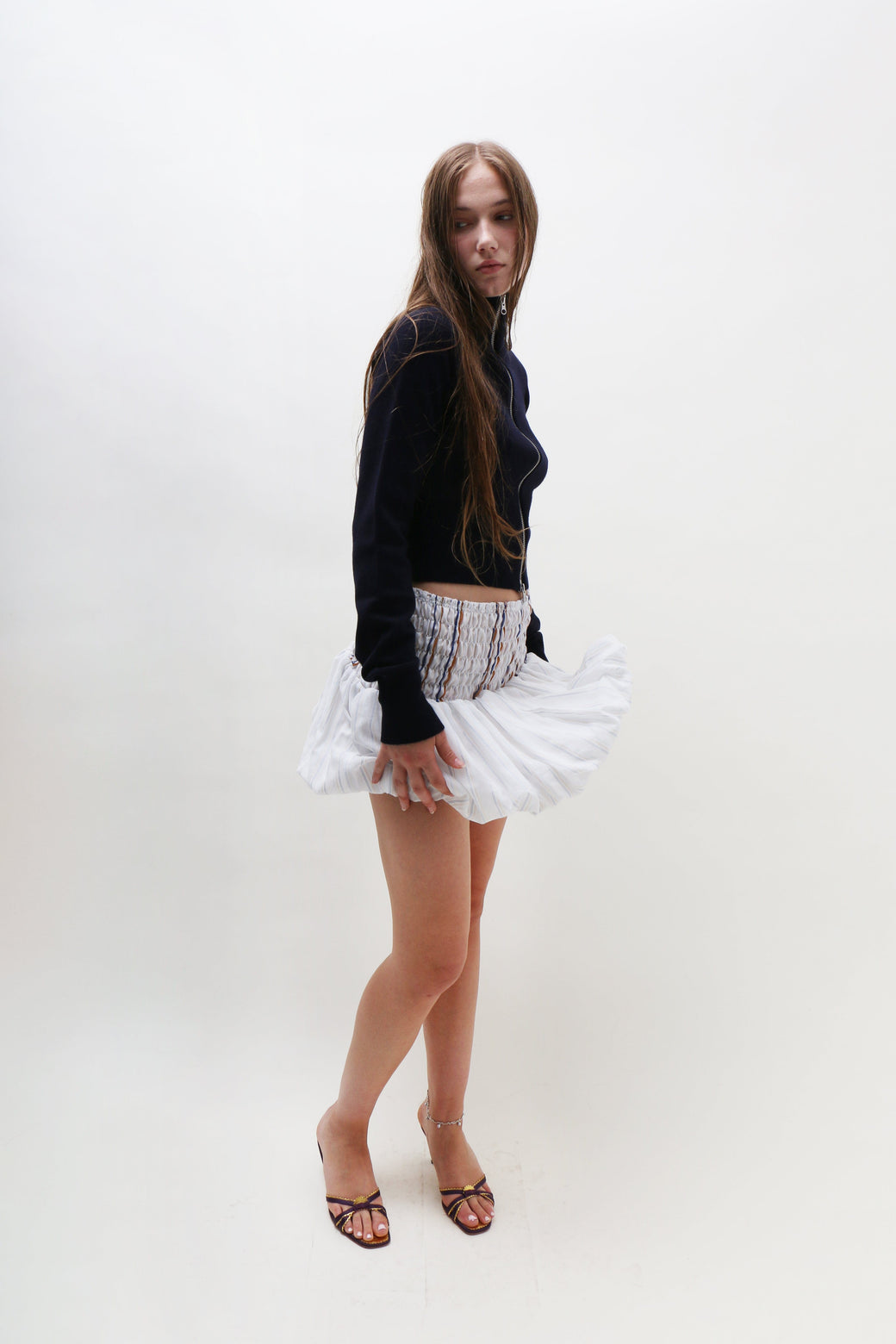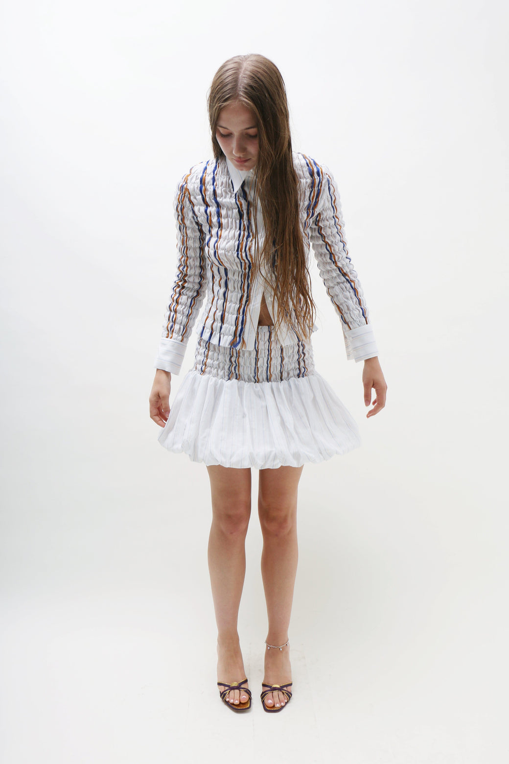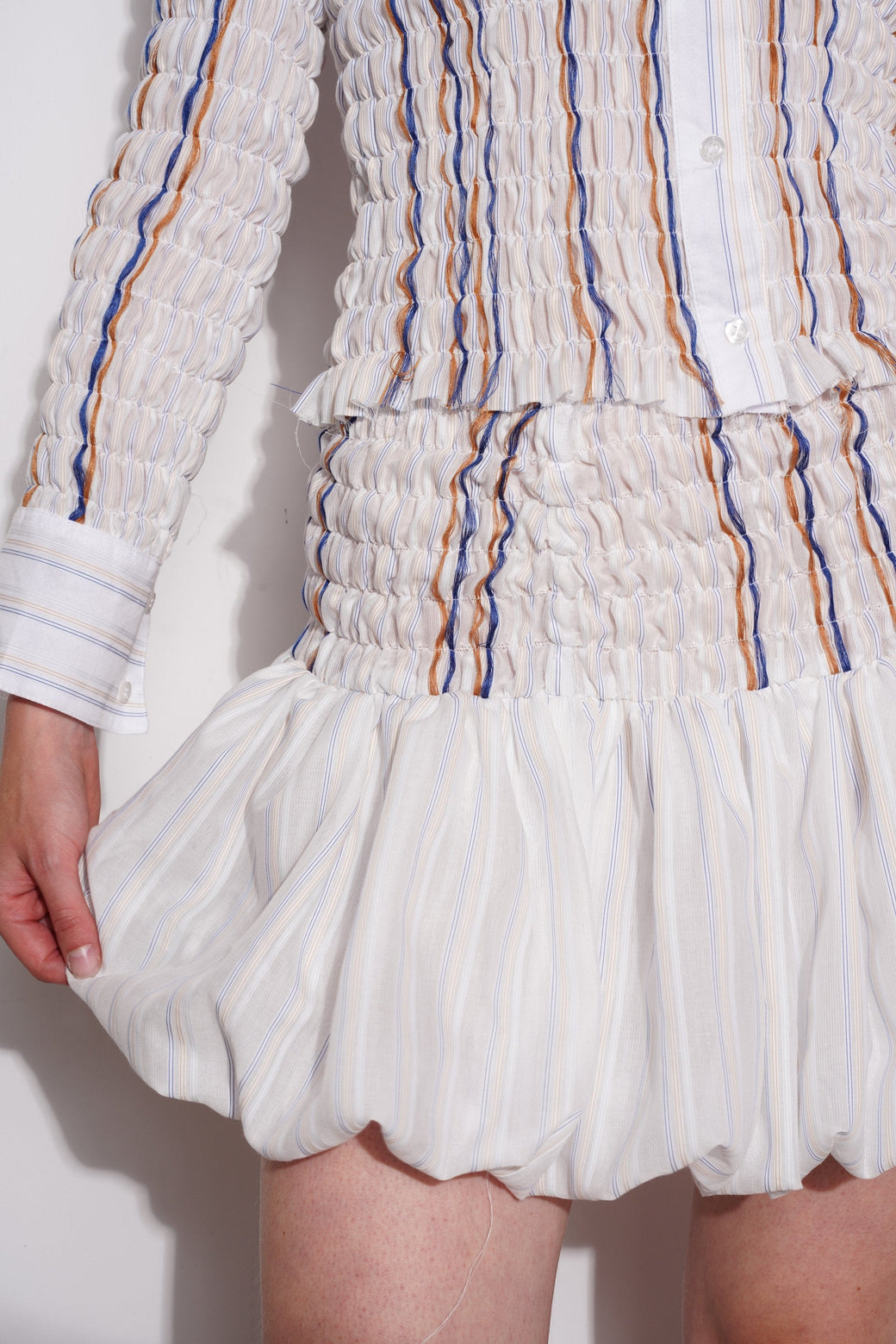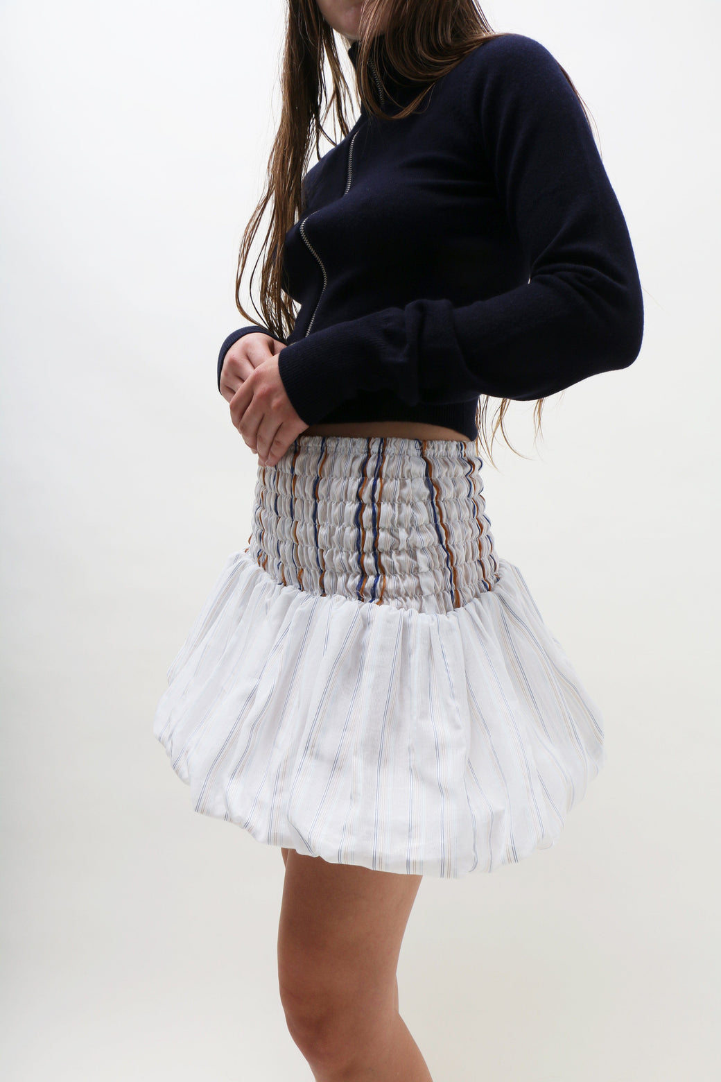 A Maimoun Exclusive, Smocked skirt in lightweight striped cotton, with woven yarns running softly throughout. A voluminous bubble hem adds sculptural shape, held in tension by the fabric’s generous 70% stretch. Each size is designed to span two, adapting gently to the body.