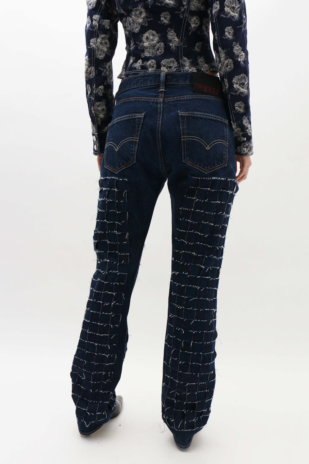 Blue denim jeans, reimagined through an intricate weaving process. Each pair is carefully deconstructed and handwoven back together, breathing new life into the original fabric while preserving the essence of the denim.