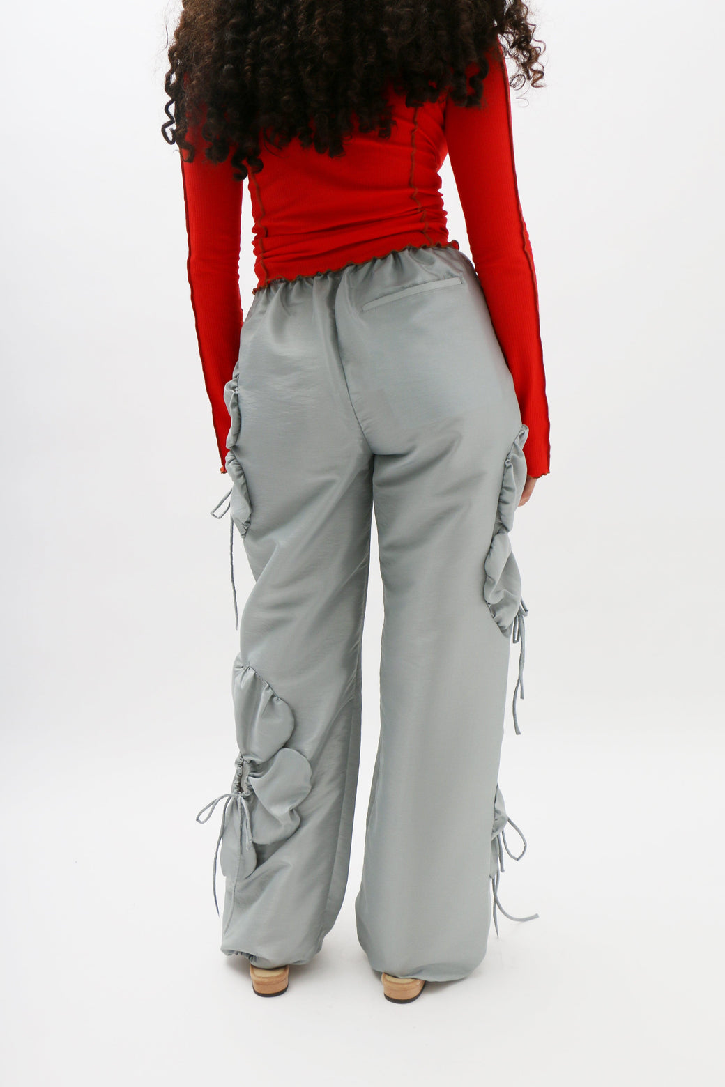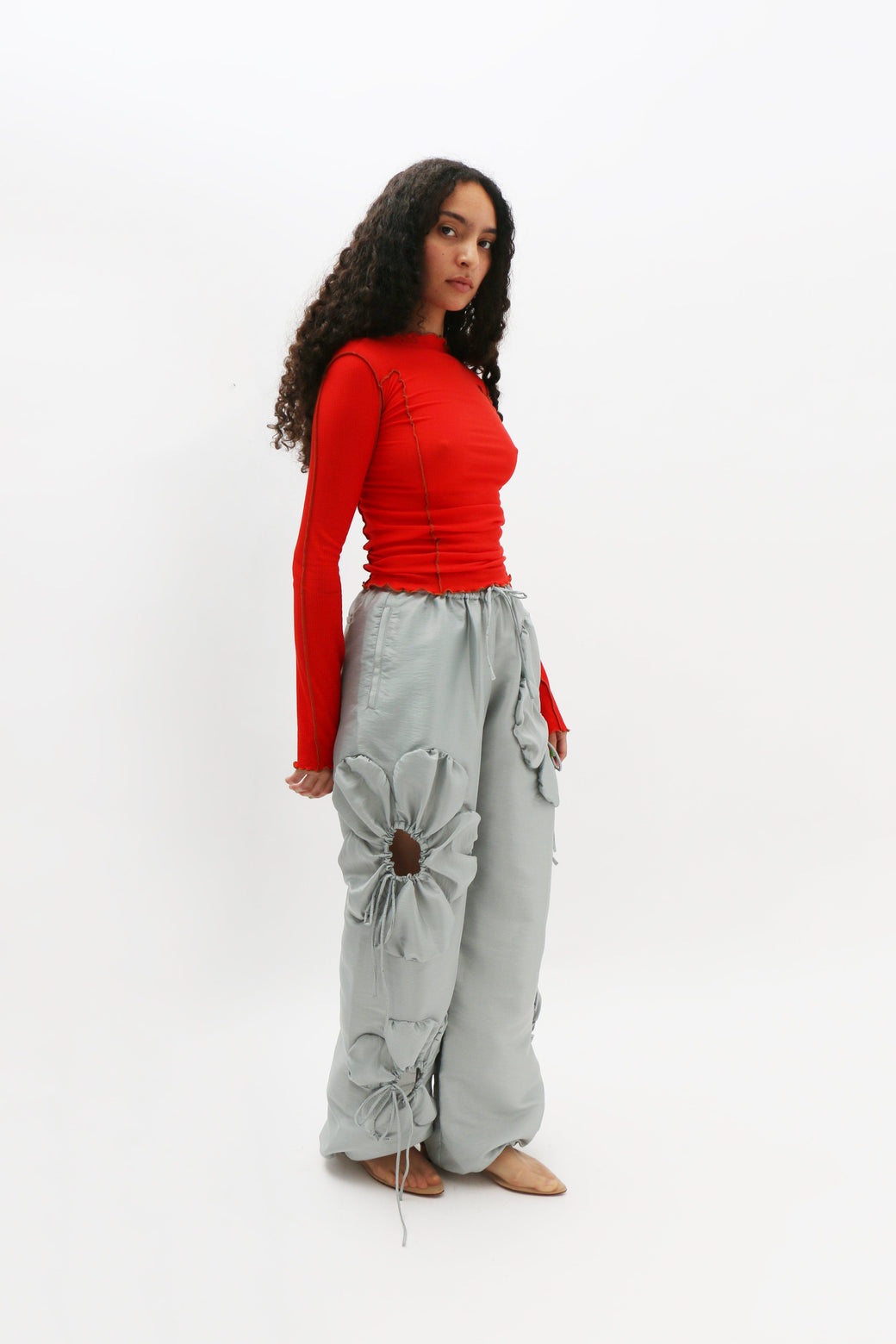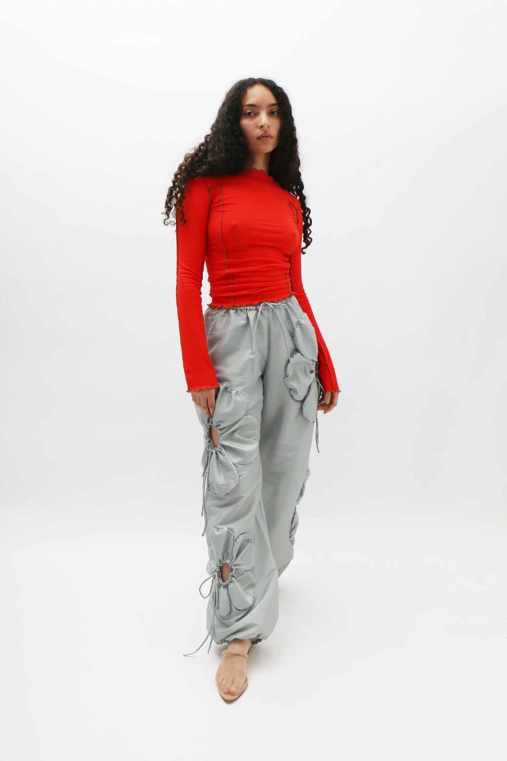 Relaxed-fit nylon taffeta pants featuring delicate floral appliqués with cutouts and self-tie fastenings, adding texture and a romantic edge throughout. Designed with an elasticized drawstring waistband and cuffs, these pants are finished with two side pockets.