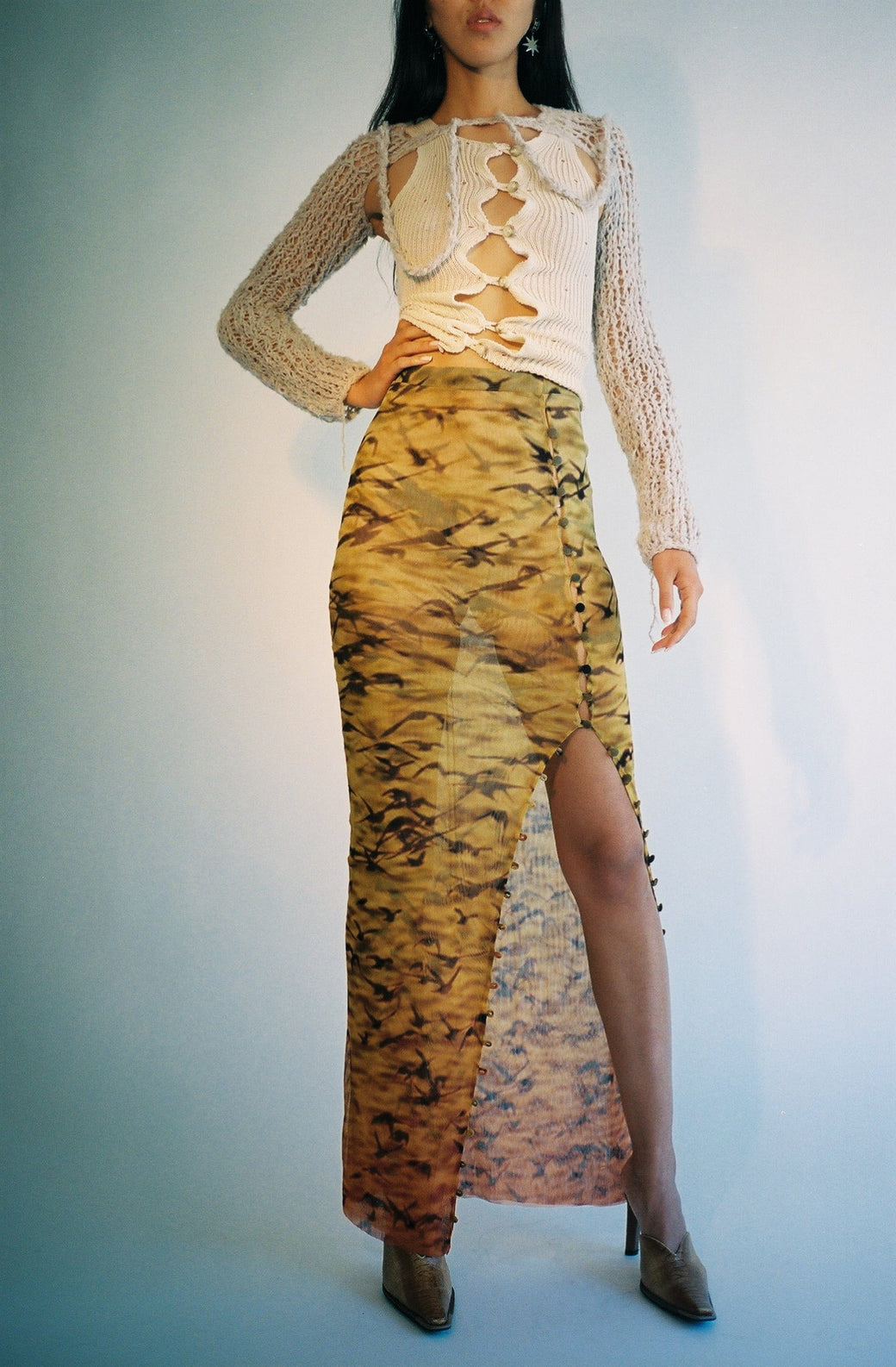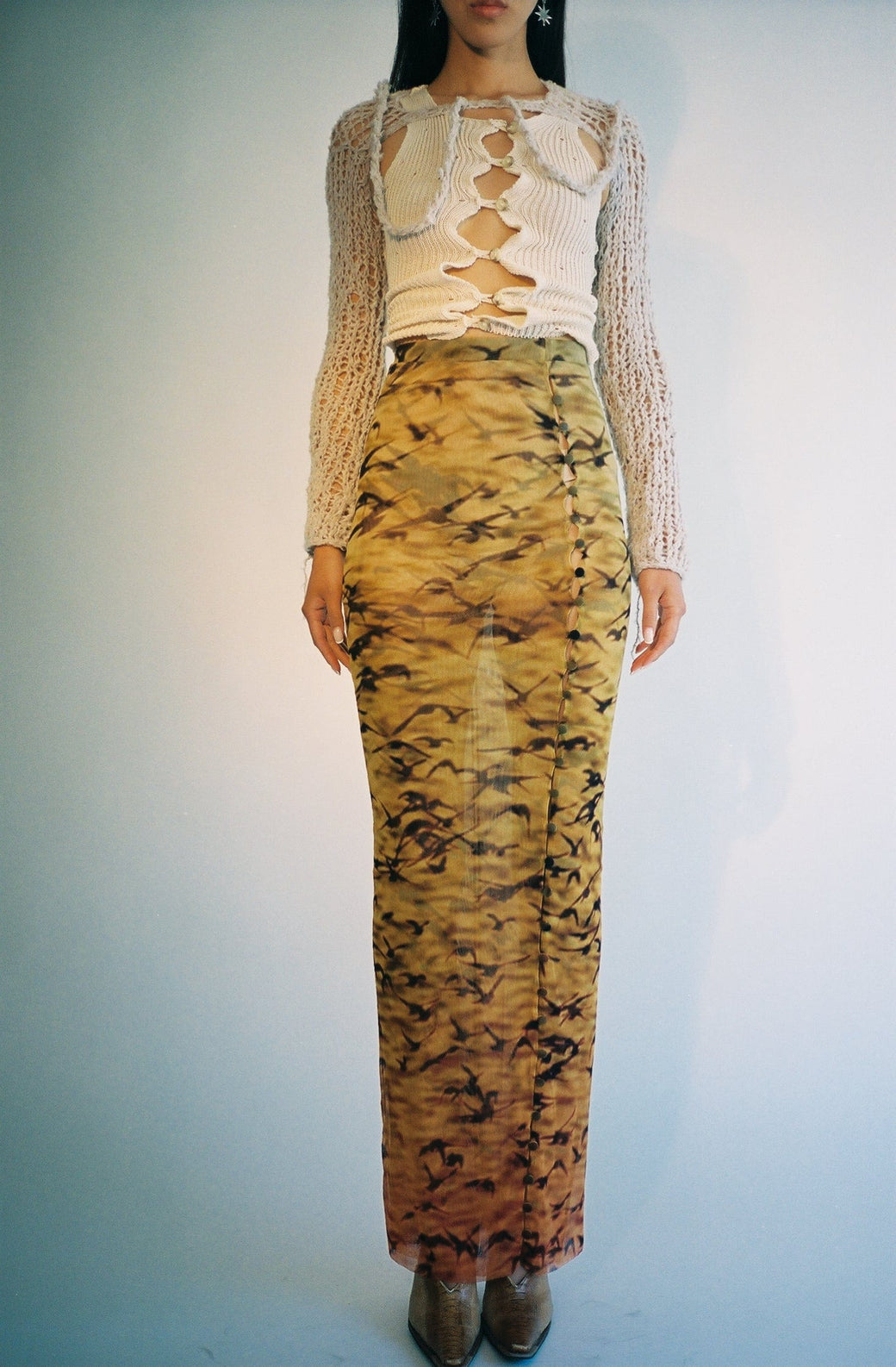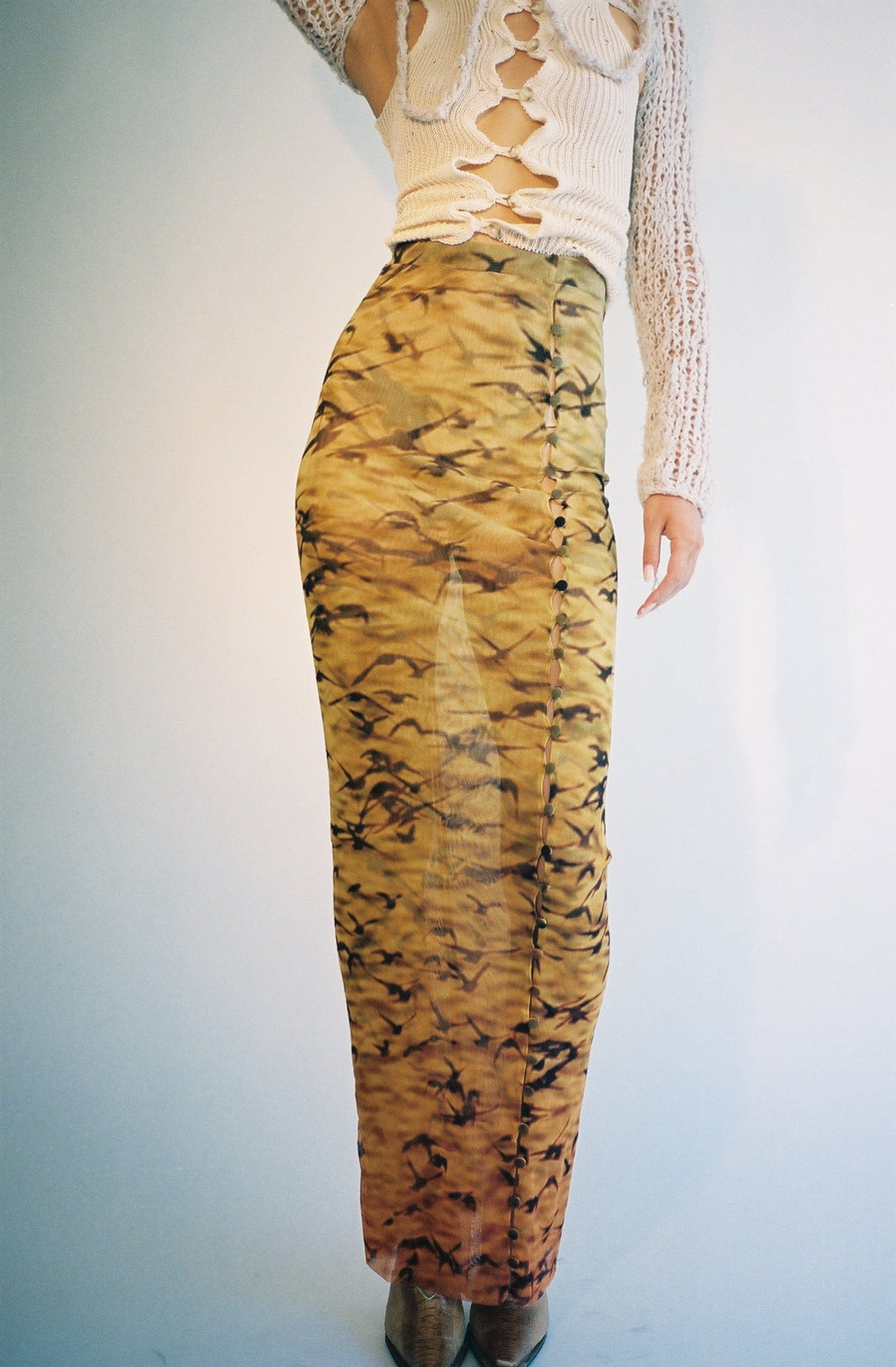 Long double mesh skirt with buttons throughout. Sheer stretch Italian mesh with original print of Sparrows at Sunset. Semi-sheer. Each piece is cut by hand, so the placement of the print is different and unique for each skirt. Worn with the matching Sunset Sparrows Mesh Button Down Duster Dress and Moth Hole Vortex Tank.