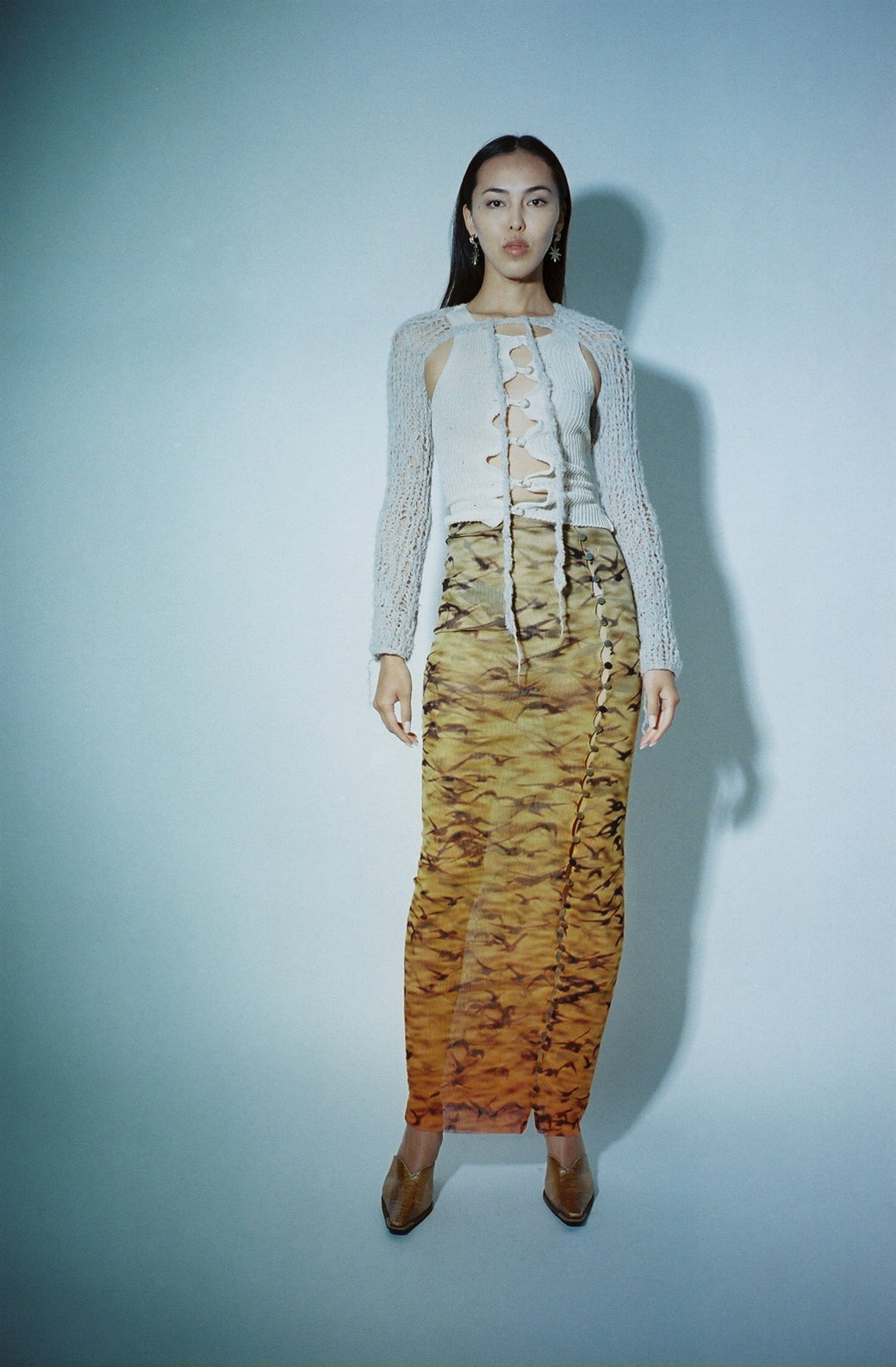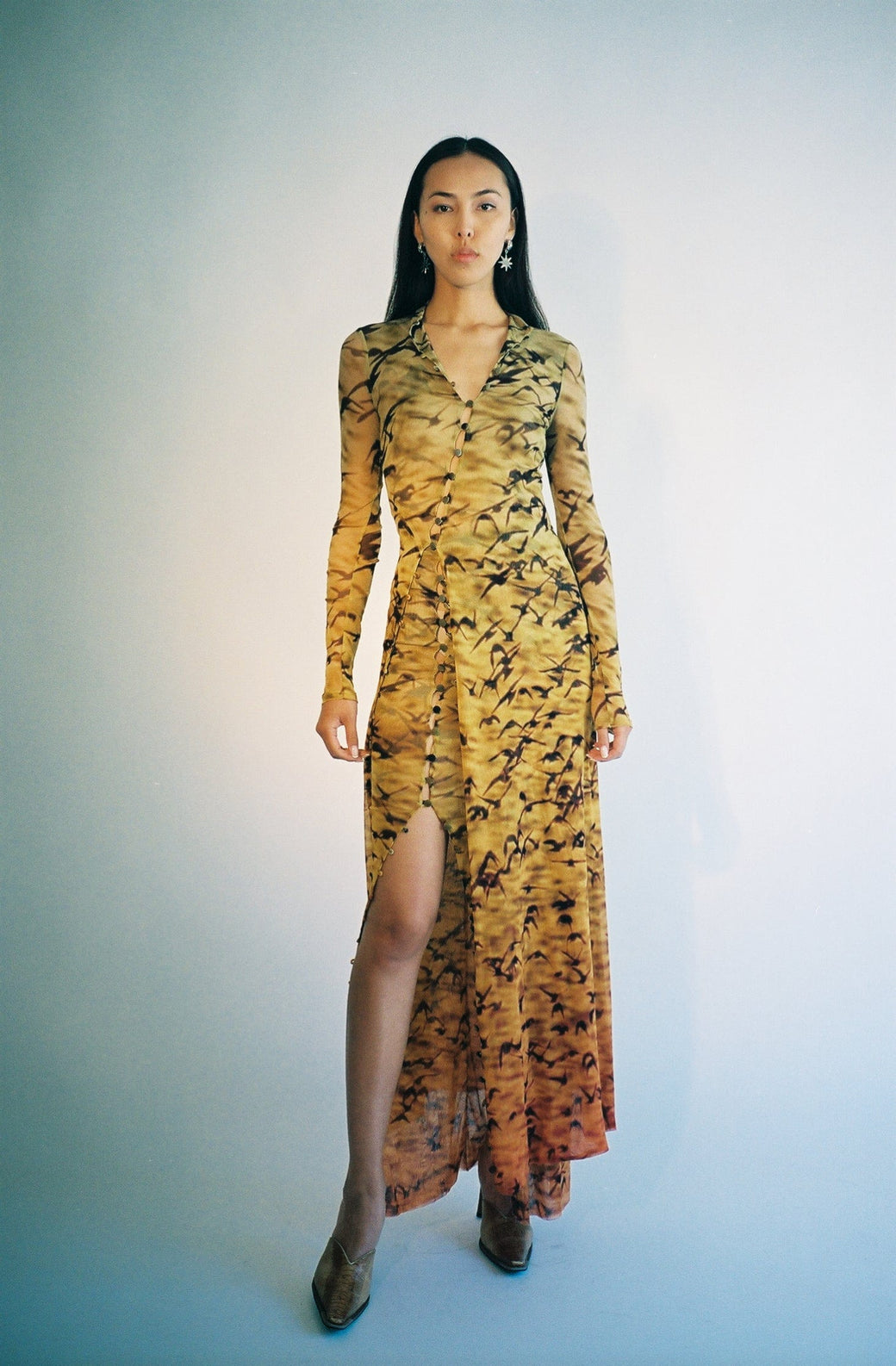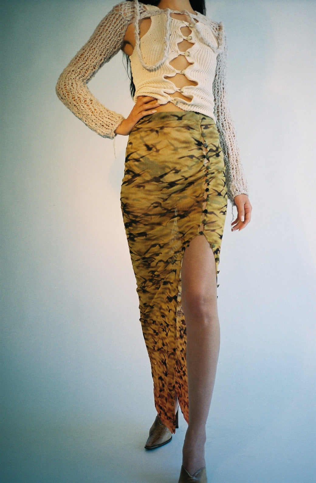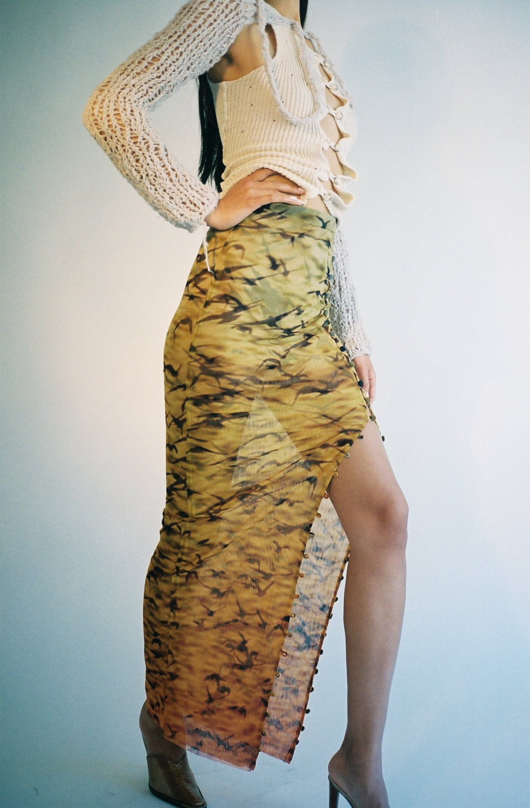 Long double mesh skirt with buttons throughout. Sheer stretch Italian mesh with original print of Sparrows at Sunset. Semi-sheer. Each piece is cut by hand, so the placement of the print is different and unique for each skirt. Worn with the matching Sunset Sparrows Mesh Button Down Duster Dress and Moth Hole Vortex Tank.