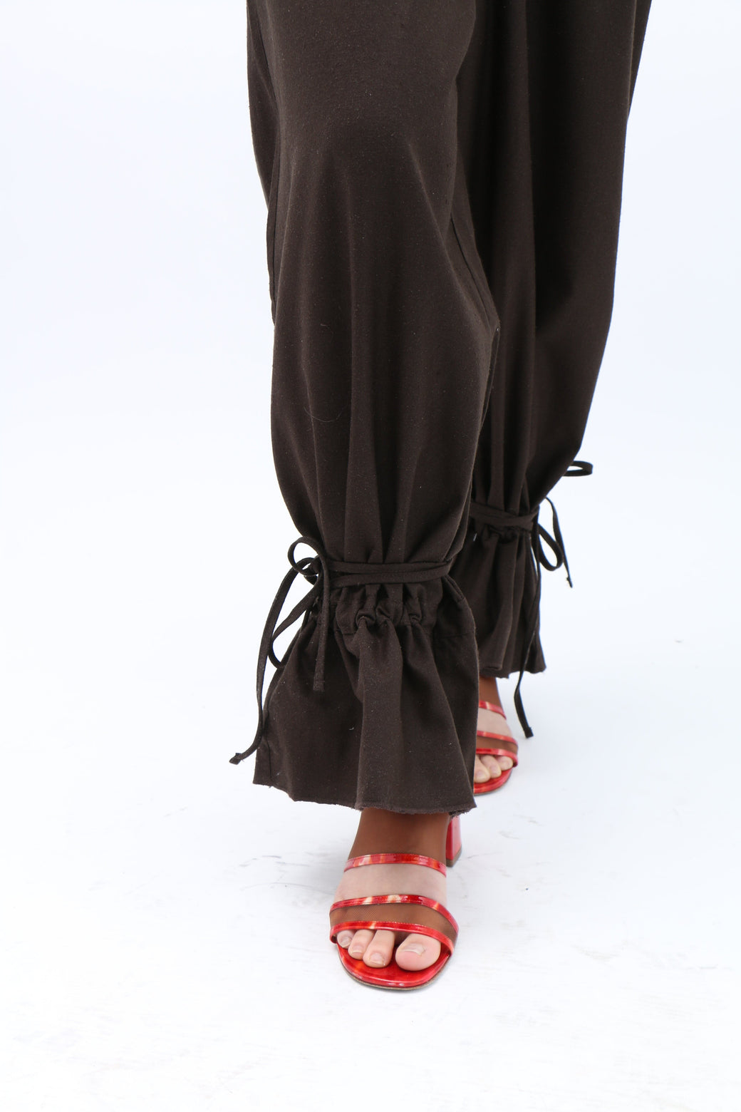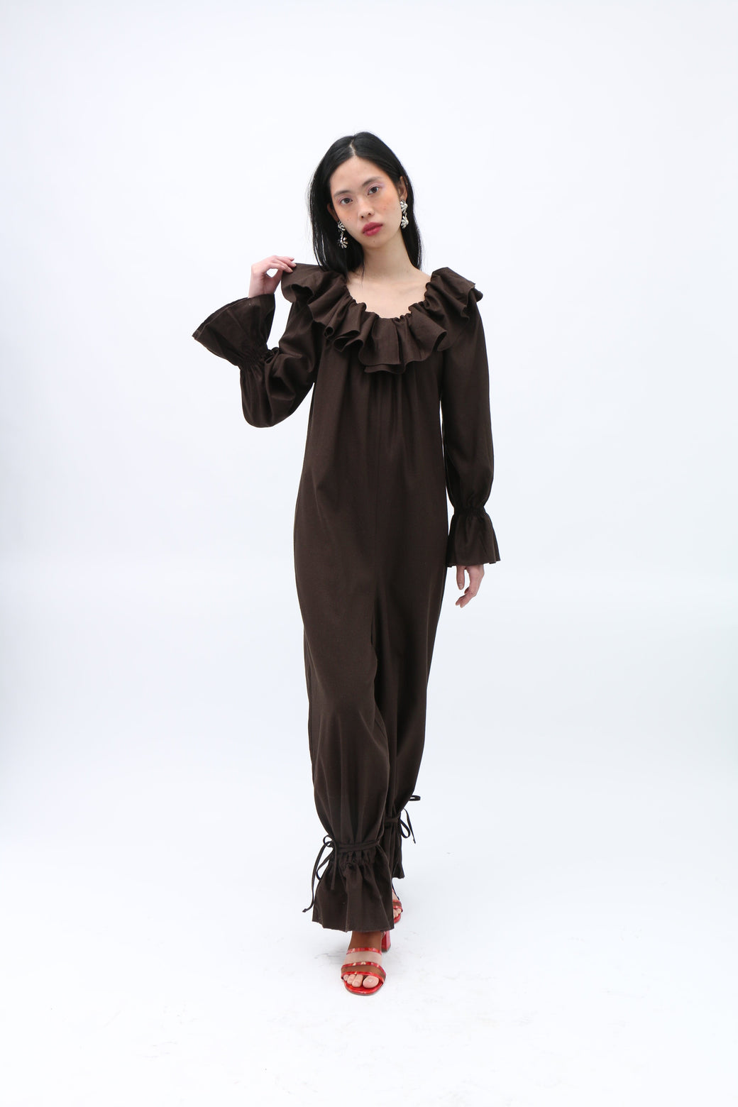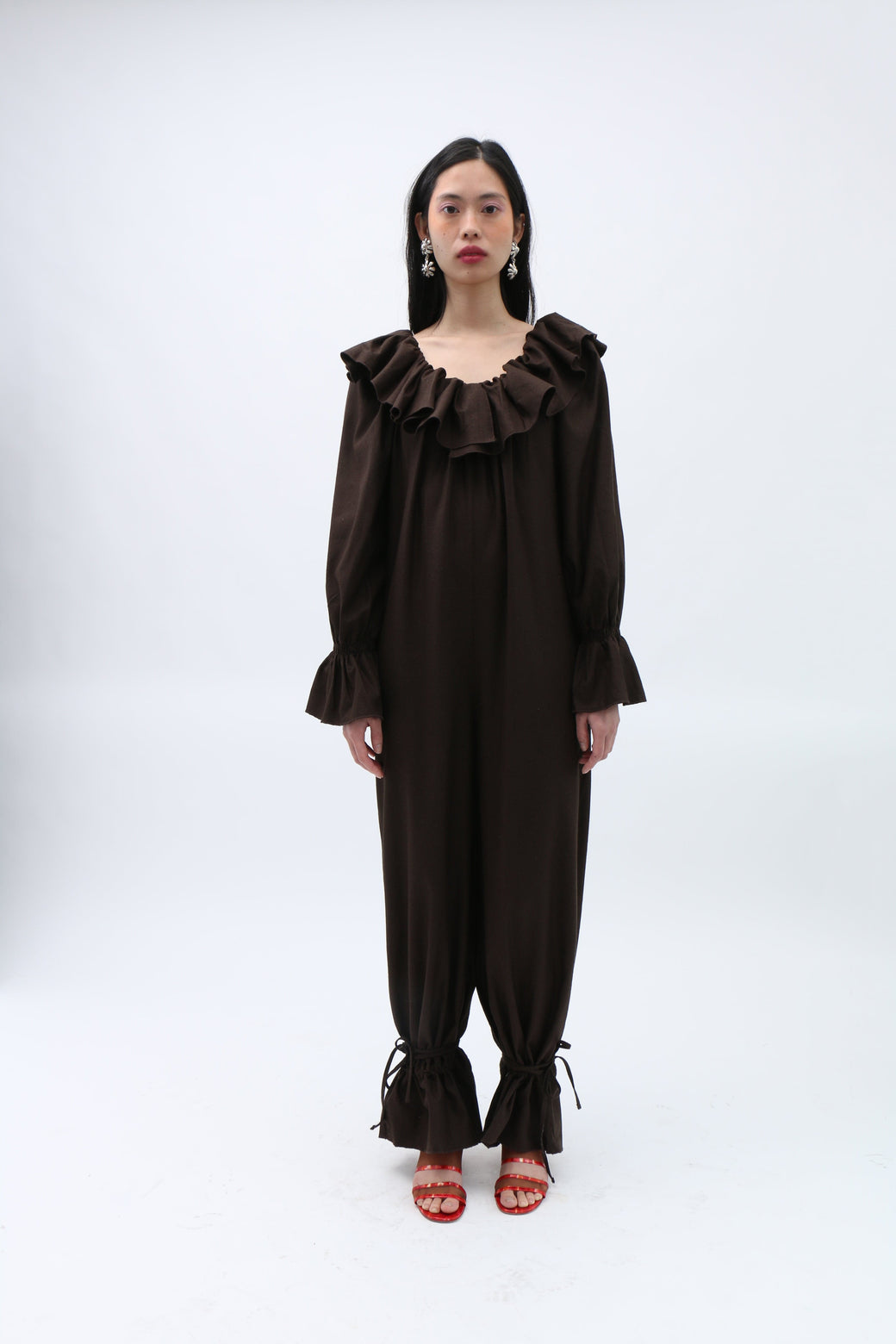 The ultimate jumpsuit. Ruffled neckline collar, sleeves and hem. Adjustable ties at wrists and ankles for a sleek fit. Wild silk in deep brown color. Fit is slightly oversize. Made in Turkey. Worn with the Double Bubble Earrings.