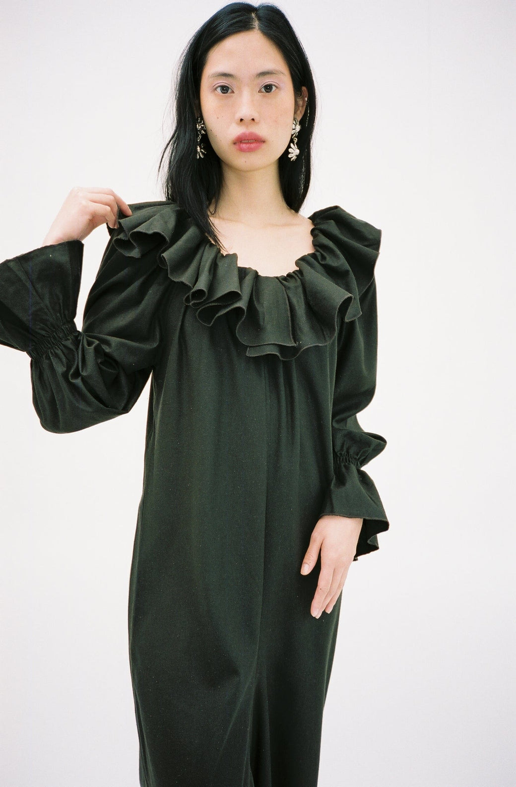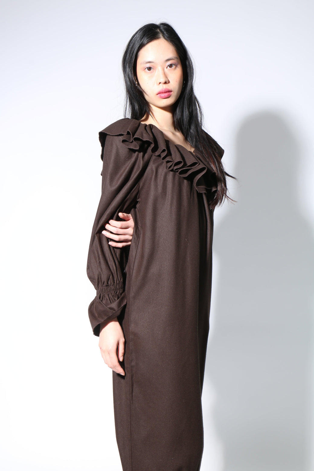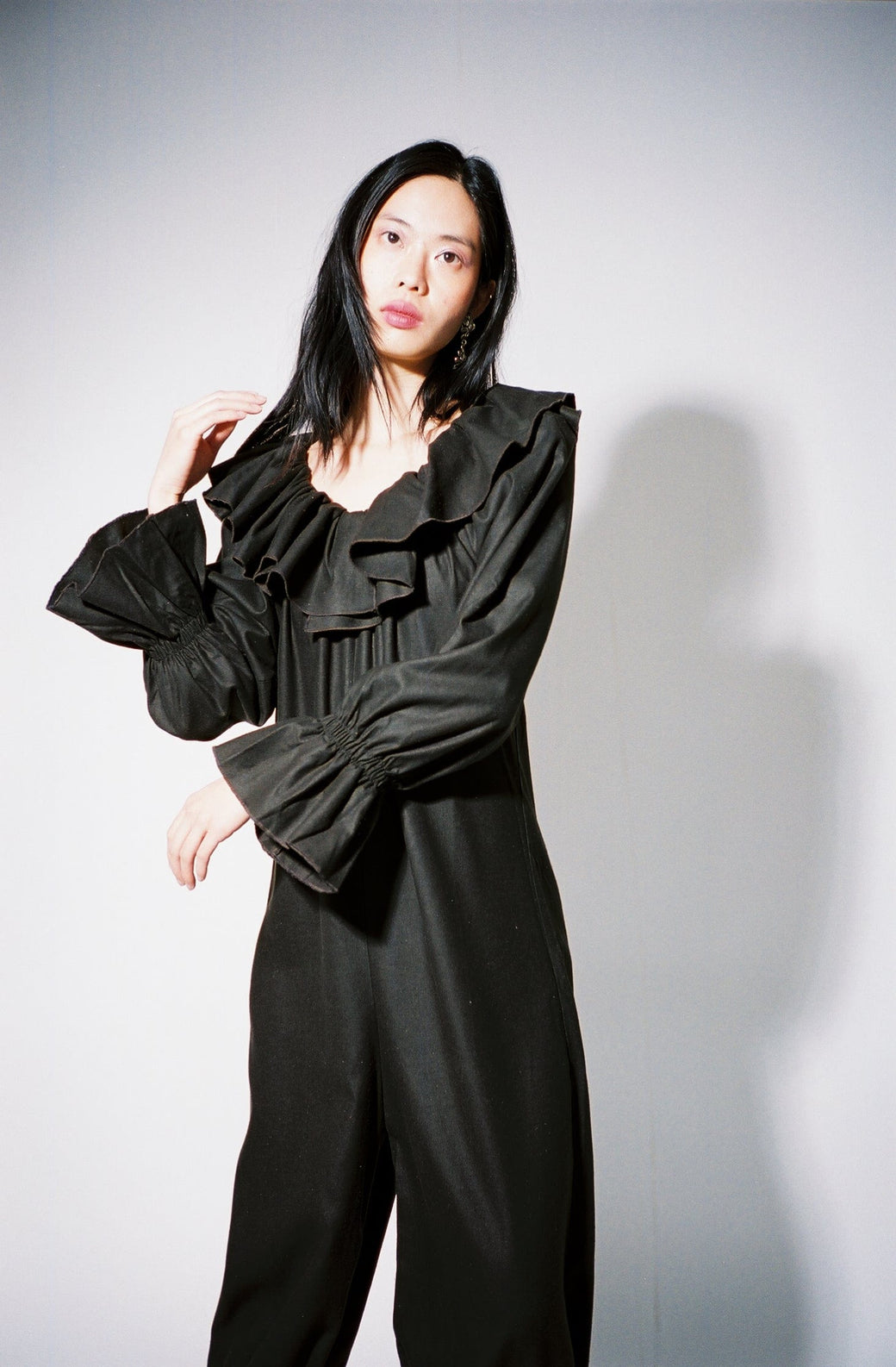 The ultimate jumpsuit. Ruffled neckline collar, sleeves and hem. Adjustable ties at wrists and ankles for a sleek fit. Wild silk in deep brown color. Fit is slightly oversize. Made in Turkey. Worn with the Double Bubble Earrings.