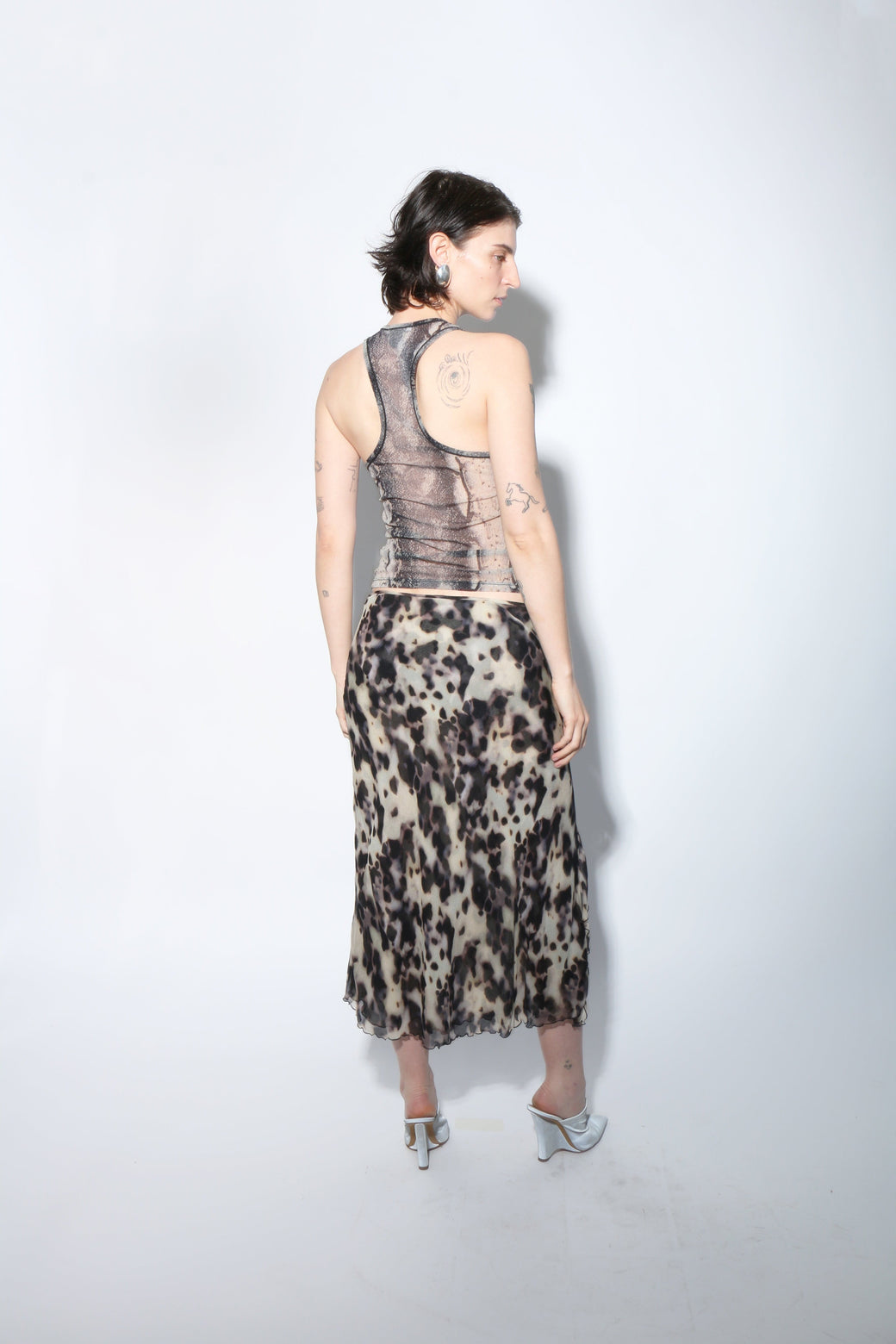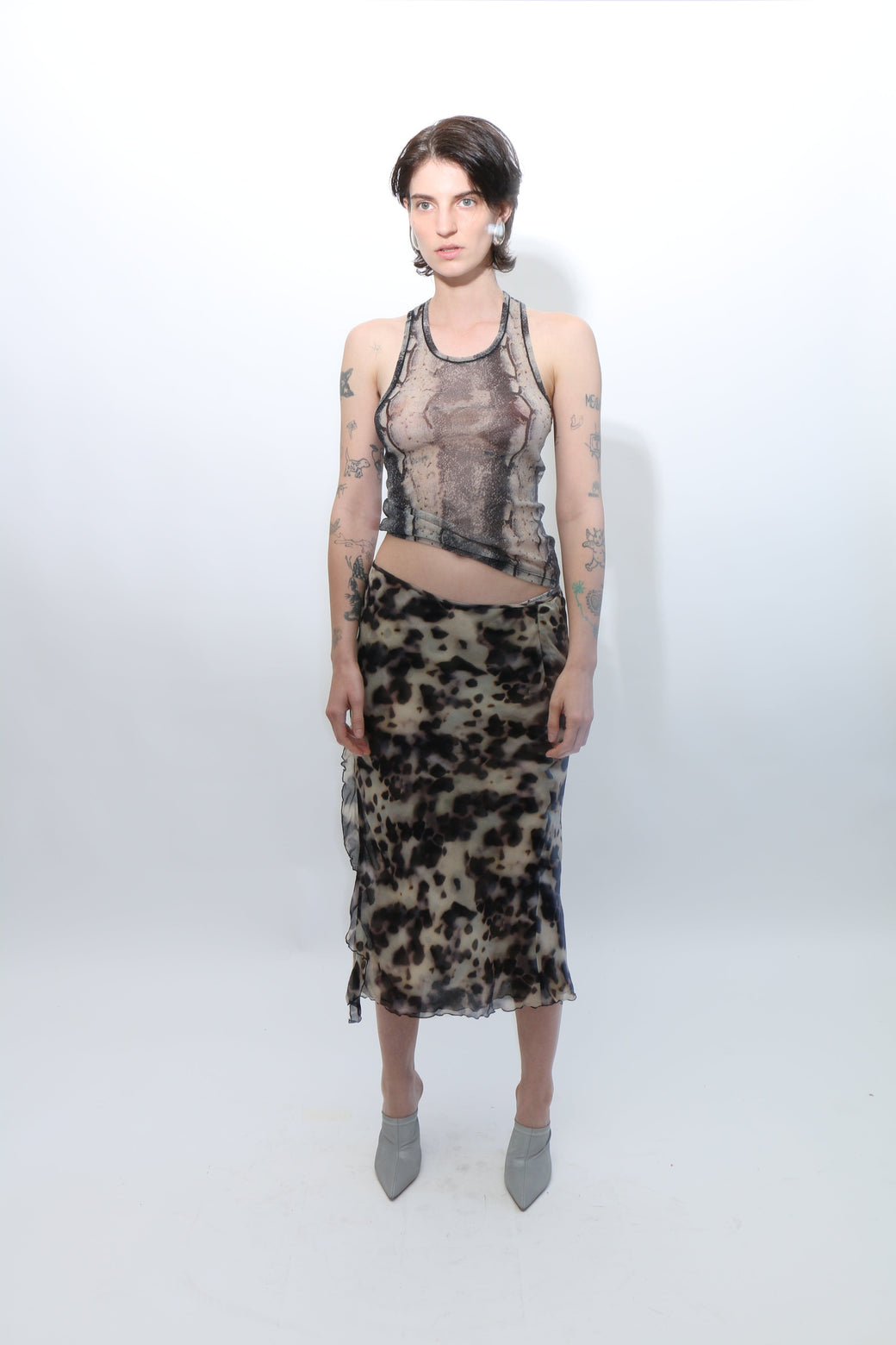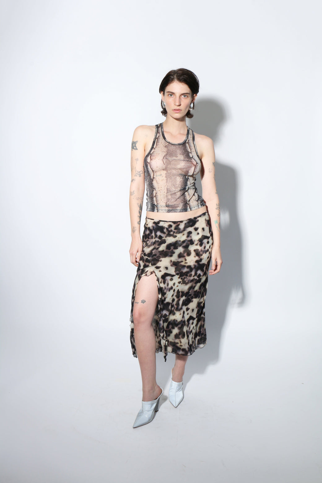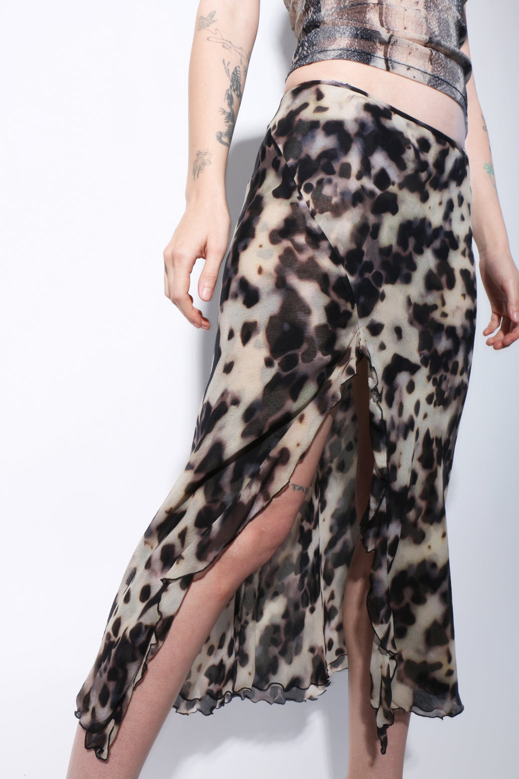 Tortoise midi skirt with high slit, double layered with ruffles on the skirt side slit. Low rise fit. Purl marrow hem closed with a zipper at the side seam.