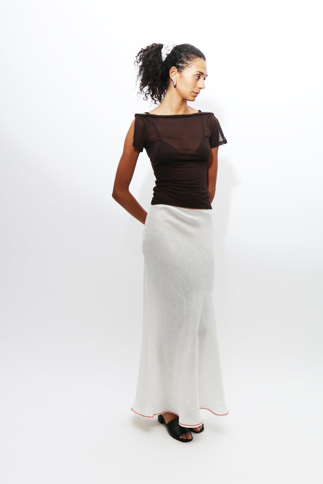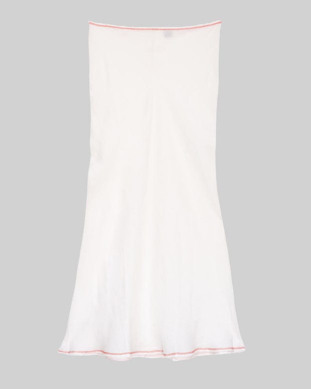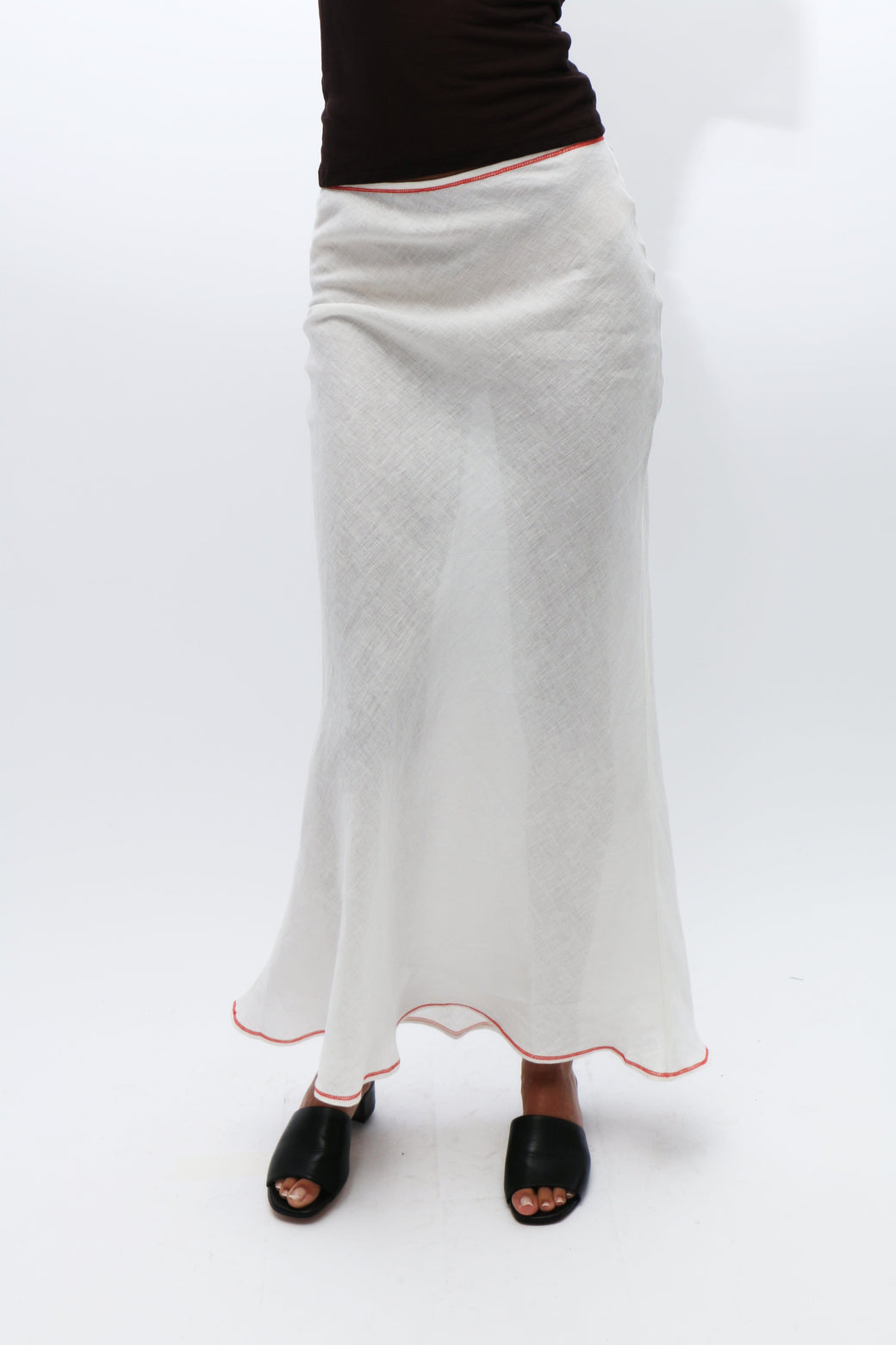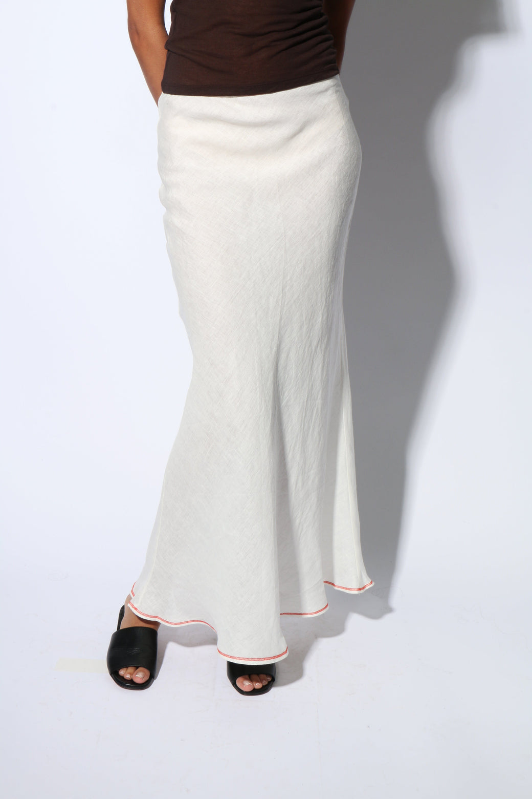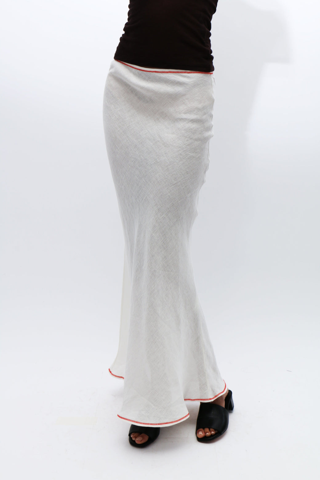 White linen bias cut maxi skirt. Exposed contrasting orange seams at top and bottom hem. Bottom back slit and top button closure.