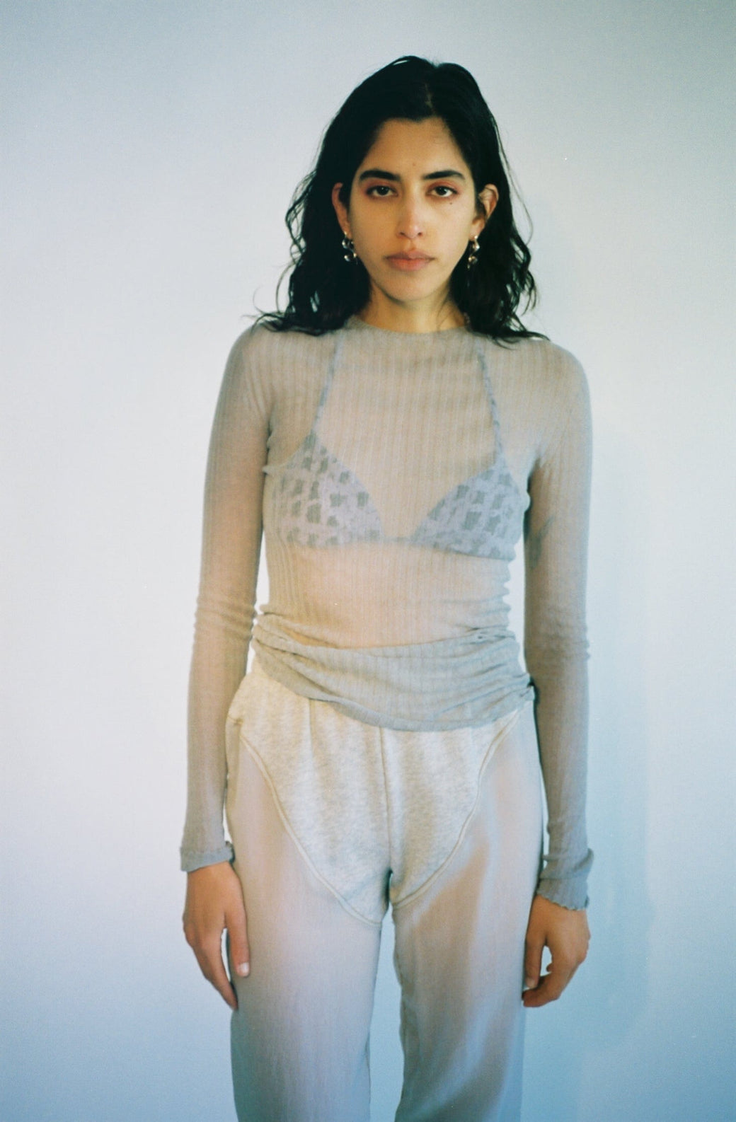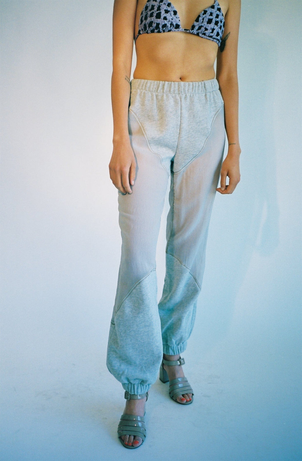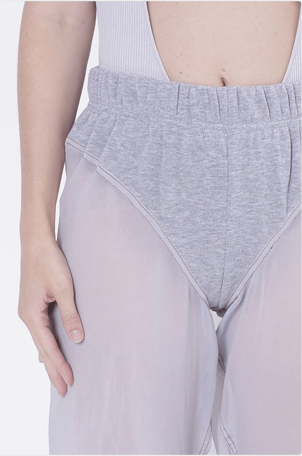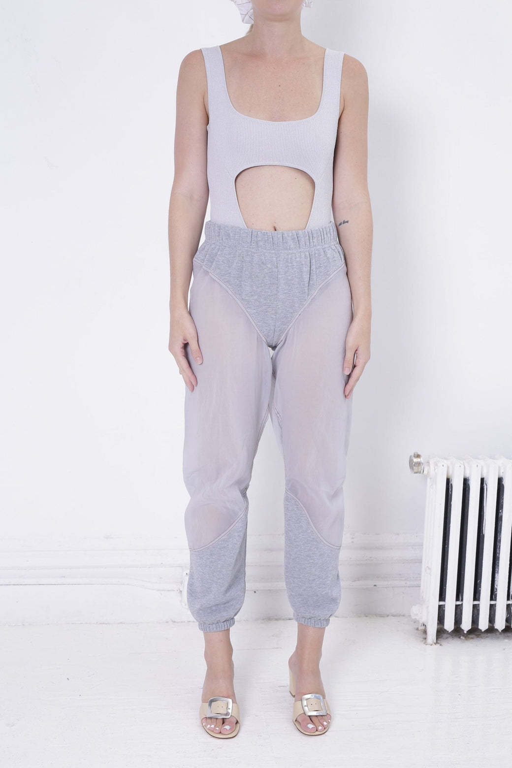 Mid rise sweatpant with elastic waistband and hem. Combo of heathered grey sweatpant and sheer fabric, a playful take on the classic lounge pant. Contrast light brown stitching throughout. Deadstock piece.