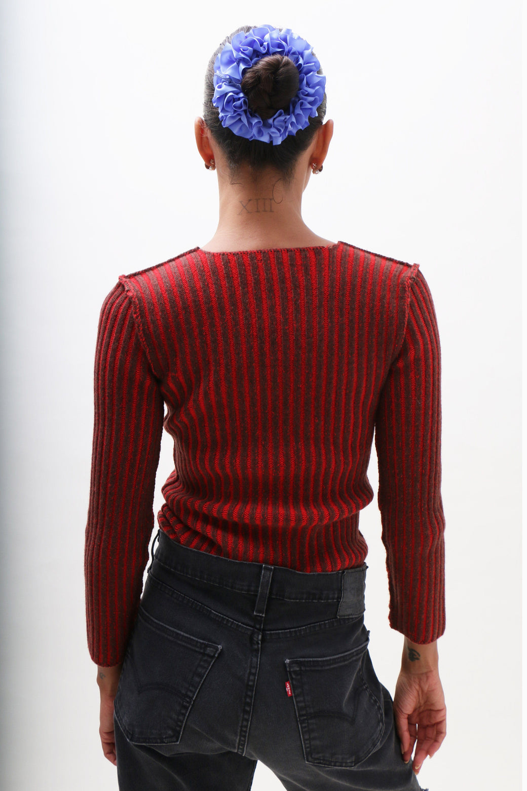 Hand-loomed in a rich red and brown rib knit, this long-sleeve sweater is made from super soft wool with a subtle striped texture throughout. Designed with a high neckline and a fully reversible silhouette.