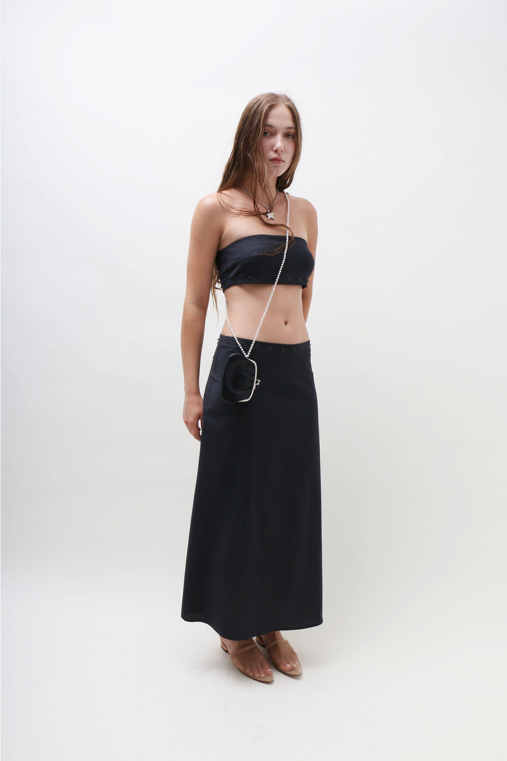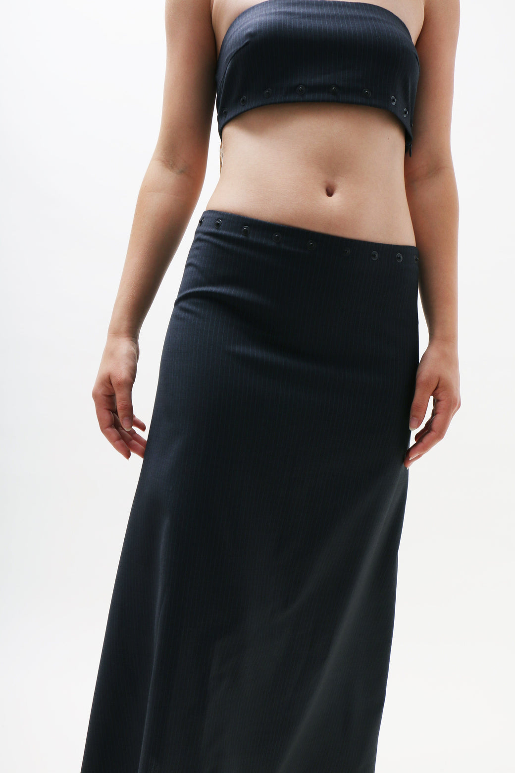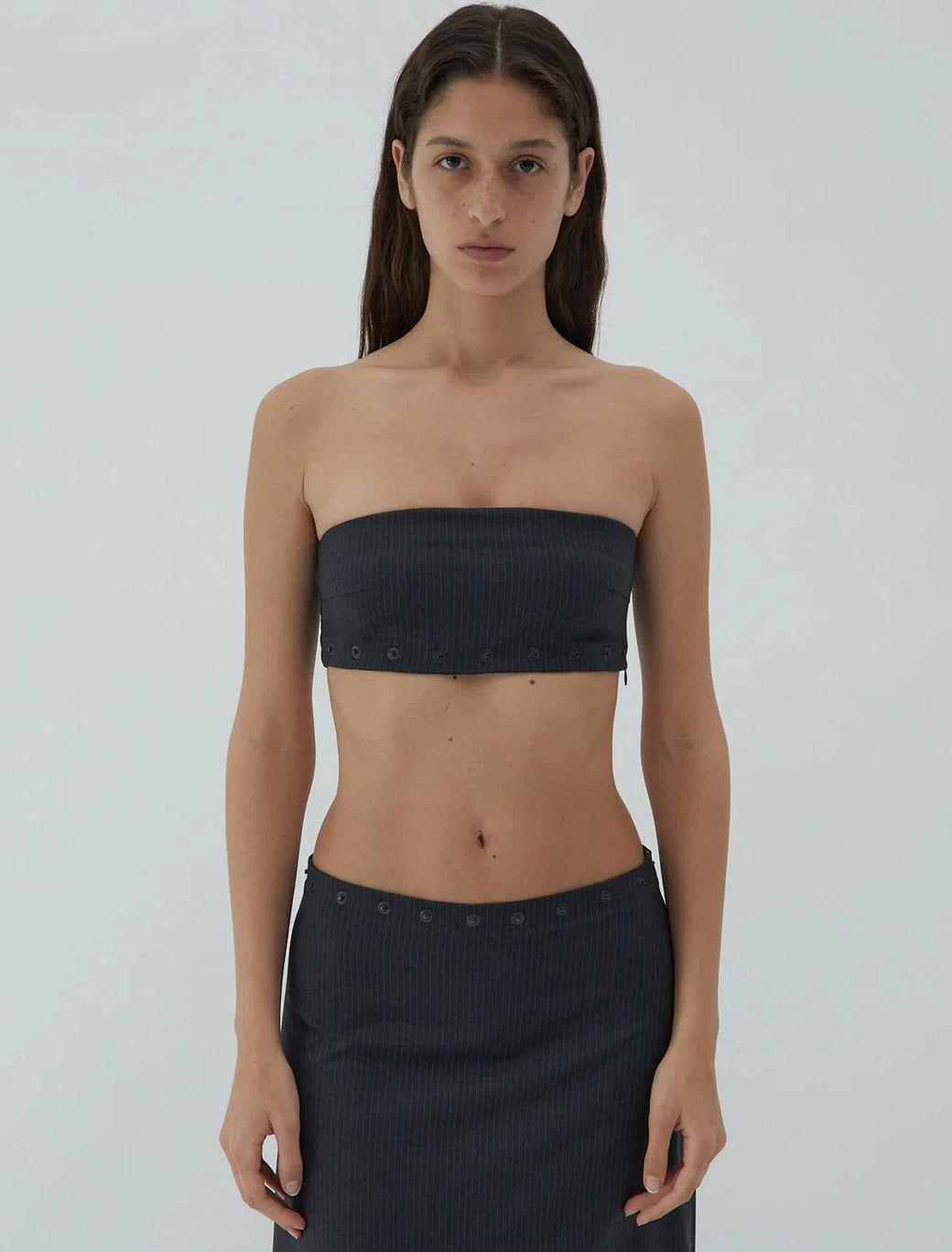 A fitted bandeau bra top with thoughtful details, a side zipper for ease and snaps along the bottom edge. Designed from a classic suit fabric, featuring a fine, delicate blue pinstripe.