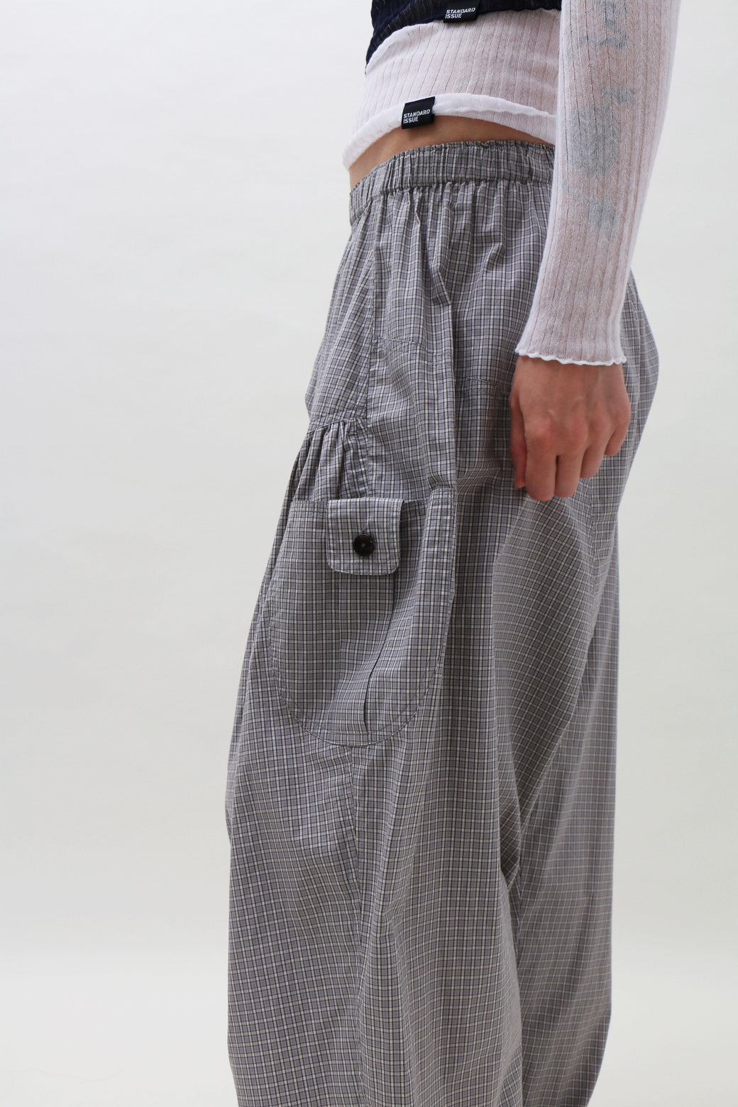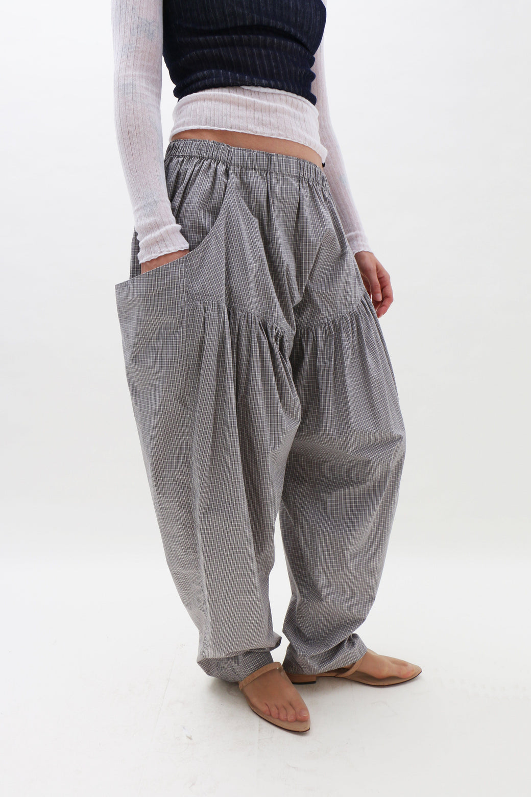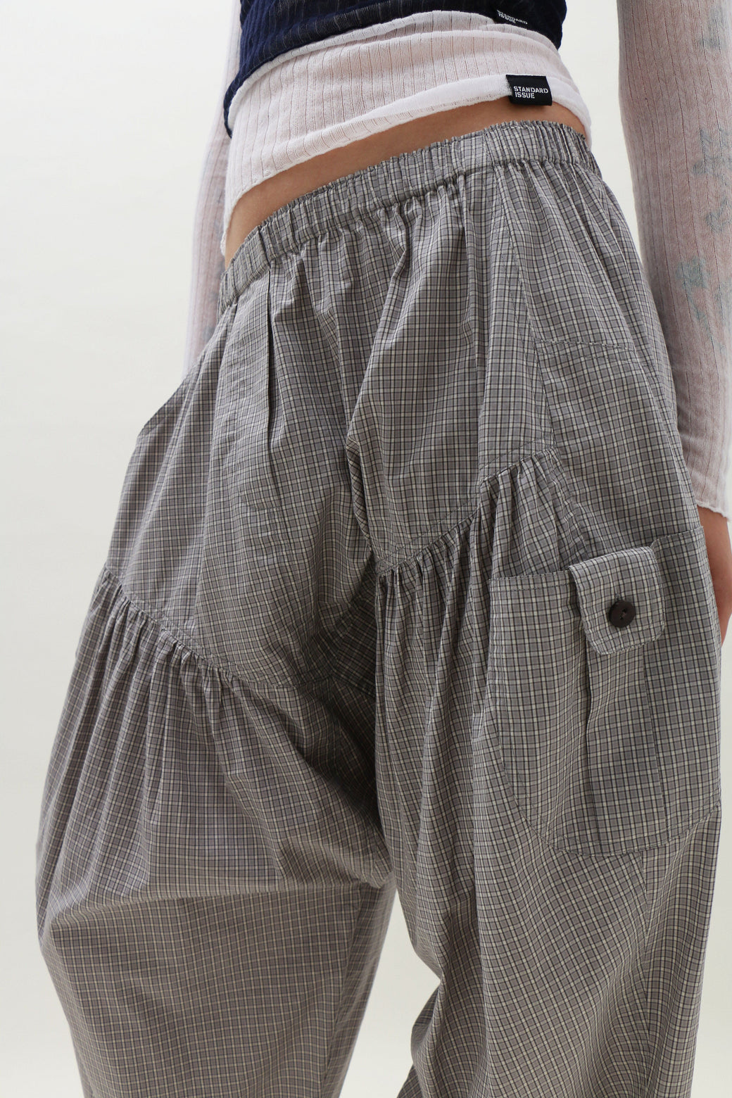 Check printed poplin balloon pants featuring front panel gathers that flow seamlessly into the oversized leg silhouette. Features two mismatched side pockets.