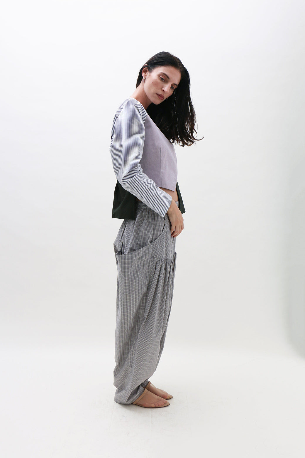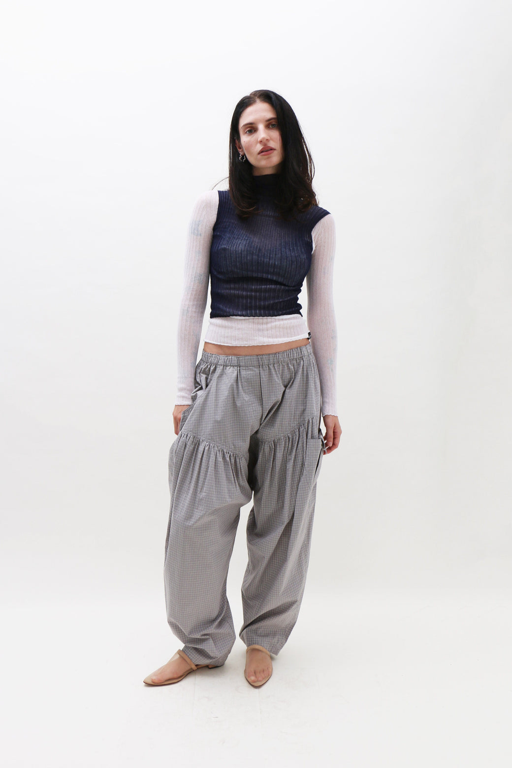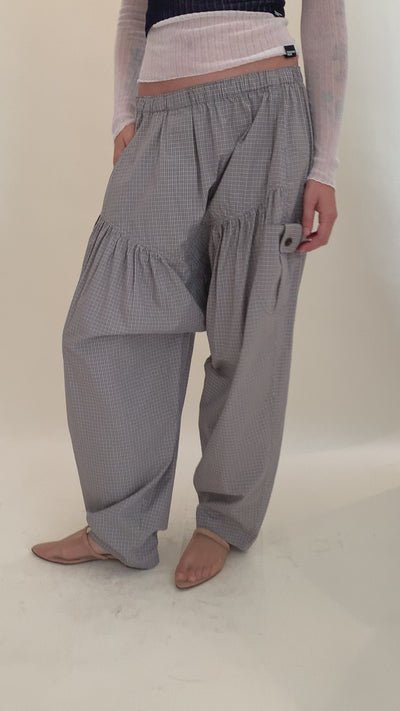 Check printed poplin balloon pants featuring front panel gathers that flow seamlessly into the oversized leg silhouette. Features two mismatched side pockets.