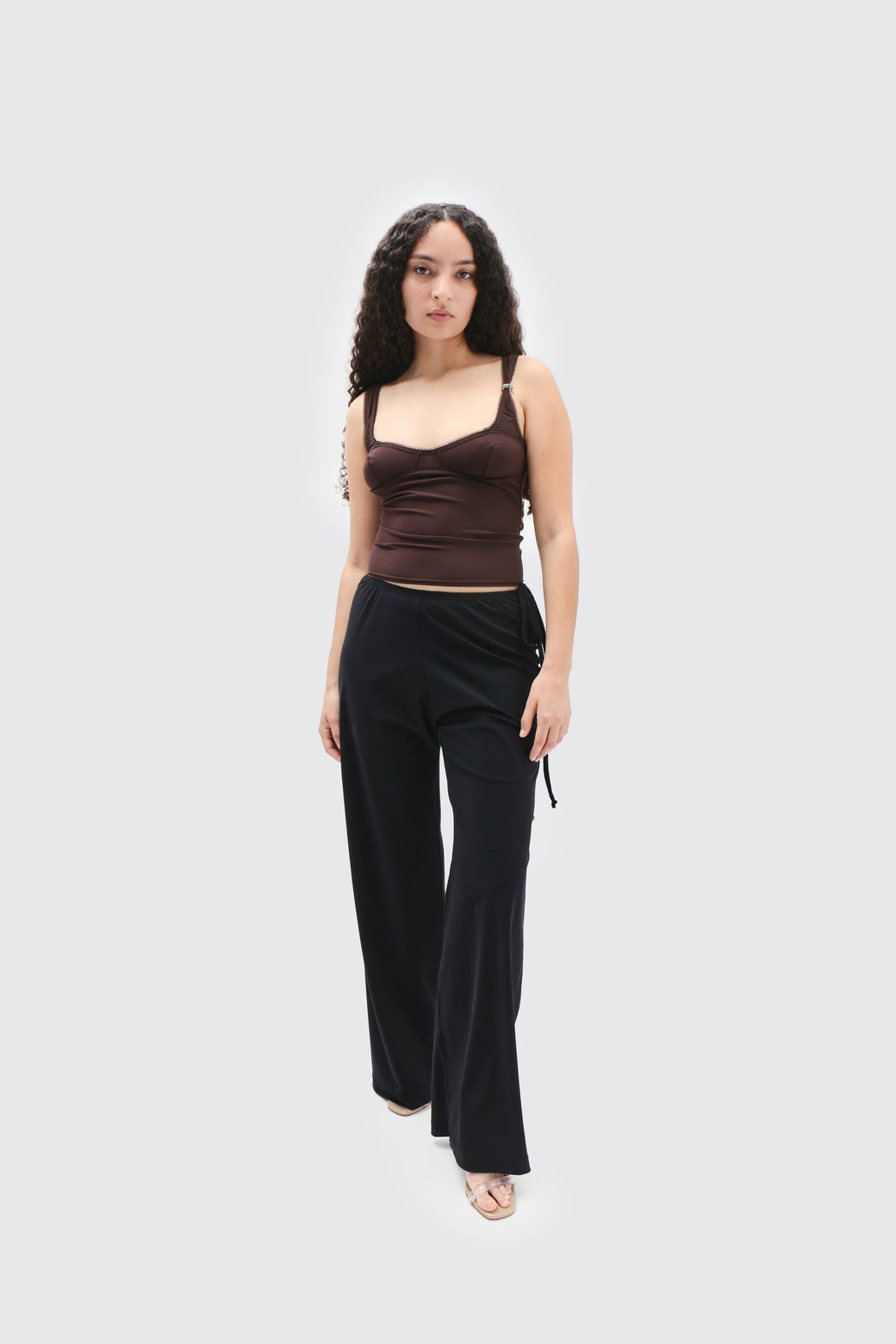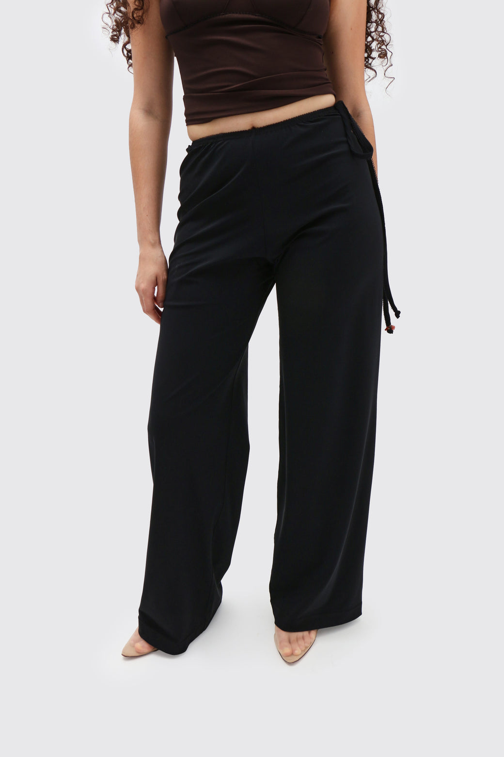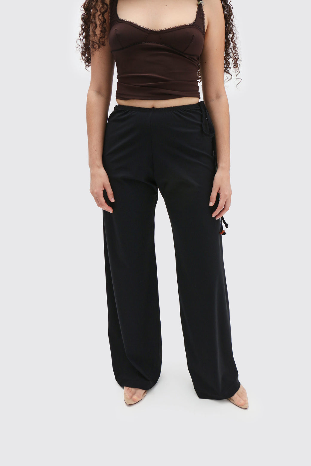Loose-fit black jersey pants with a soft elastic waistband, which features delicate lace scalloped trim, and ties on the right side for adjustability with Lucille's signature glass bead tie closure.
