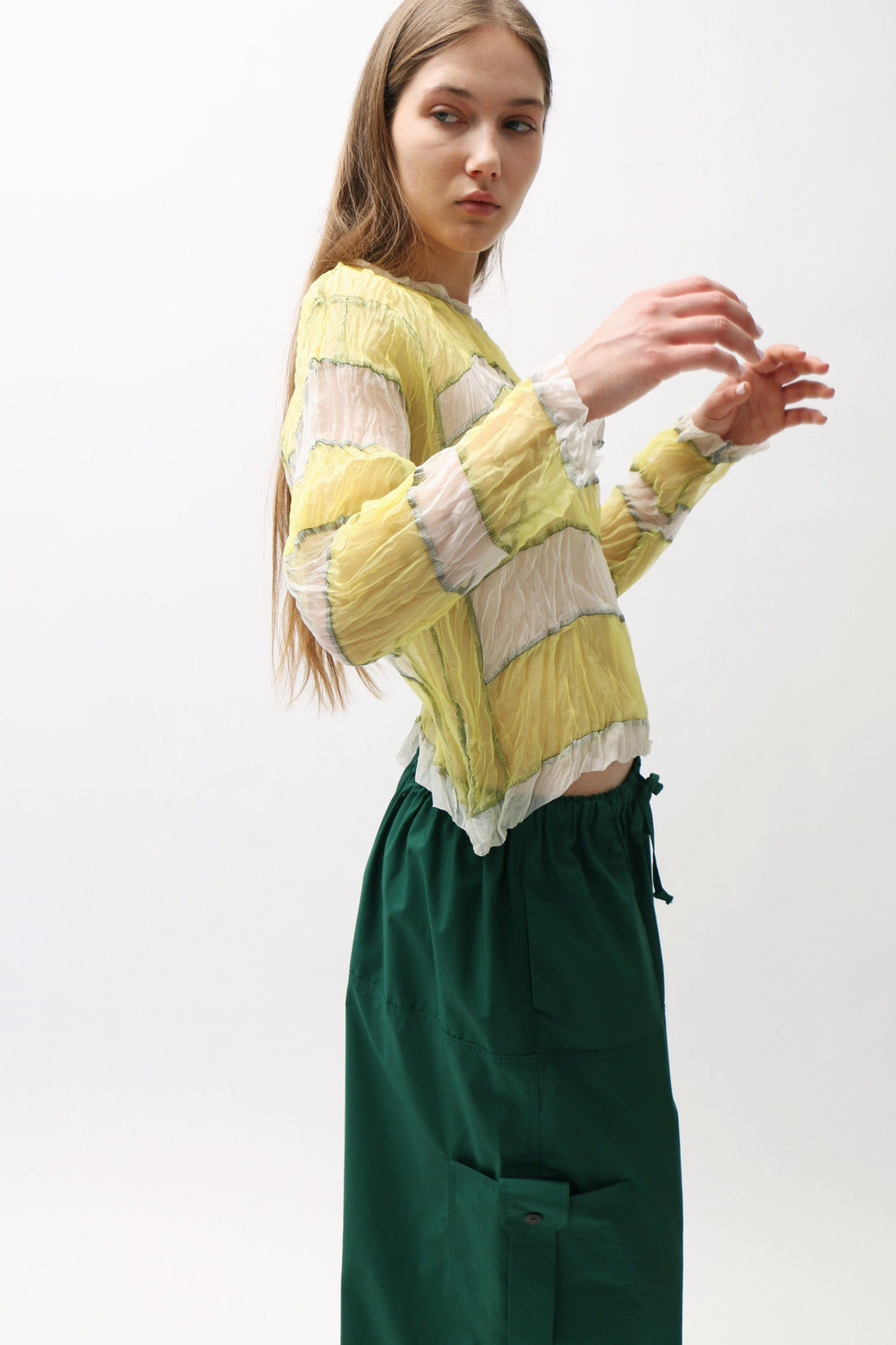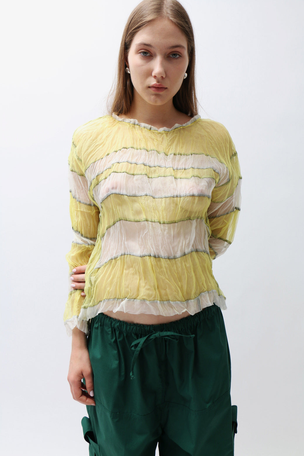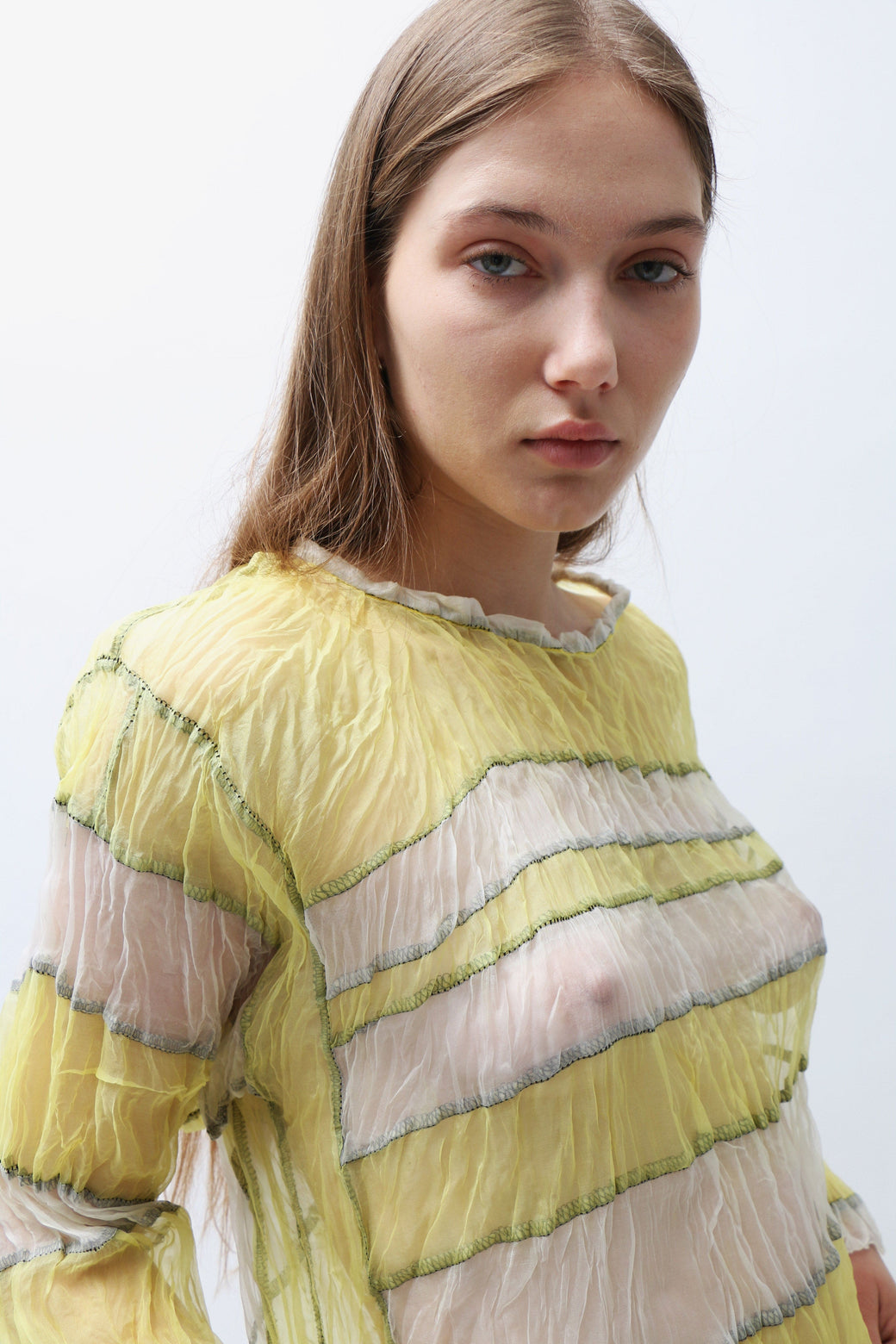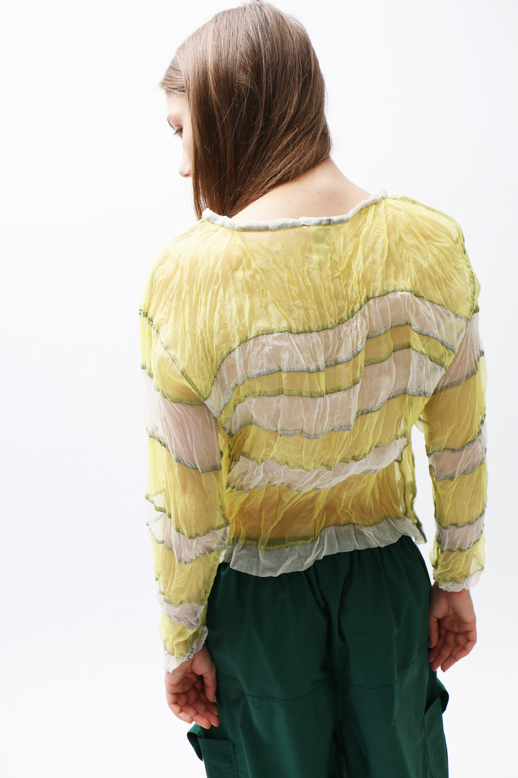 Crinkled yellow and white sheer silk organza long-sleeve top featuring a stripe paneled construction with intricate black serged topstitching throughout.