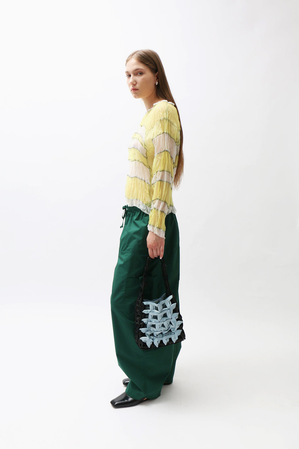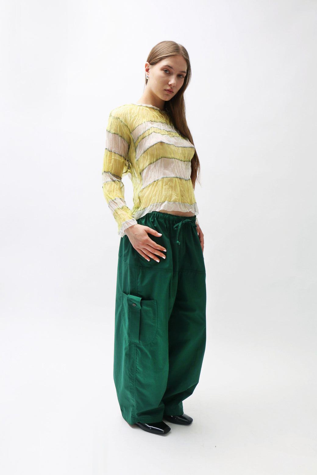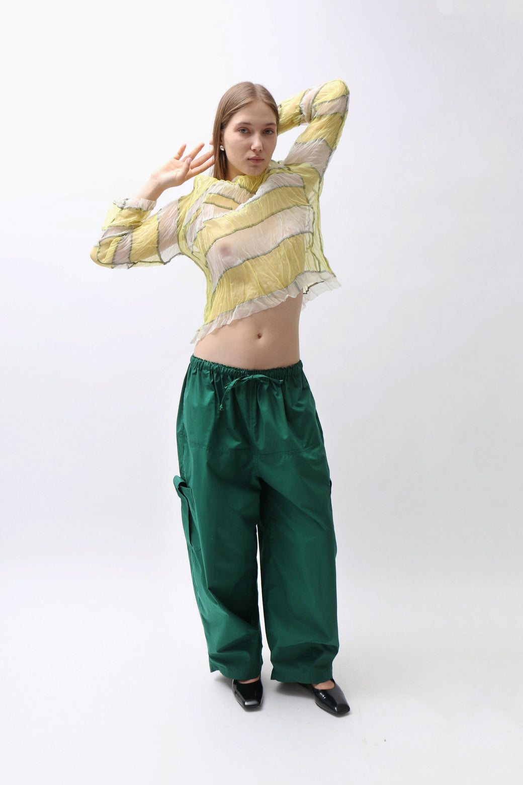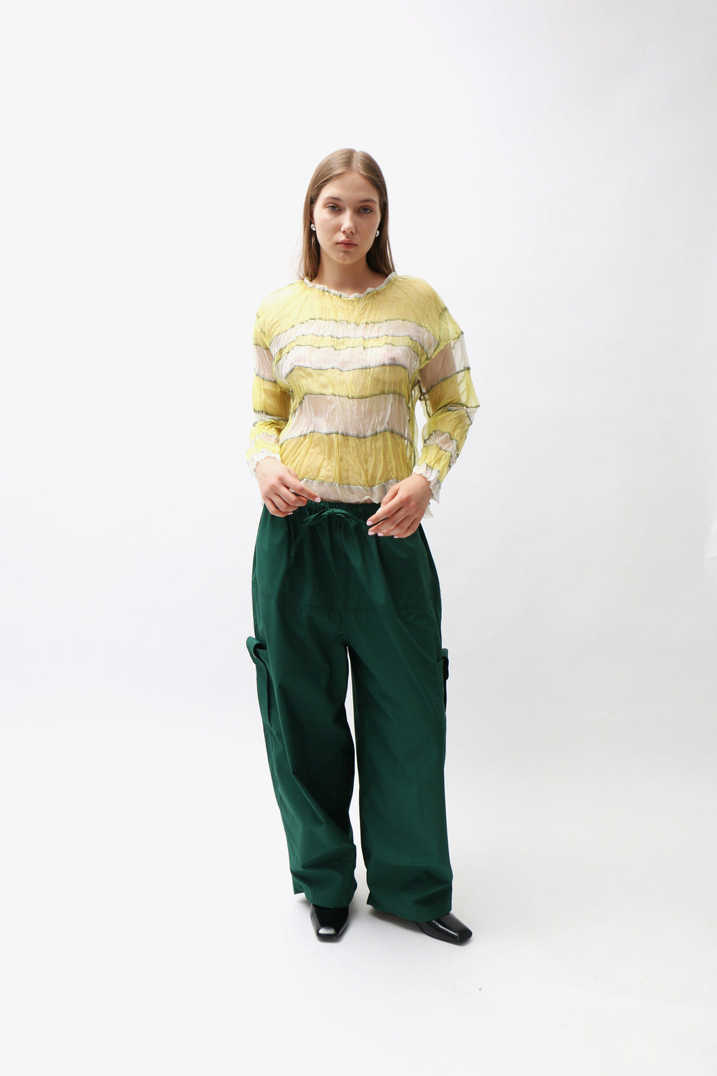 Crinkled yellow and white sheer silk organza long-sleeve top featuring a stripe paneled construction with intricate black serged topstitching throughout.
