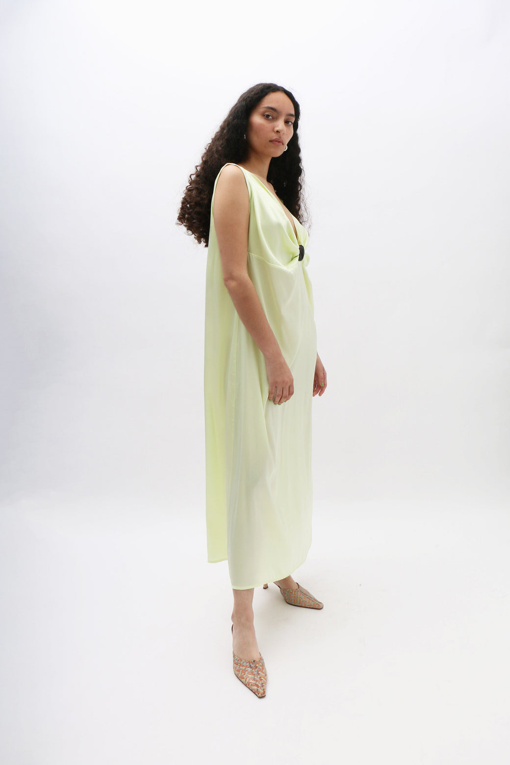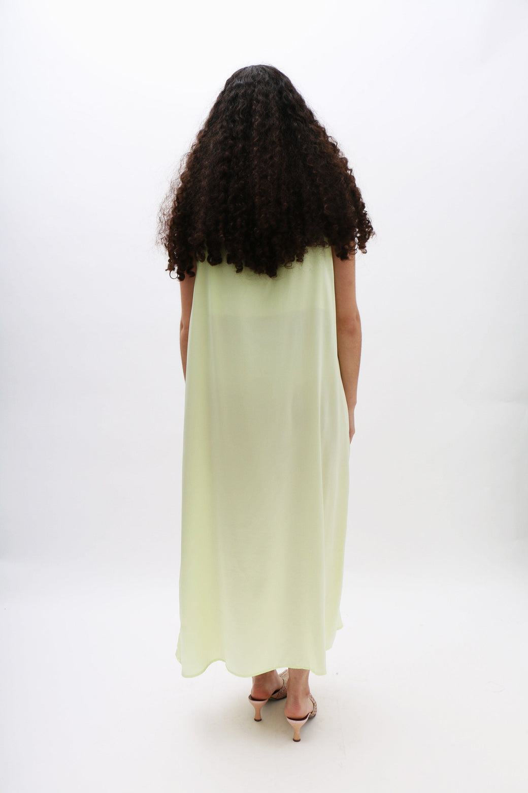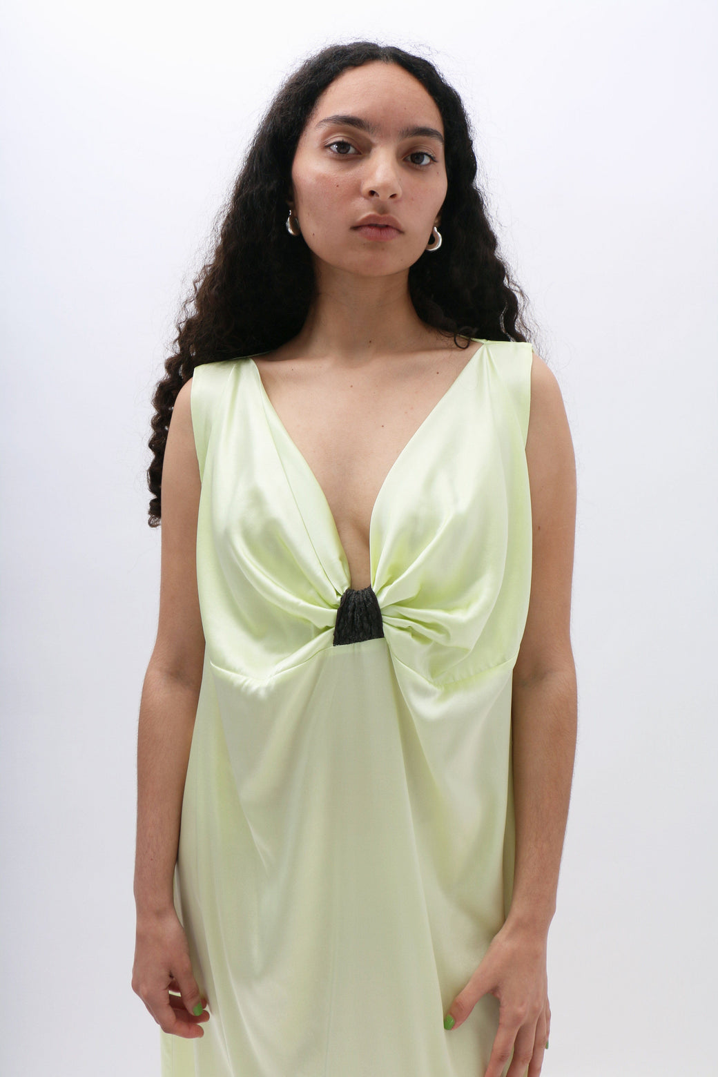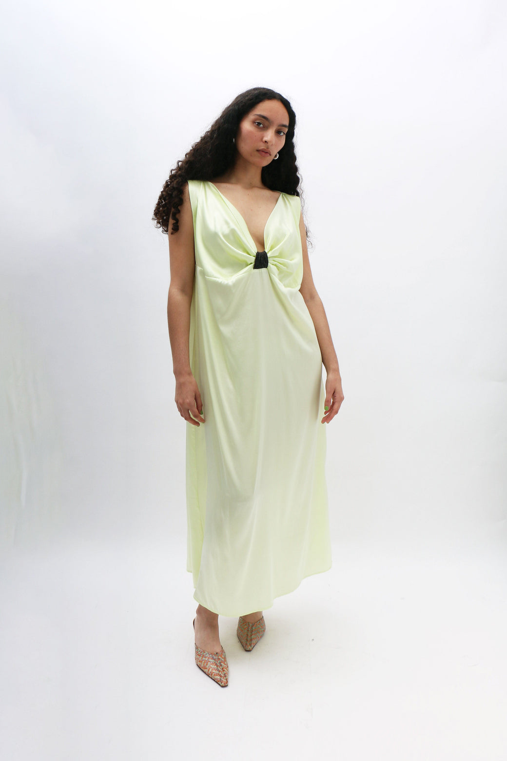 Light lime sleeveless maxi slip dress in silk satin features soft front gathers, creating a fluid and graceful silhouette.