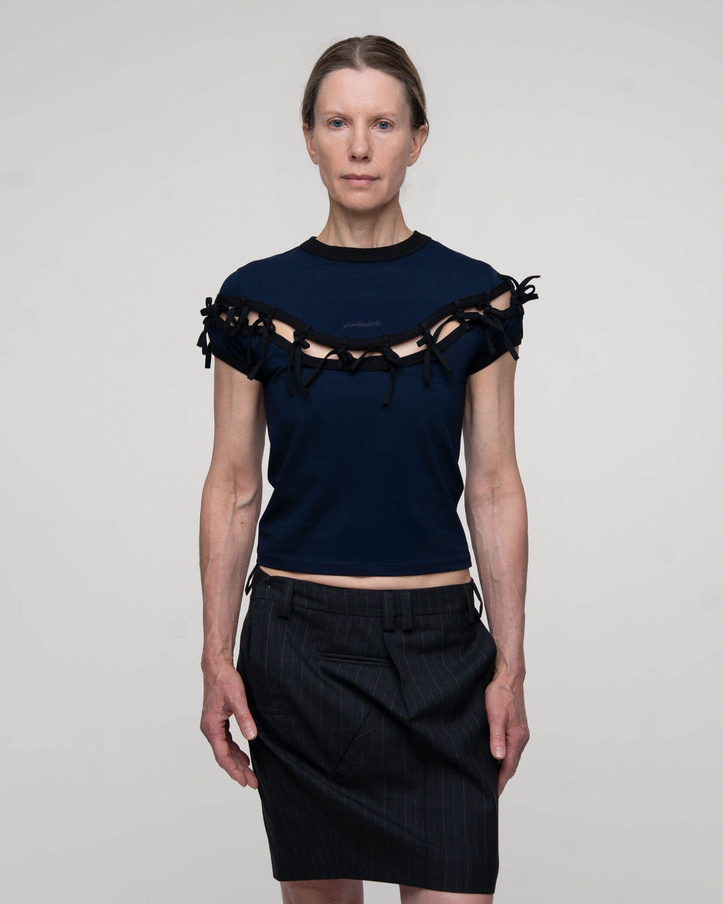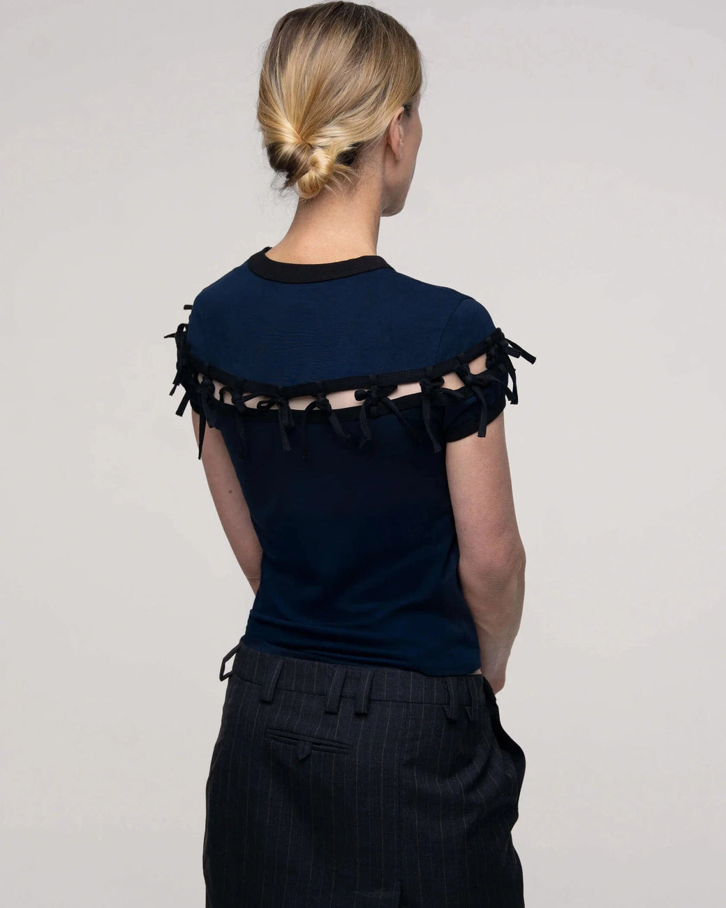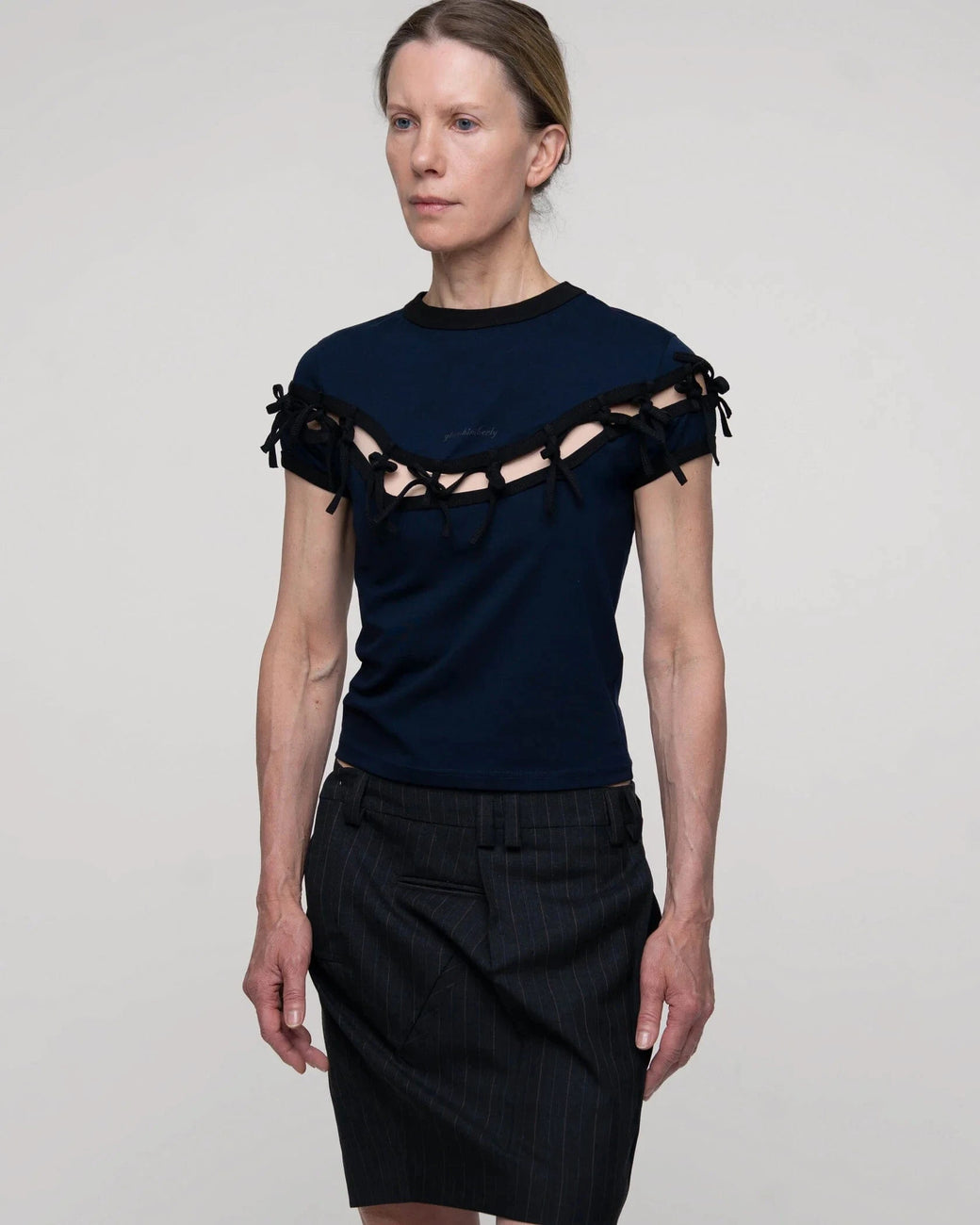 Navy short-sleeve top features a precise cut-out just above the chest, held delicately together by attached black bow ties. Finished with a small, centered logo.