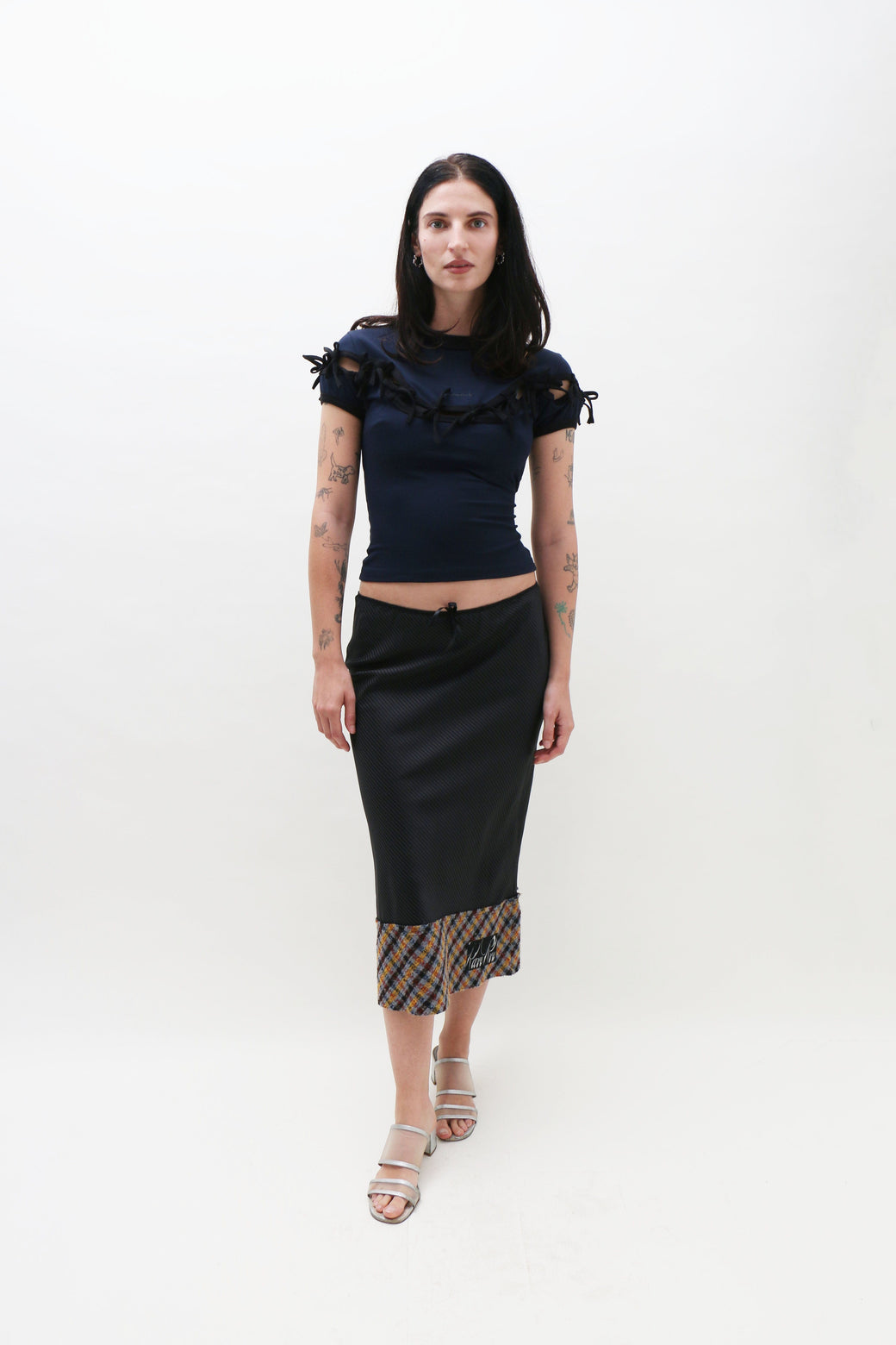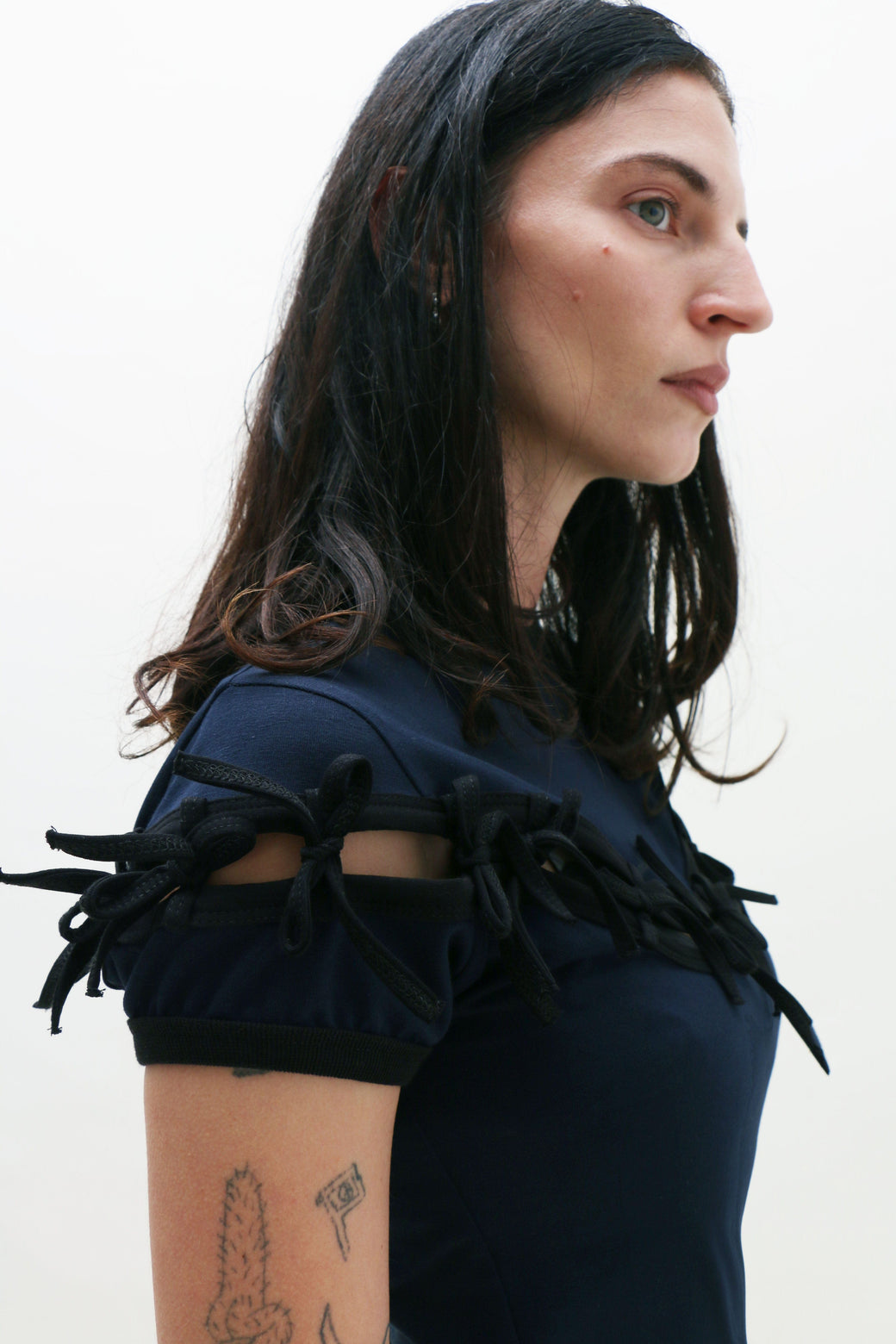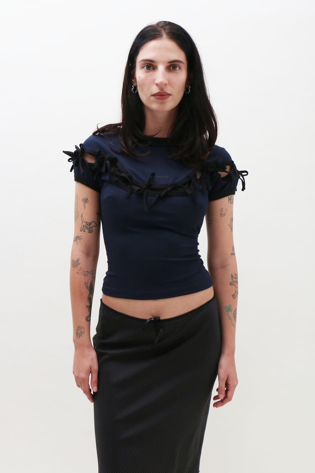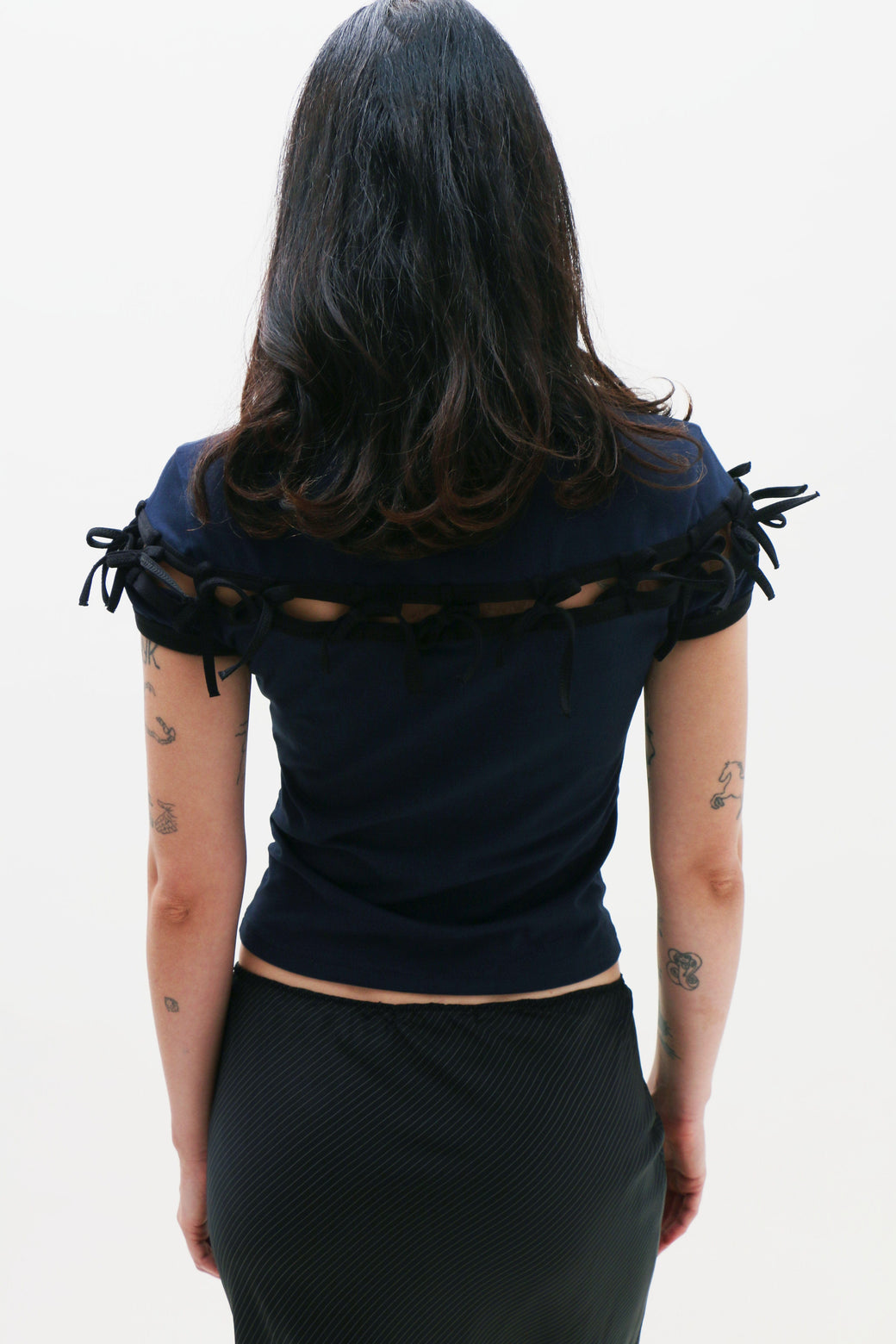 Navy short-sleeve top features a precise cut-out just above the chest, held delicately together by attached black bow ties. Finished with a small, centered logo.