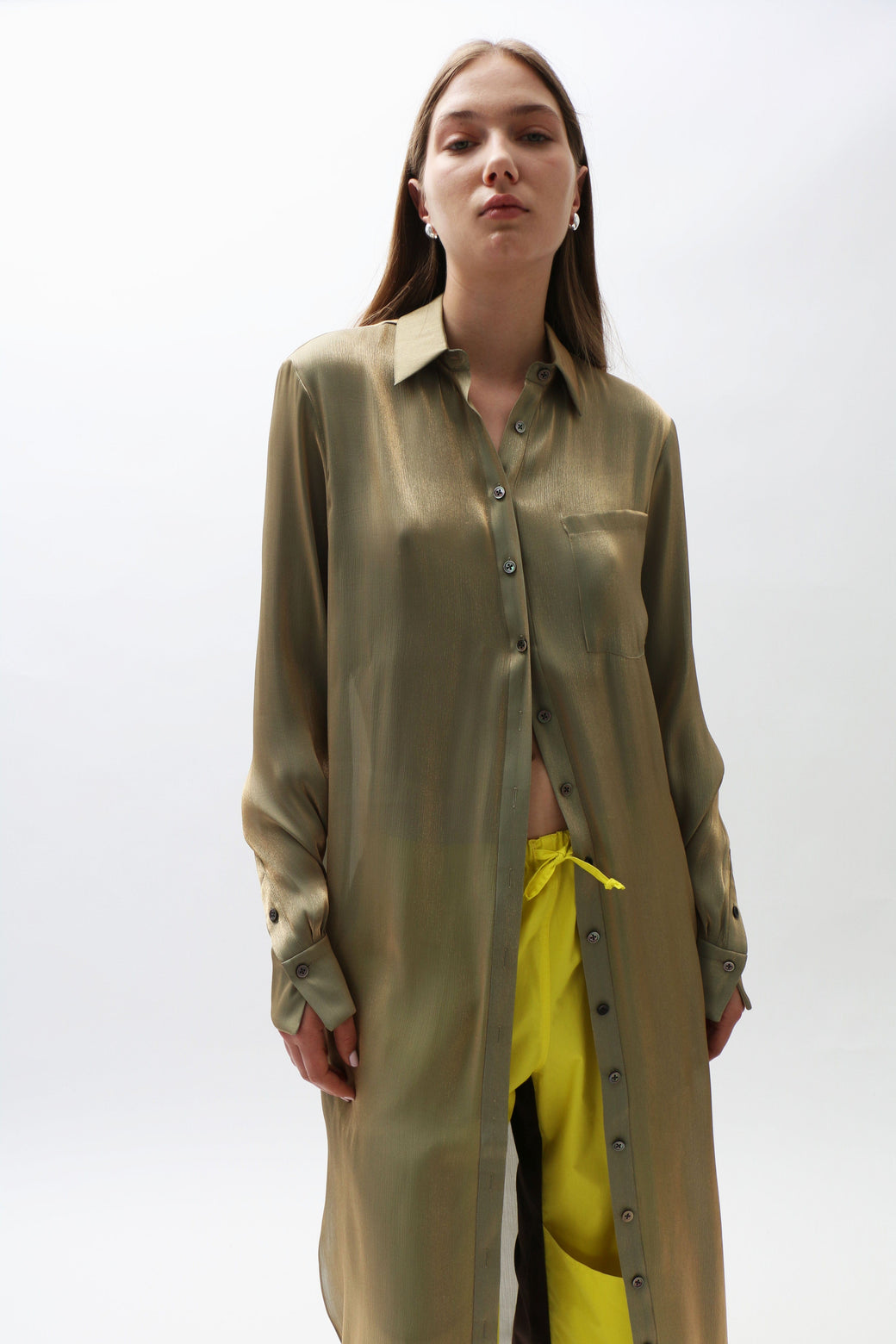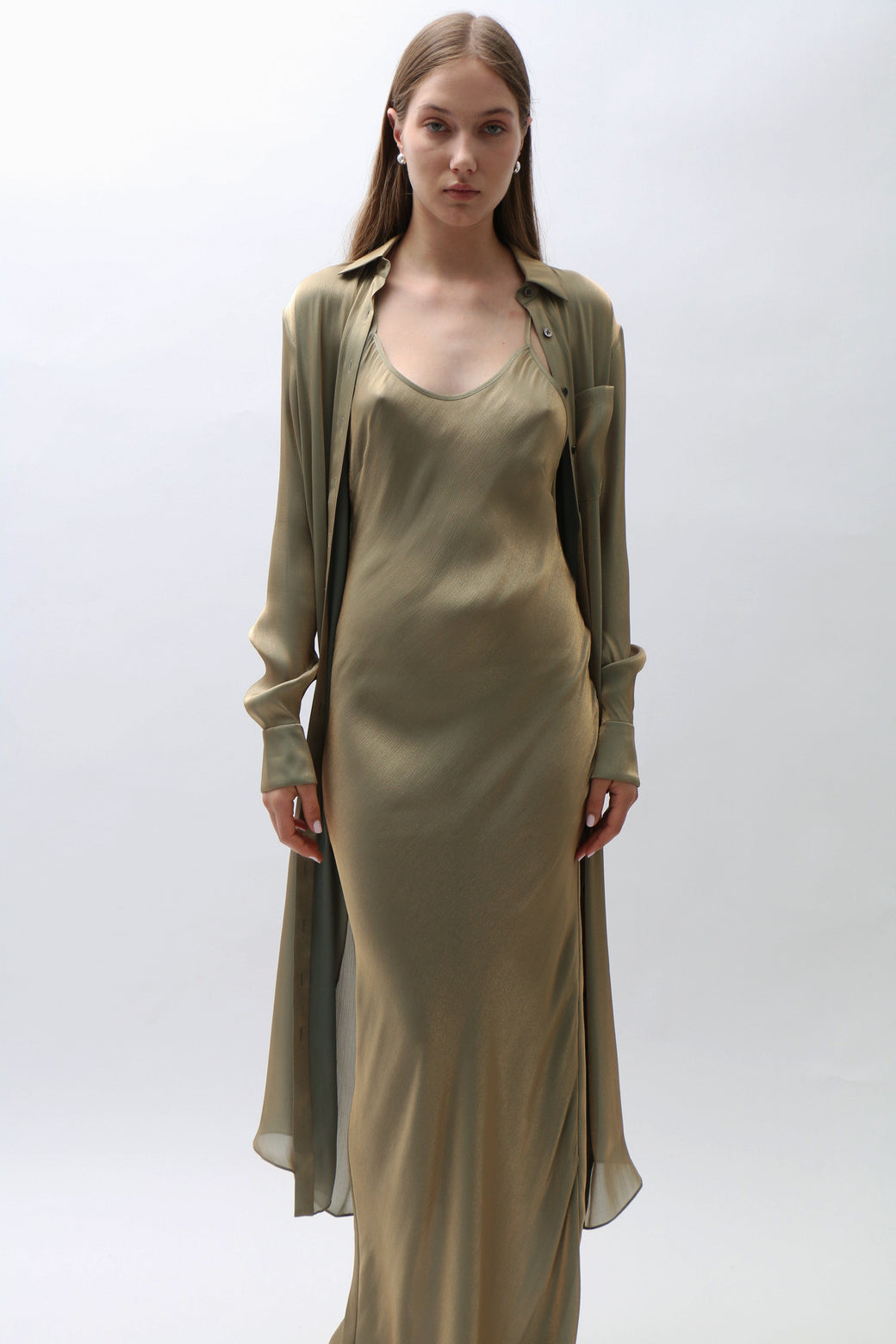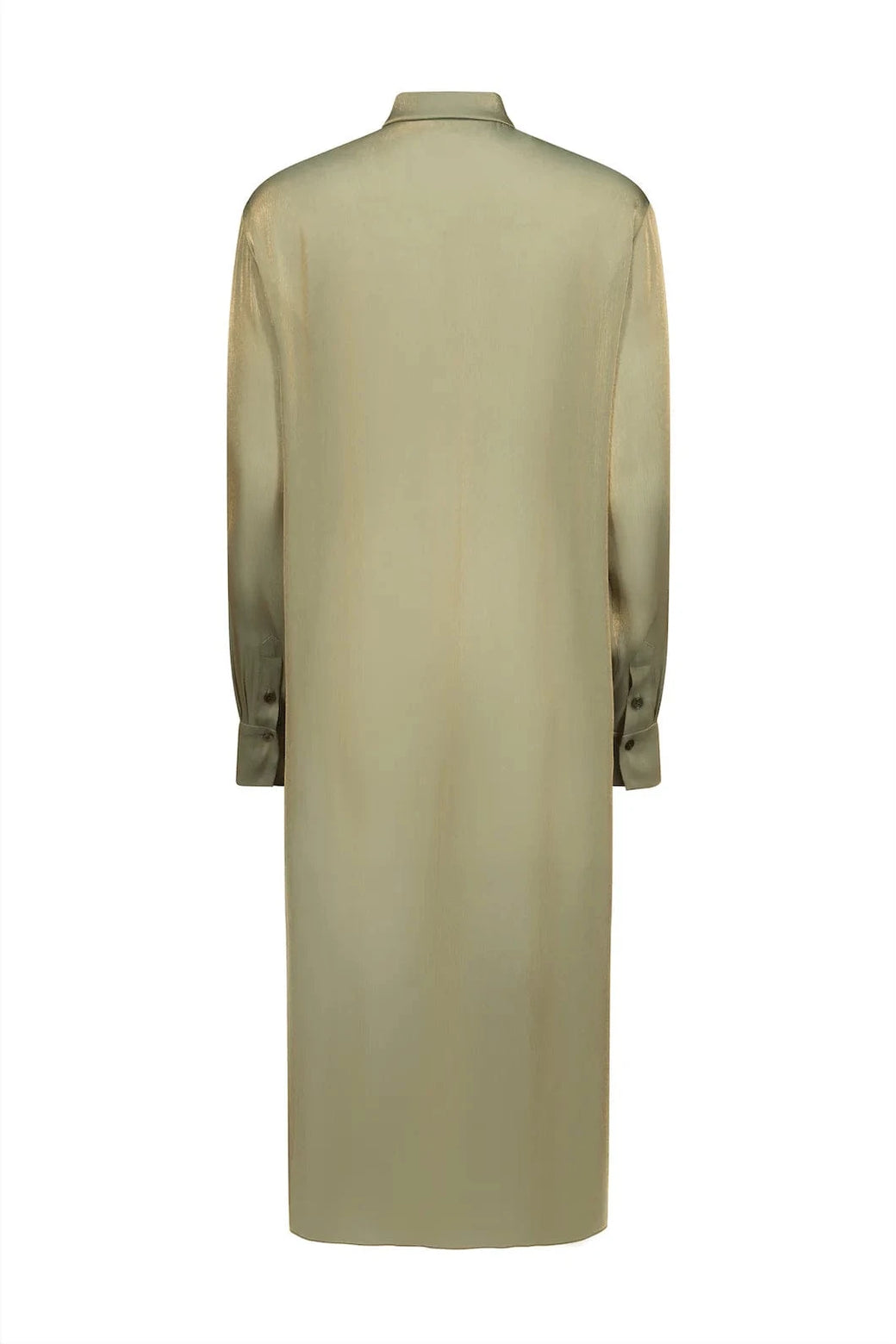 The rich olive oil hue of luminous satin brings an elevated touch to this classic button-up dress. Designed with a relaxed, straight fit, this semi-sheer dress features a button-front closure and a point collar. The long sleeves are finished with flared button cuffs, while a single chest pocket adds a subtle touch of utility.