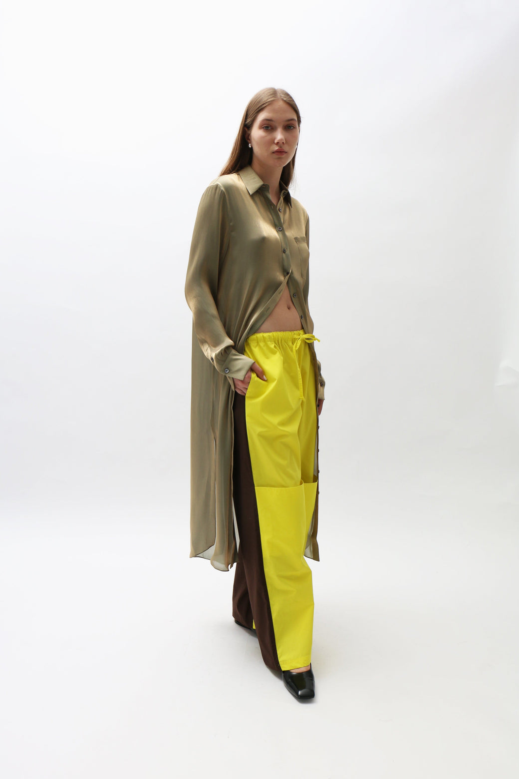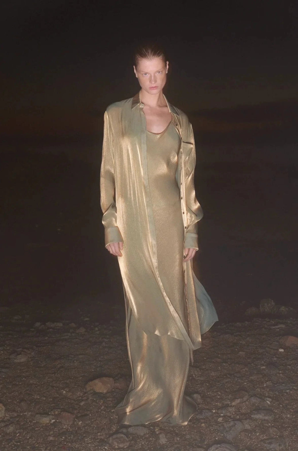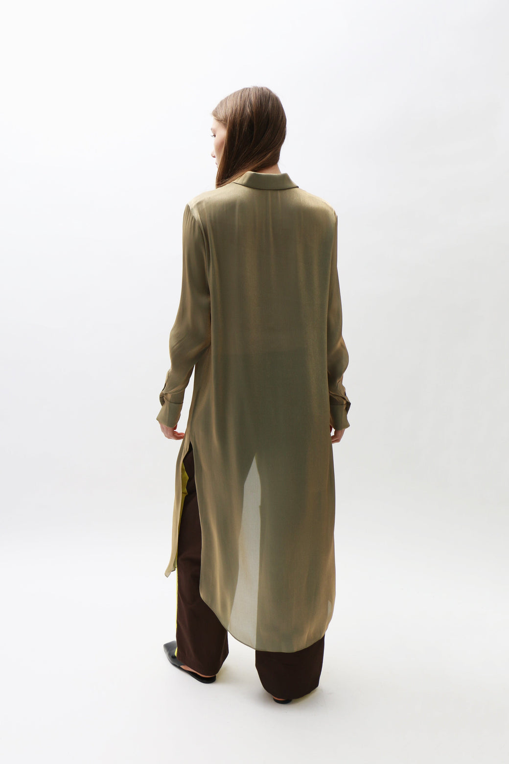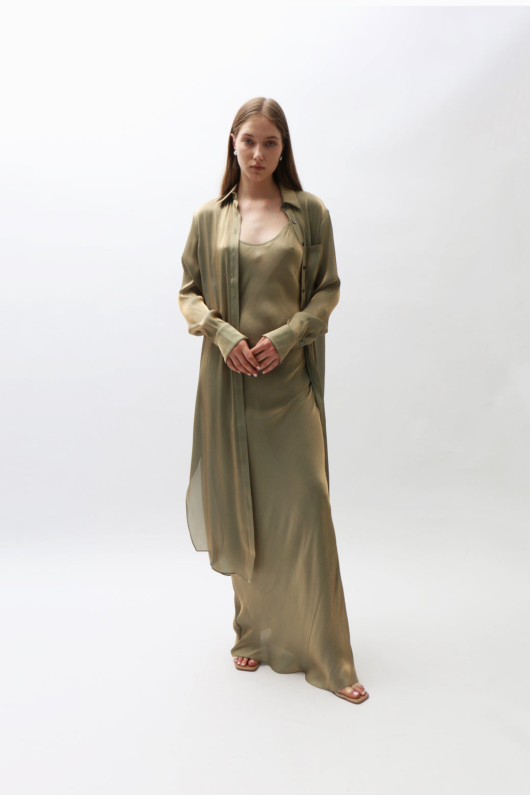 The rich olive oil hue of luminous satin brings an elevated touch to this classic button-up dress. Designed with a relaxed, straight fit, this semi-sheer dress features a button-front closure and a point collar. The long sleeves are finished with flared button cuffs, while a single chest pocket adds a subtle touch of utility.