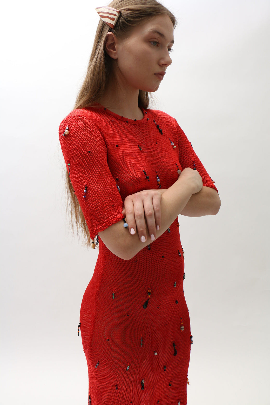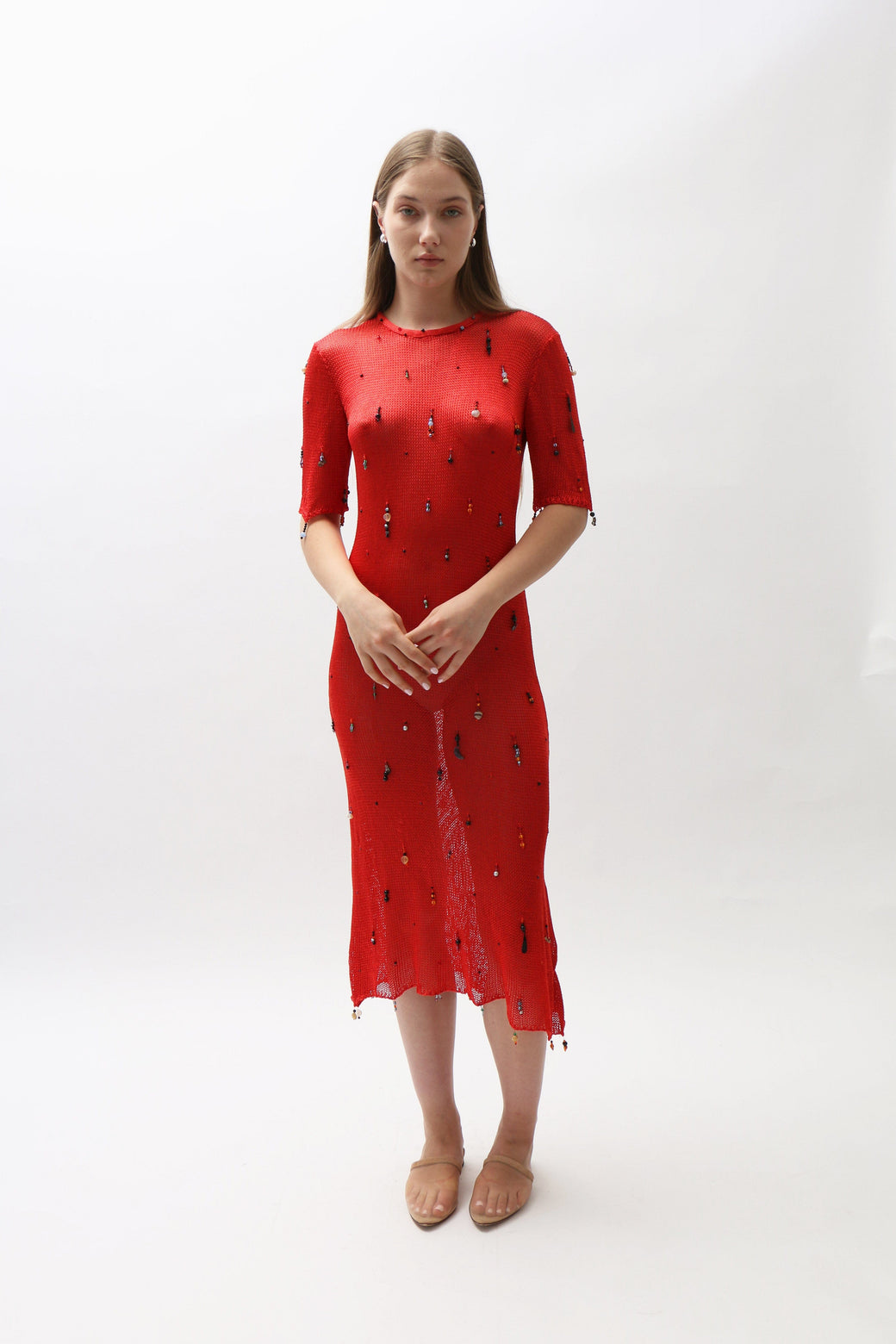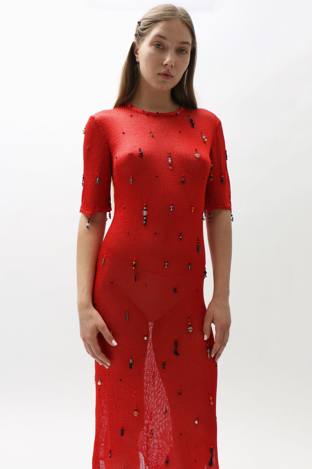 Hand-knit red dress featuring short sleeves and a sheer, open-knit construction. Embellished throughout with multi-shaped beaded tassels, adding texture and dimension. Finished with a classic crew neckline and a button closure at the back of the collar.
