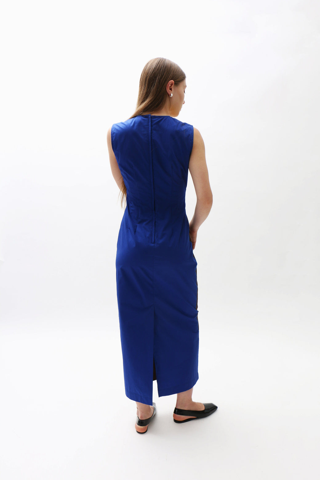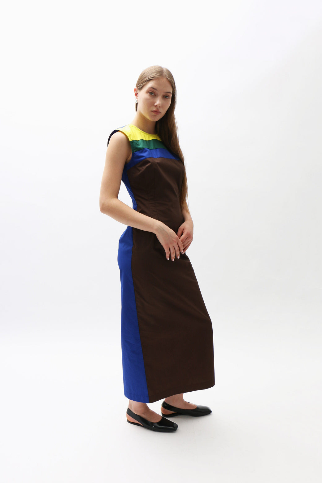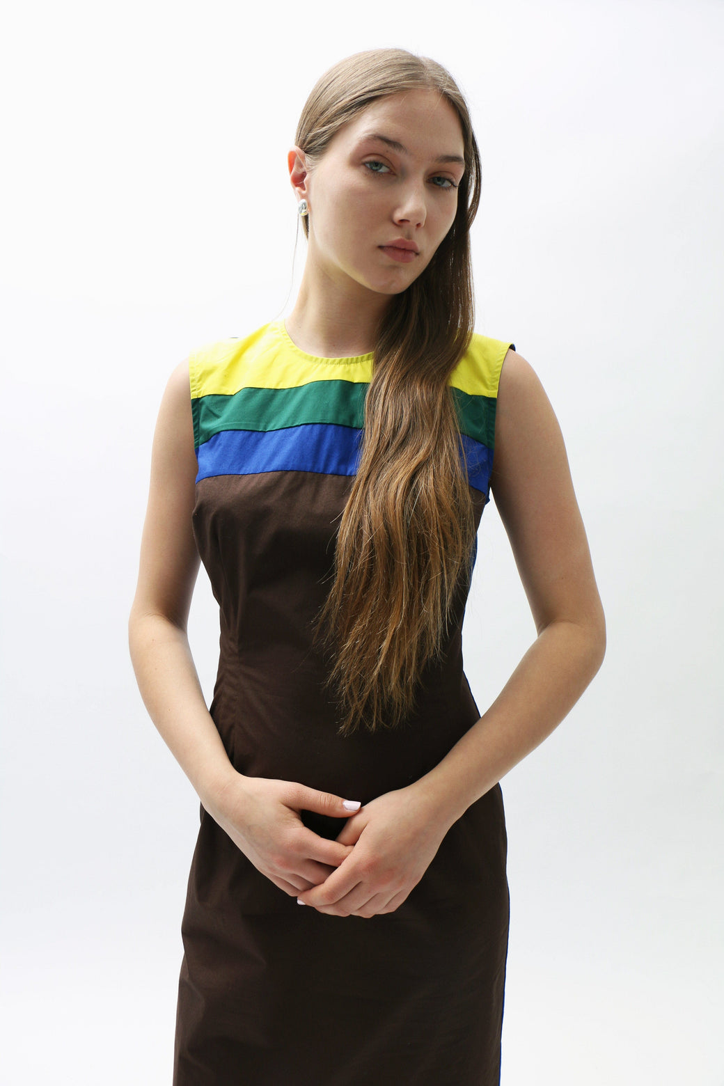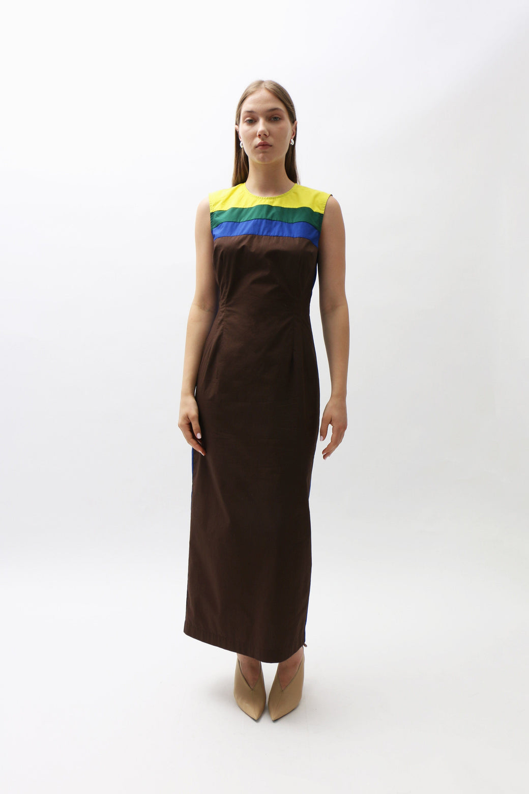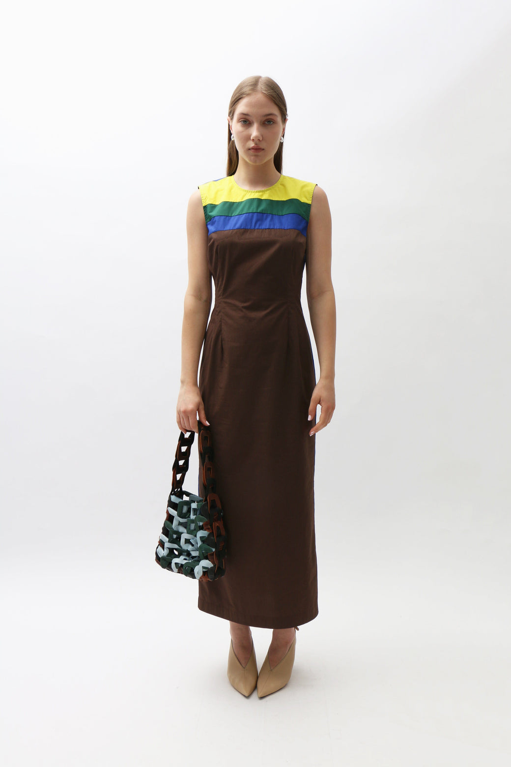 A Maimoun exclusive. This cotton poplin midi dress showcases a multicolored striped panel across the chest and collar. Delicate dart seams at the bust create subtle shaping. Finished with a hidden back zipper.