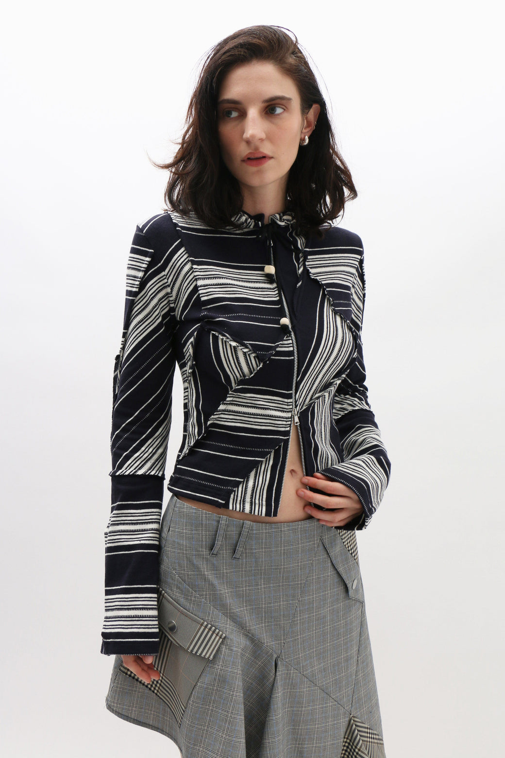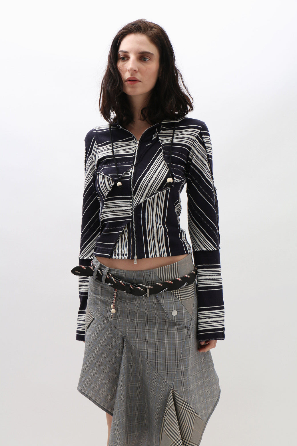 Zip-up patchwork stripe hoodie featuring a drawstring hood, two-way zipper closure, and wooden beads at the drawstring ends. Made from deadstock material and vintage sweaters, each hoodie is unique due to the variation in argyle placement, while the colorway remains the same.