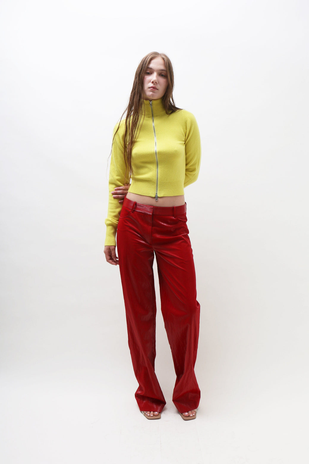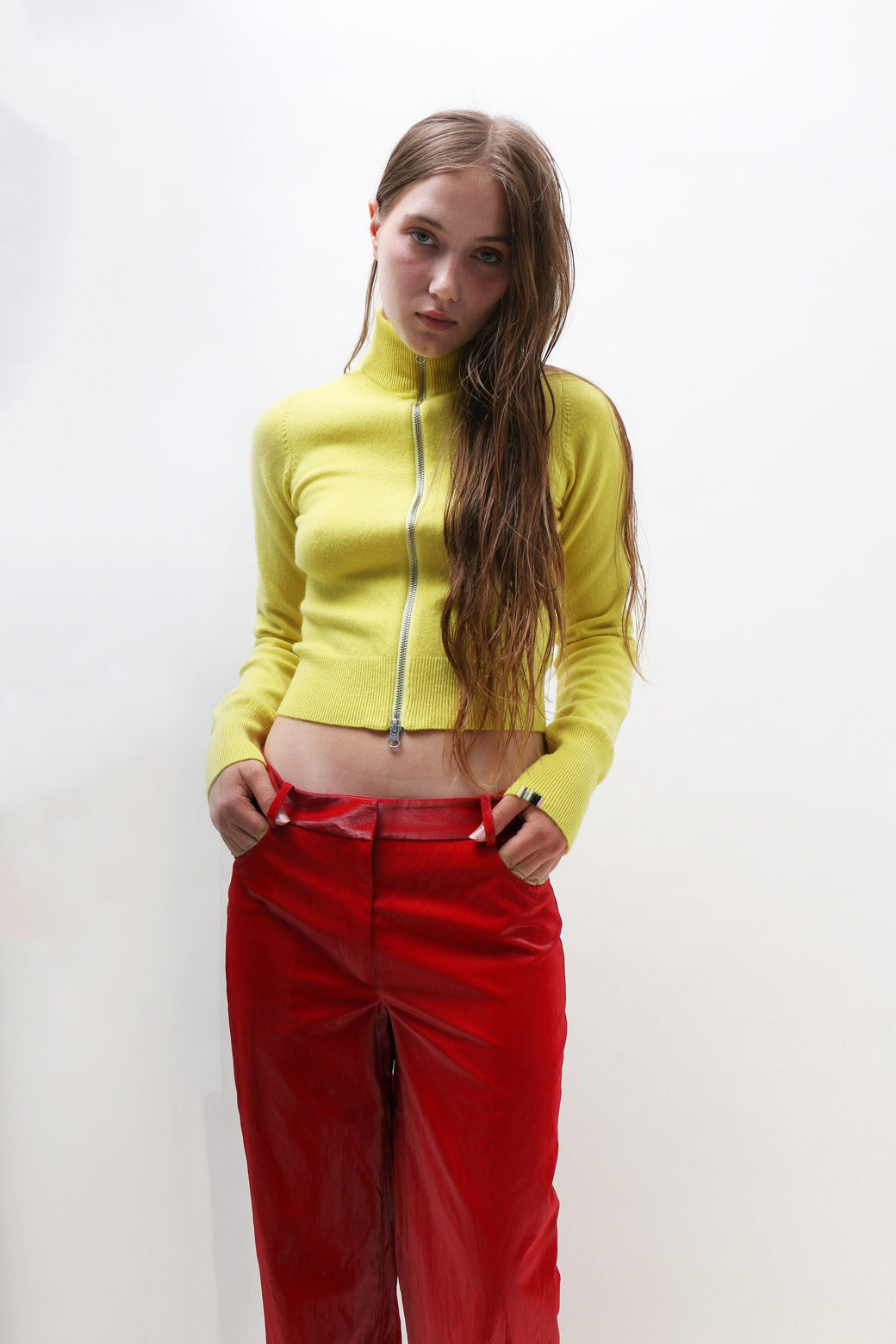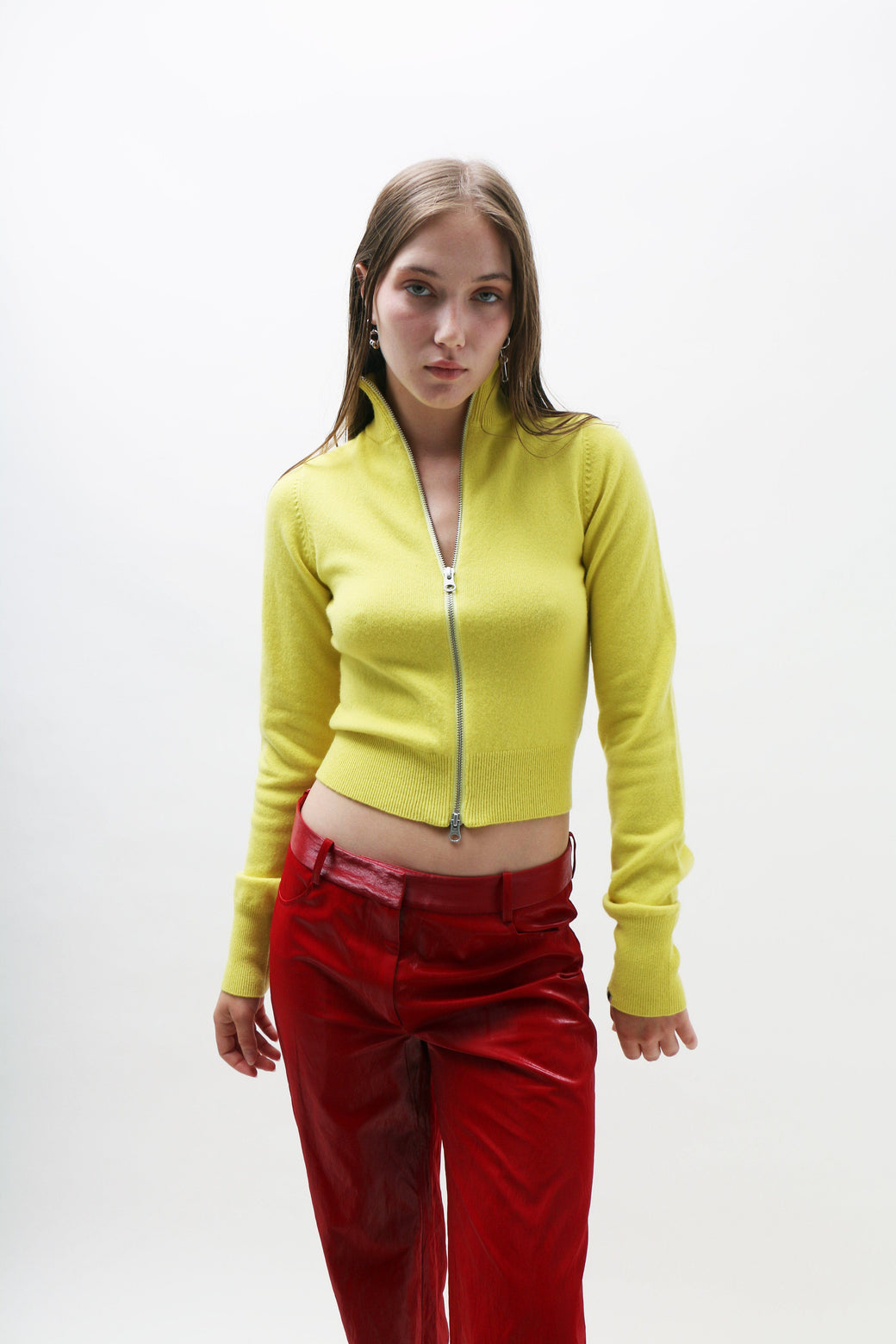 A sporty bright yellow zip-up cardigan with a high collar, extra-long sleeves, and a close, contoured fit. The two-way zipper allows for adjustable styling and ease of movement.