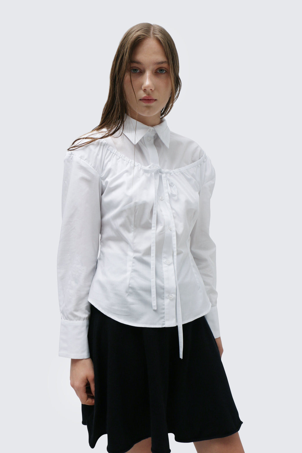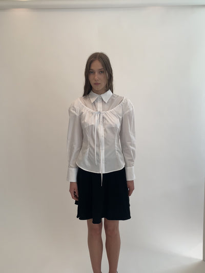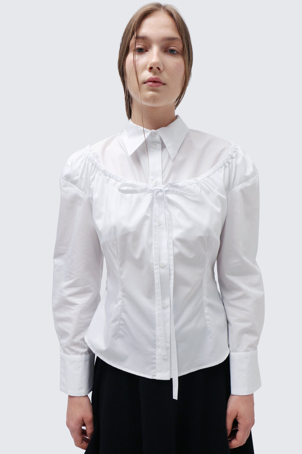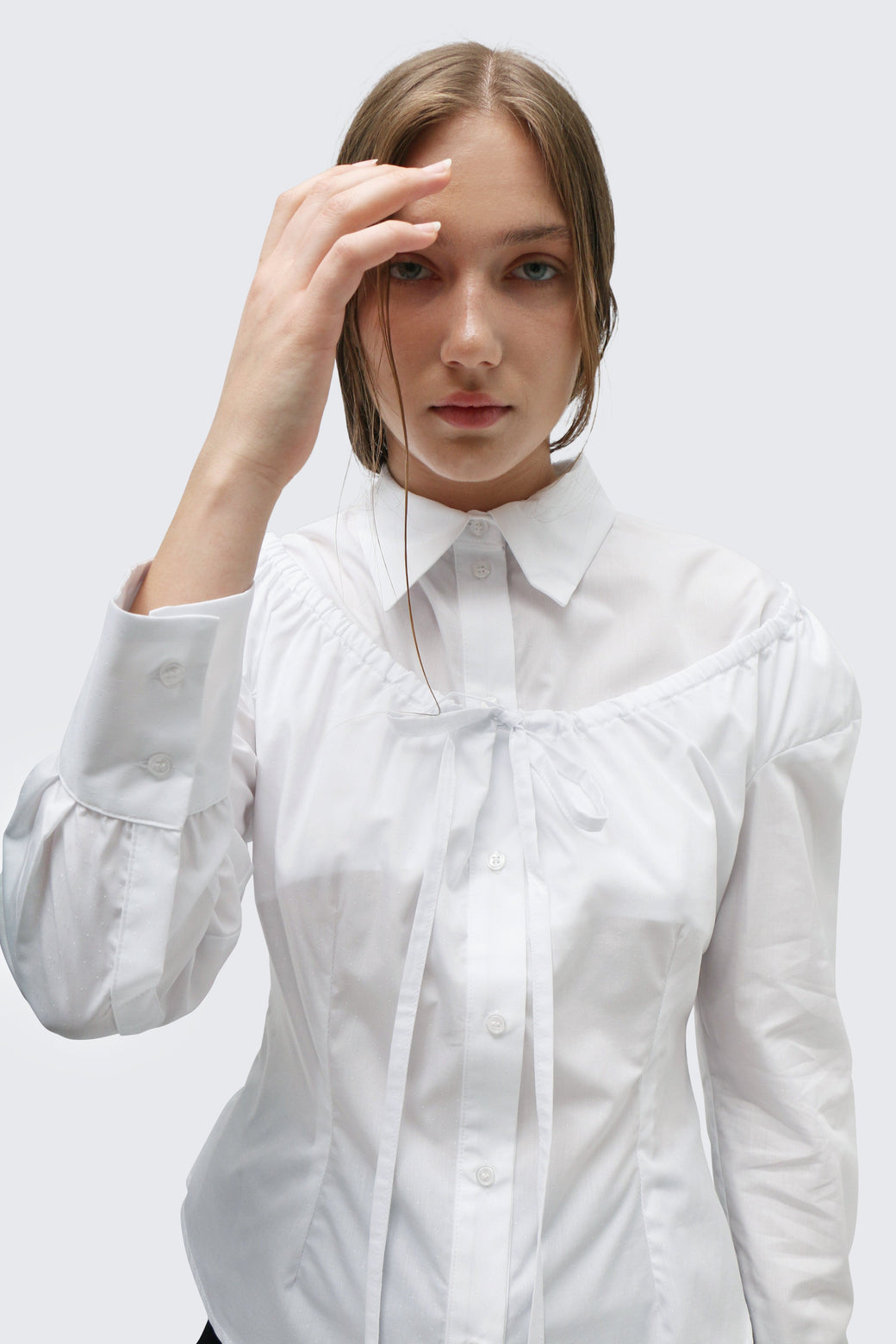 White long sleeve collared blouse with a double-layered effect and a tie at the chest to ruche at the shoulders.