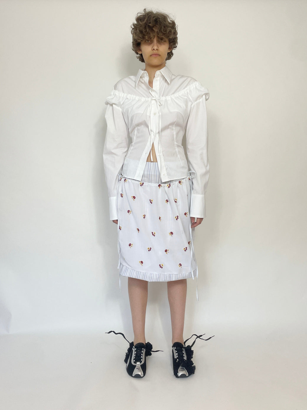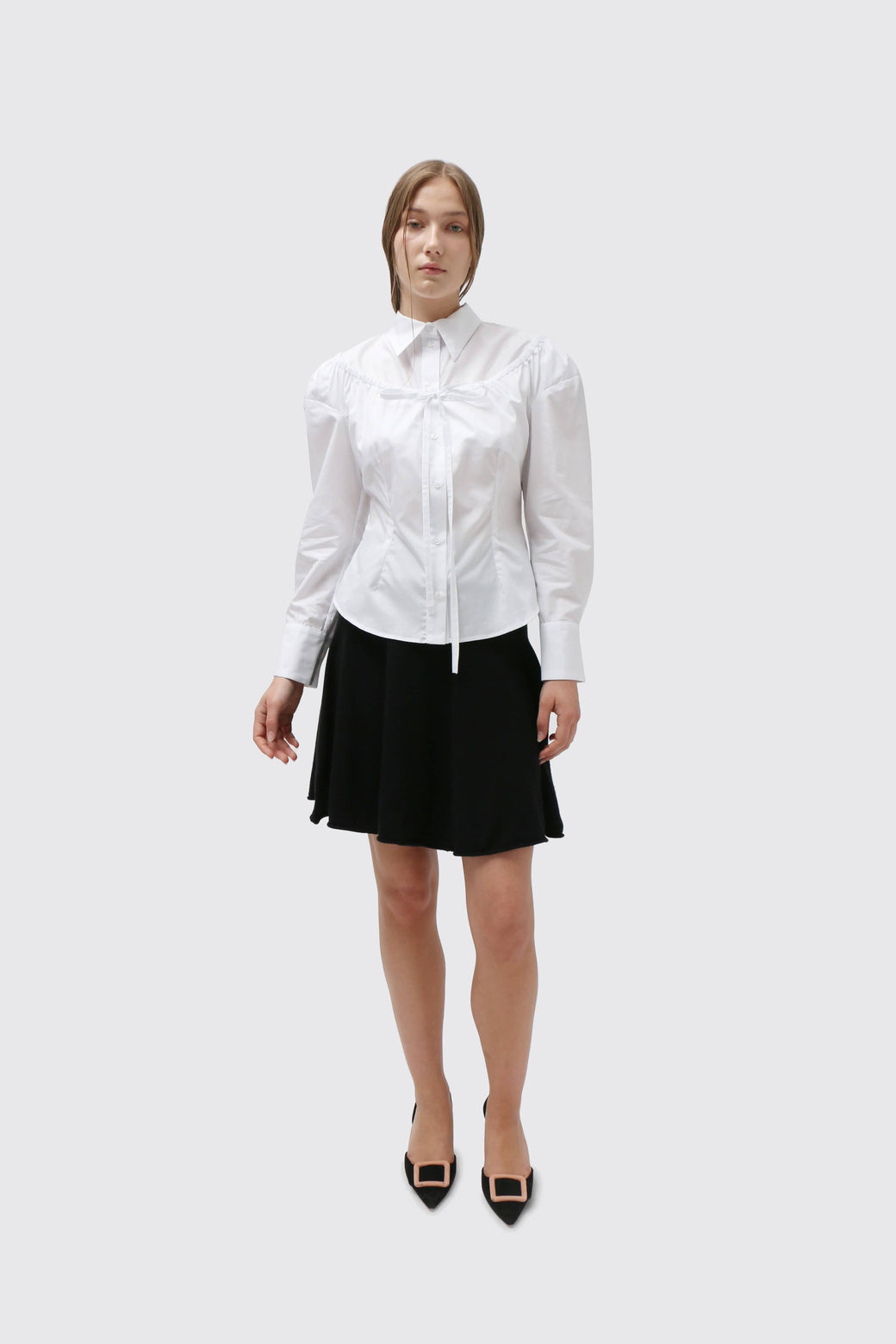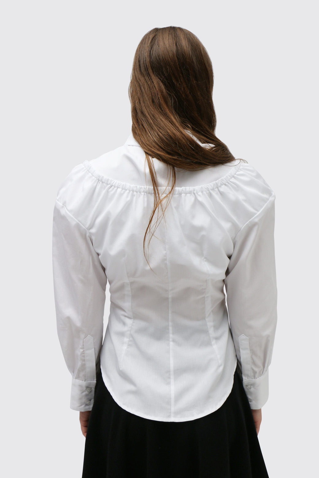 White long sleeve collared blouse with a double-layered effect and a tie at the chest to ruche at the shoulders.