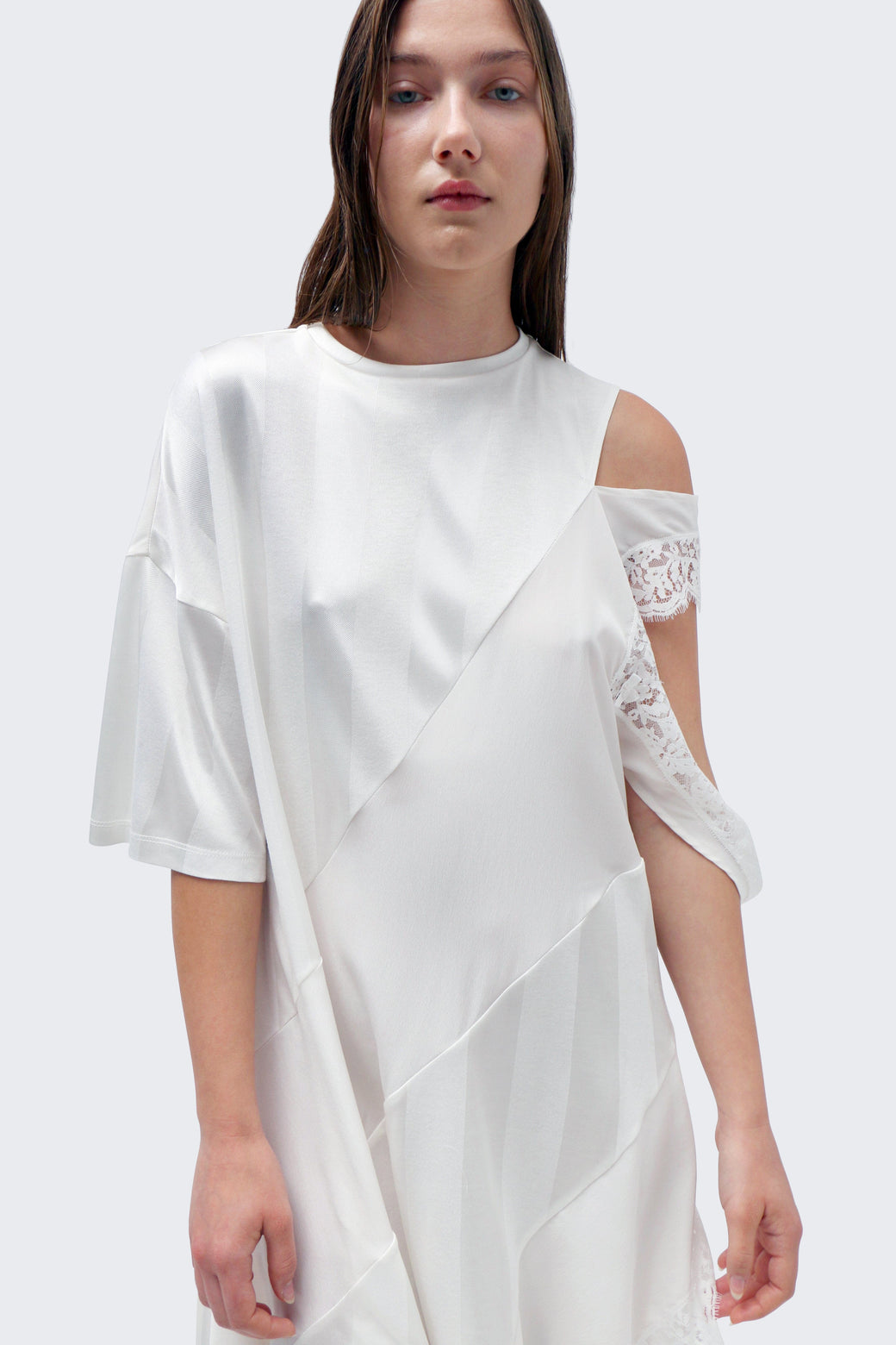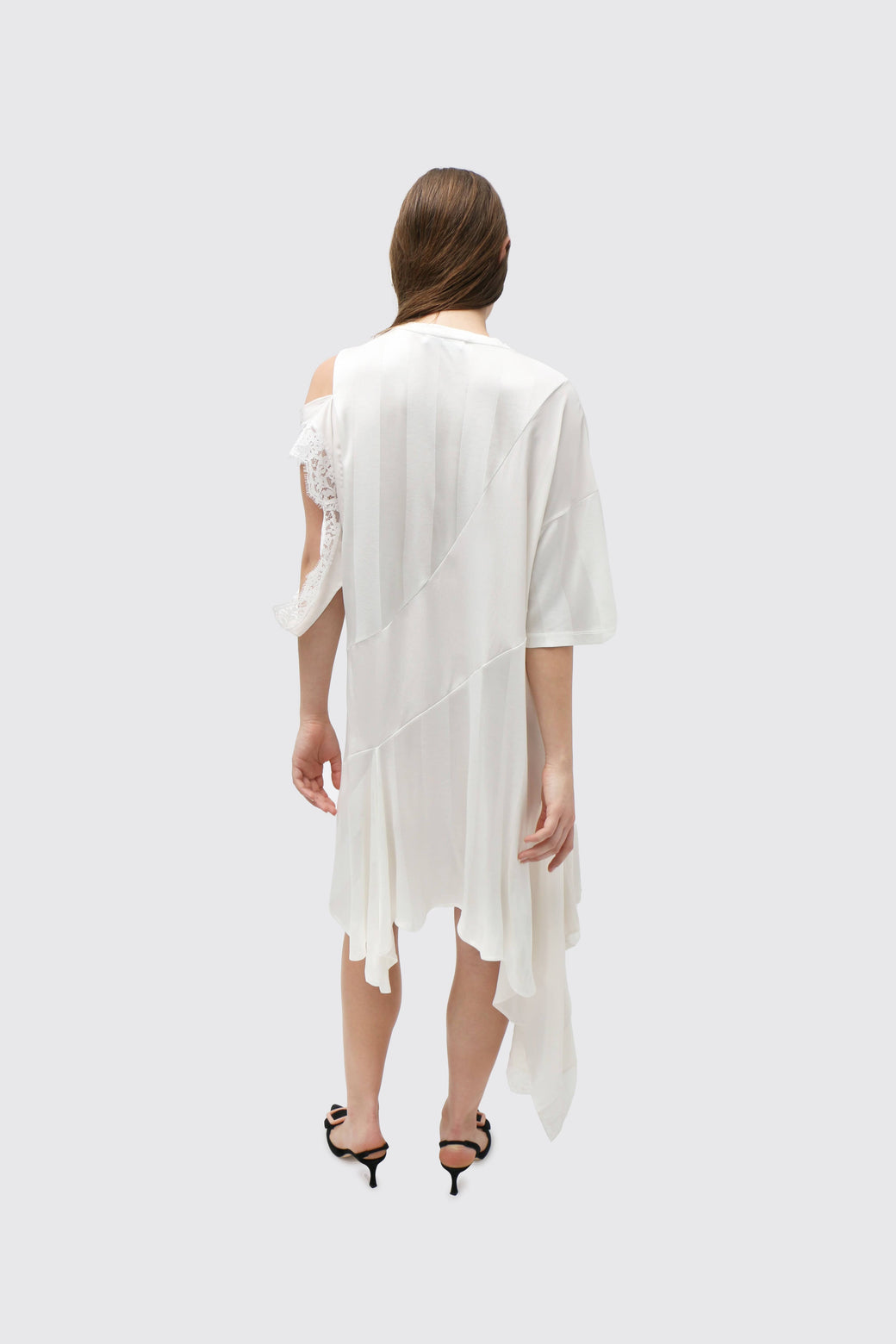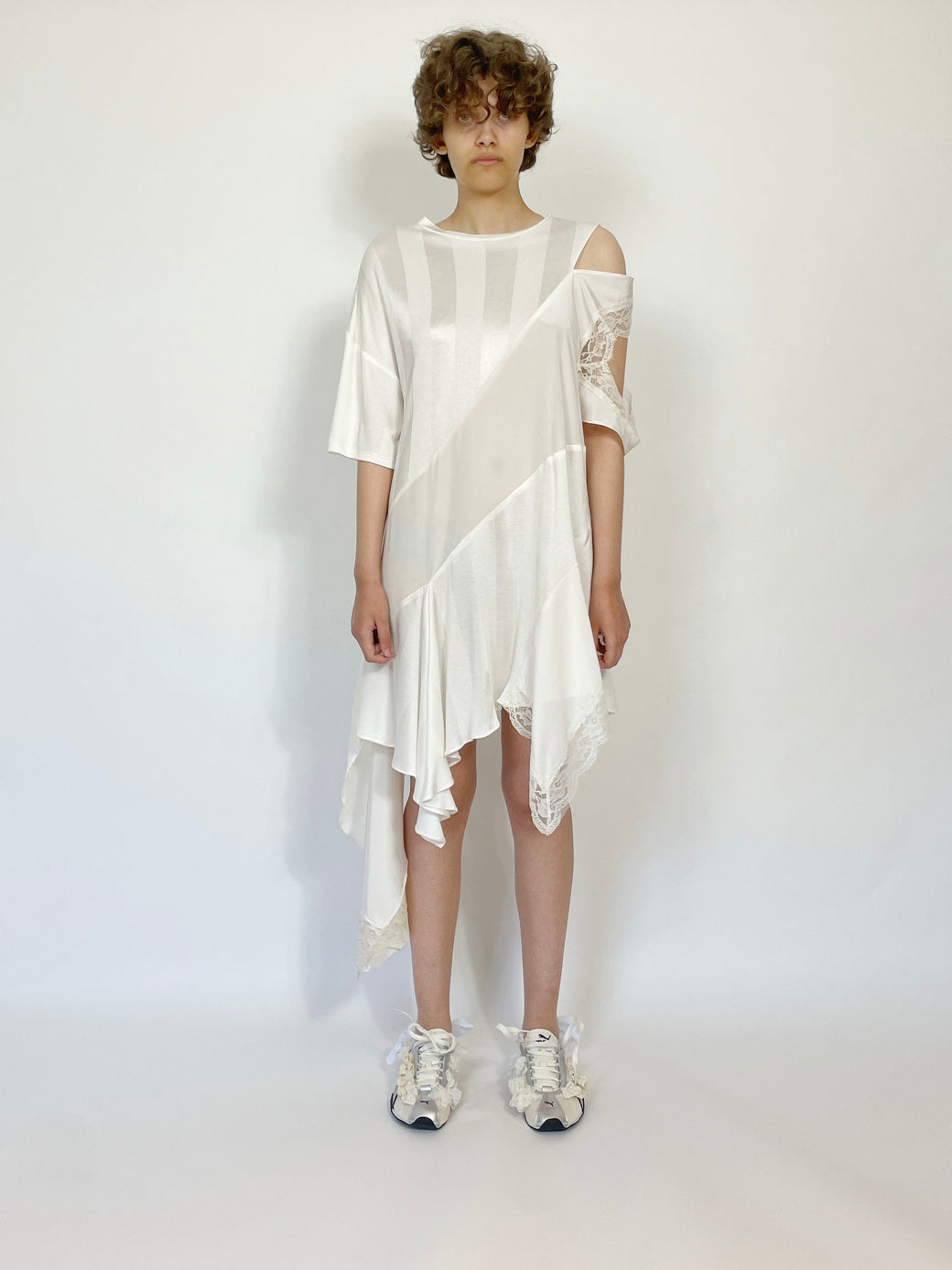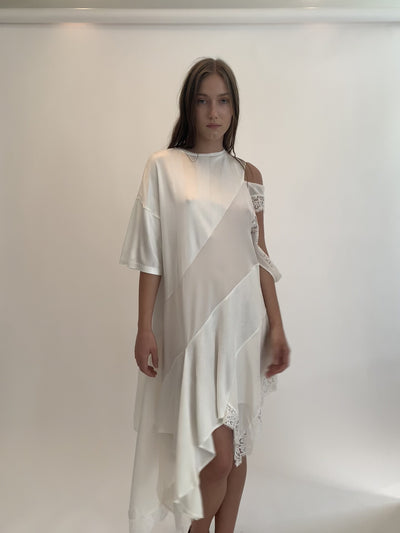 Asymmetric mini/midi dress featuring white panels that differ in sheerness, with a deconstructed lace sleeve. Made of deadstock fabric.