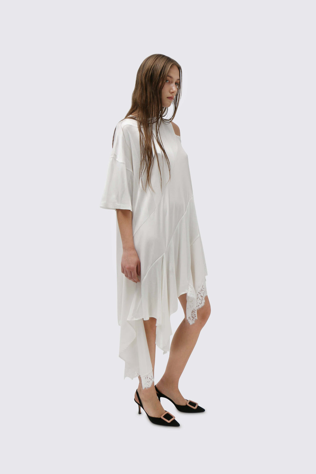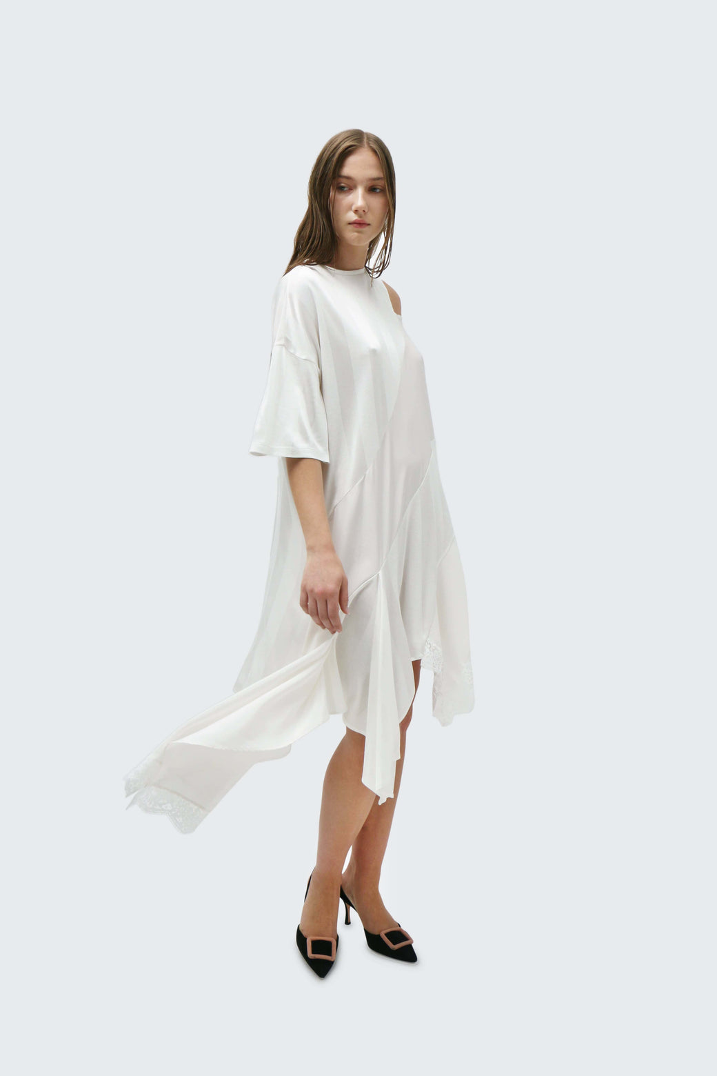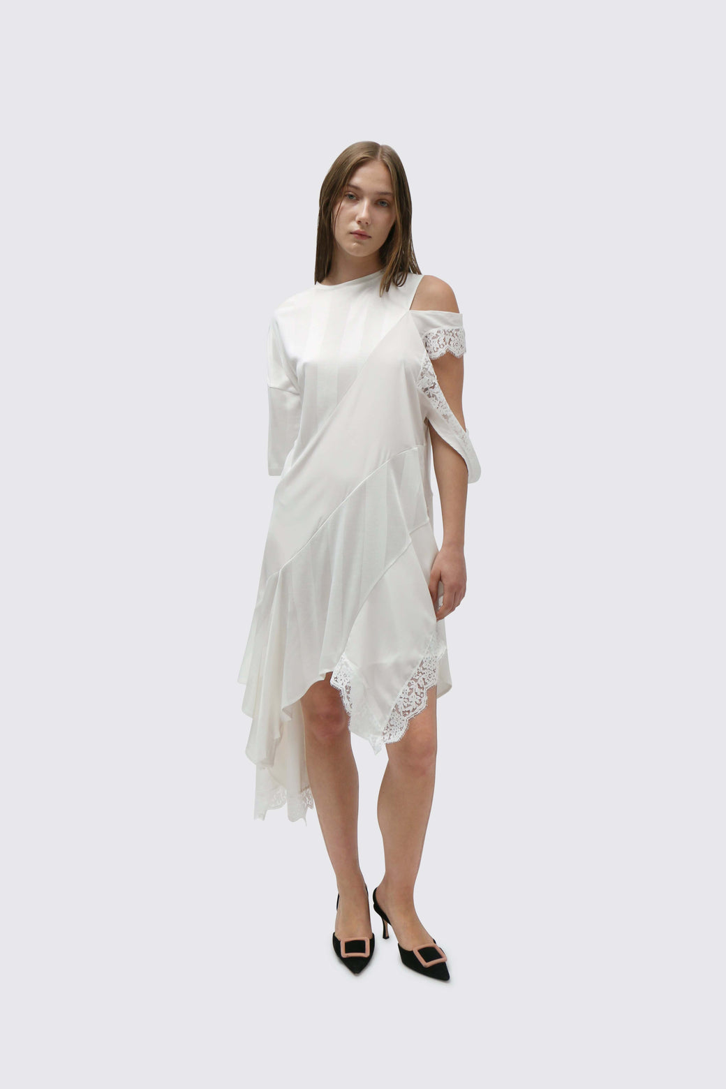 Asymmetric mini/midi dress featuring white panels that differ in sheerness, with a deconstructed lace sleeve. Made of deadstock fabric.