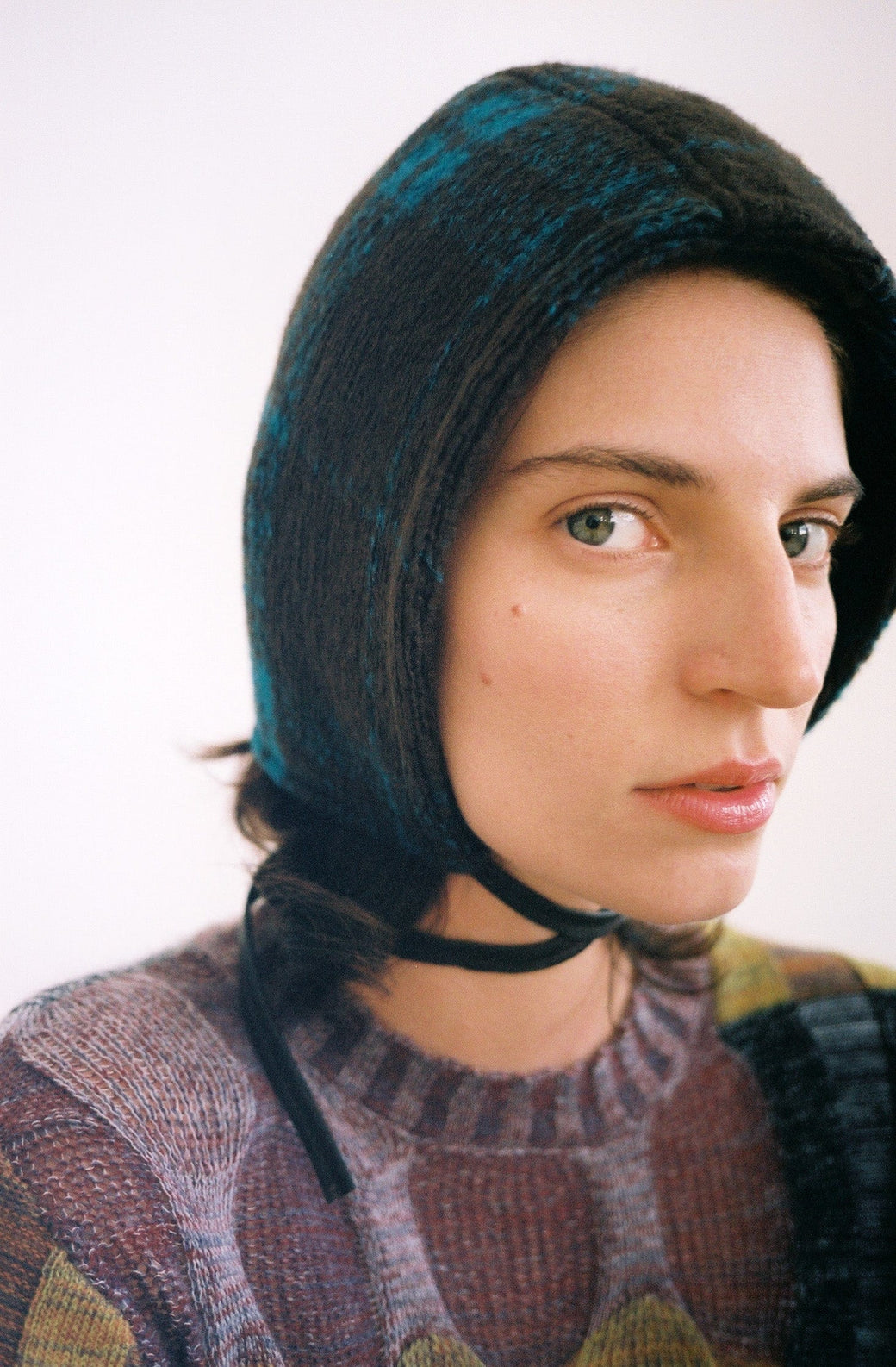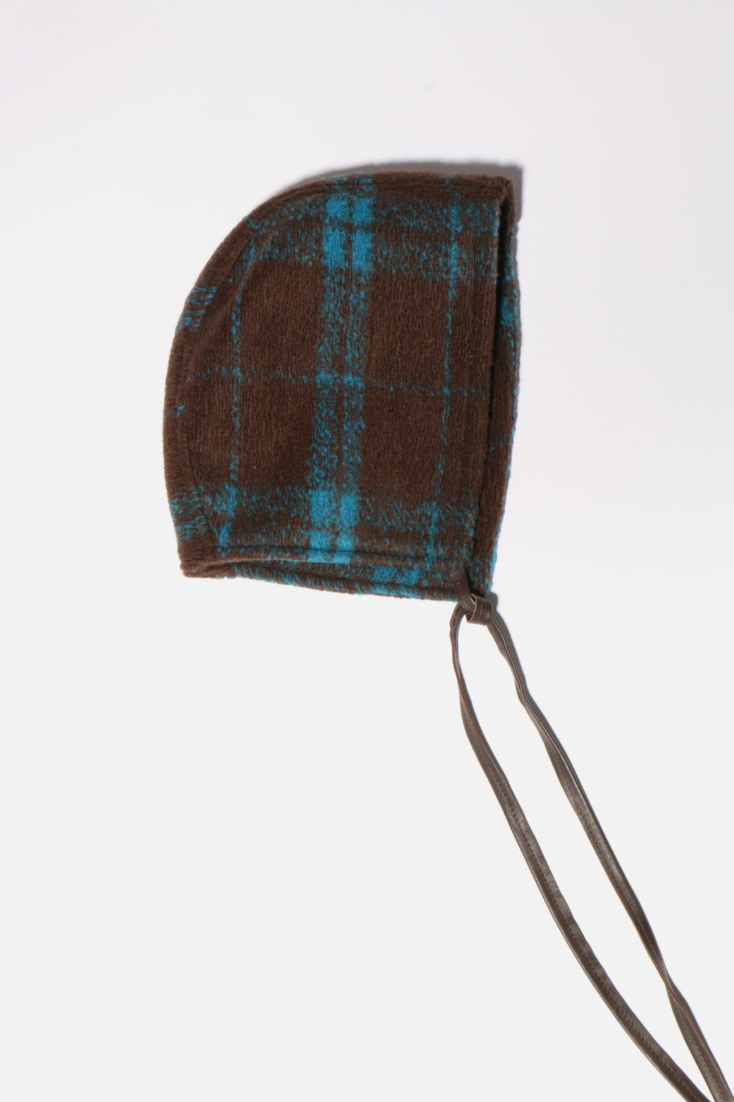 Bright electric blue and brown wool plaid hood hat with self-ties. One size fits all.