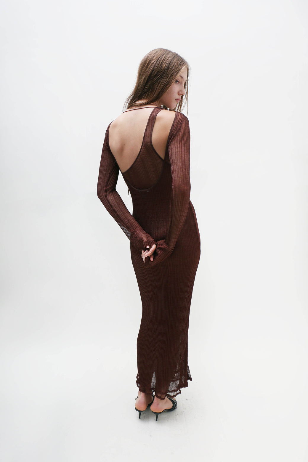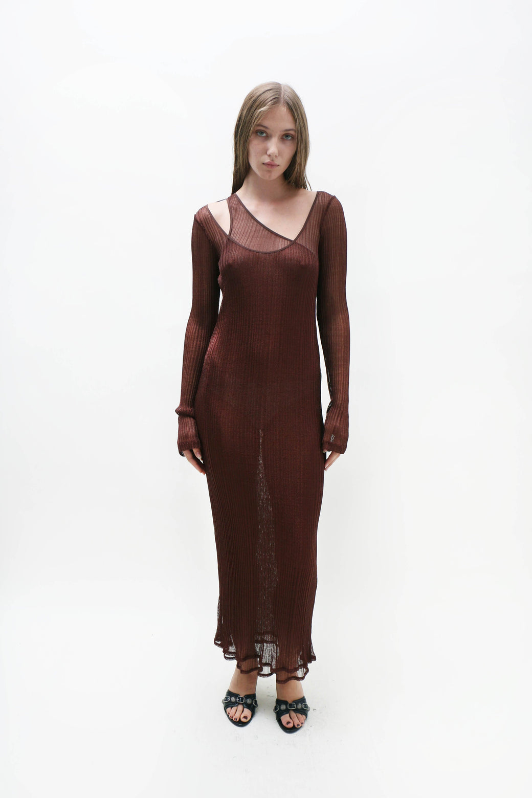 The double-layered dress is two separate dresses layered for opacity in brown bronze. The underdress is an off-the-shoulder tank dress, while the top layer is a scoop neck long sleeve dress. The slinky rib knit is enhanced with a metallic shimmering finish.
