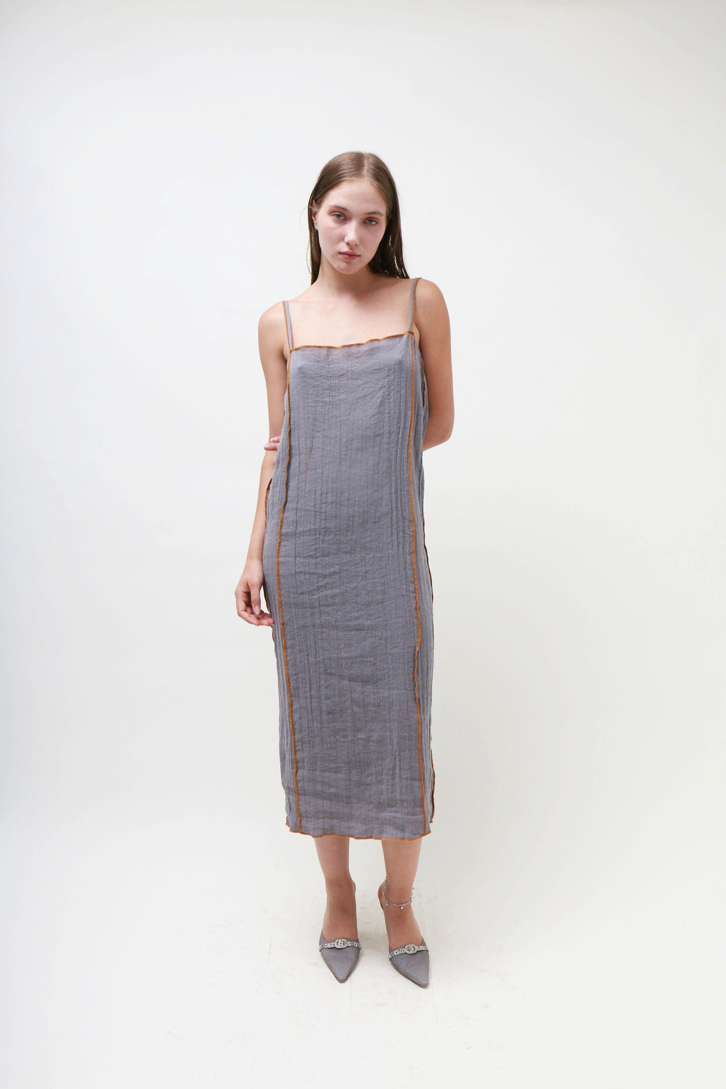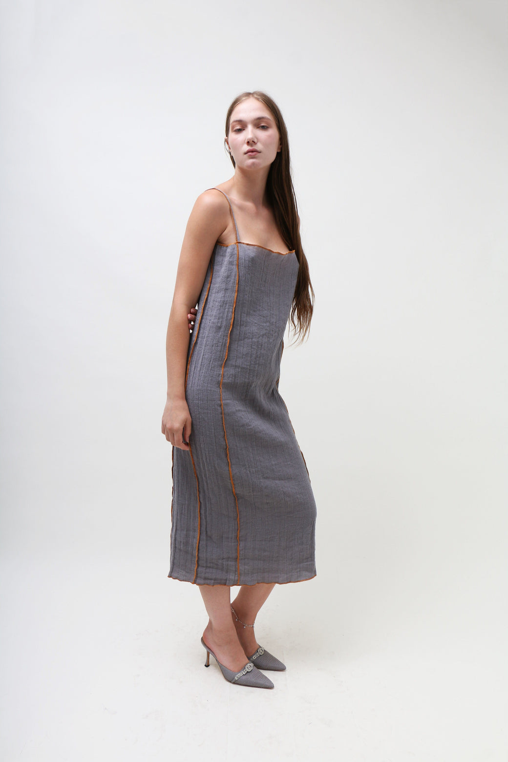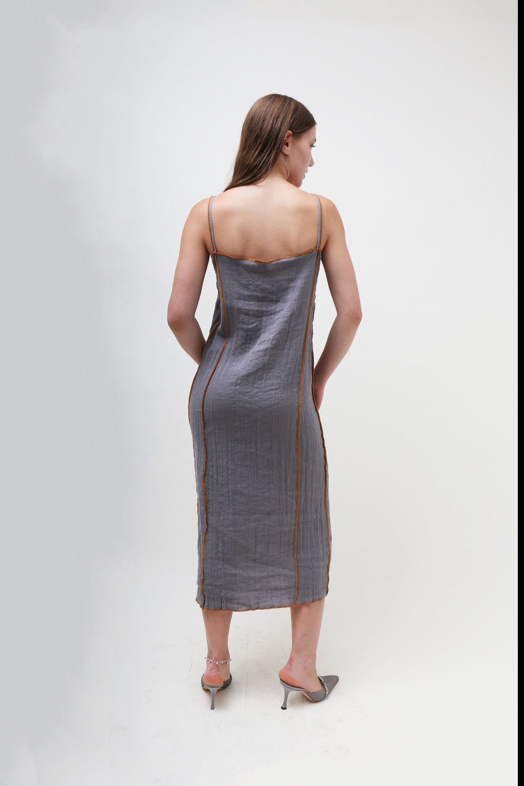 Crinkle grey linen slip dress with exposed orange contrast seams, a straight neckline, and delicate thin shoulder straps.