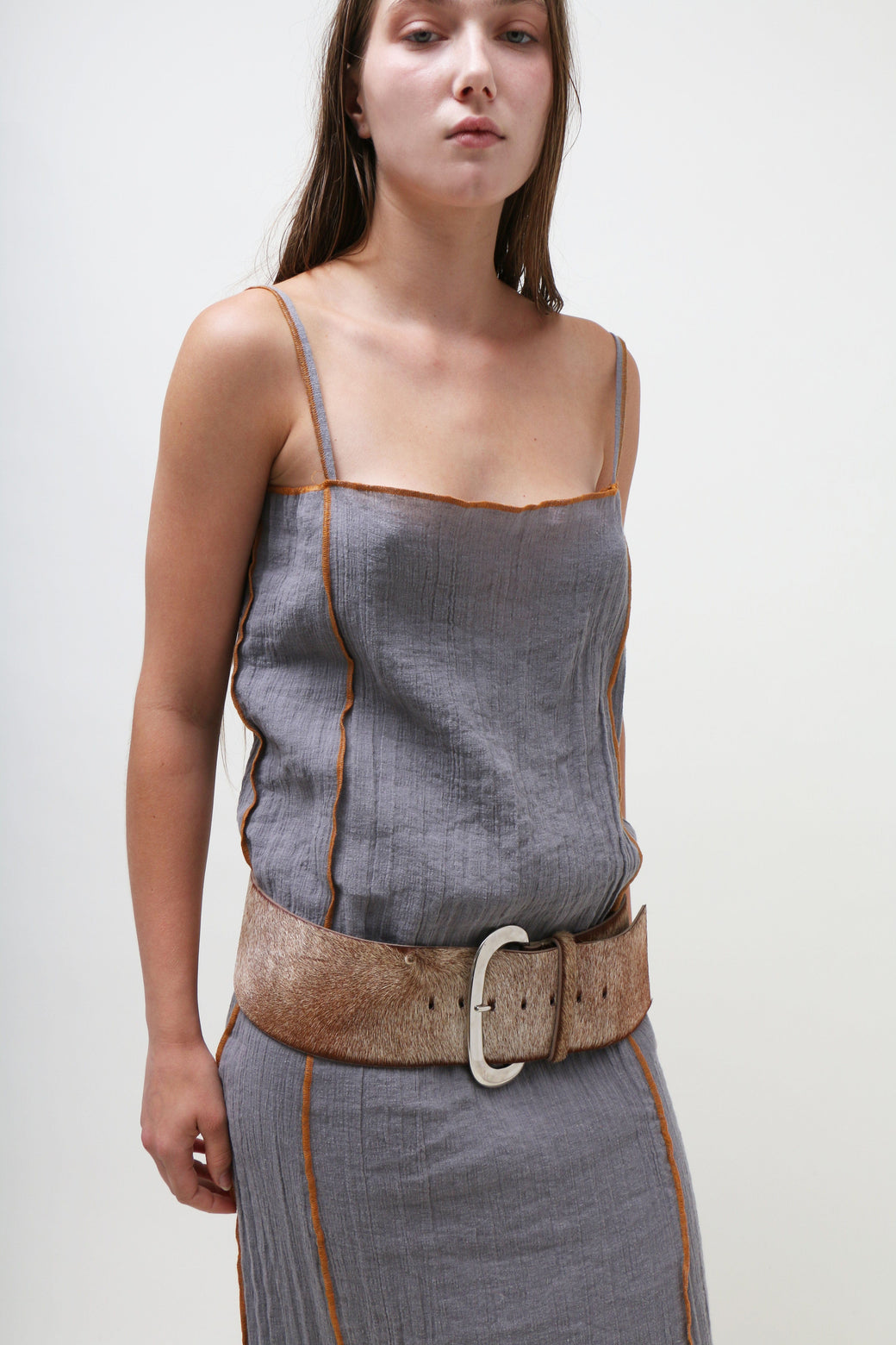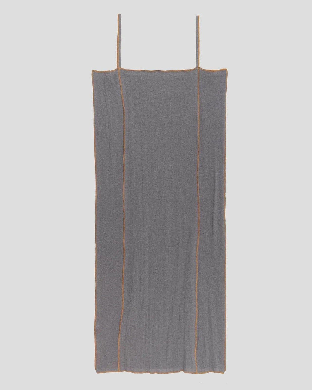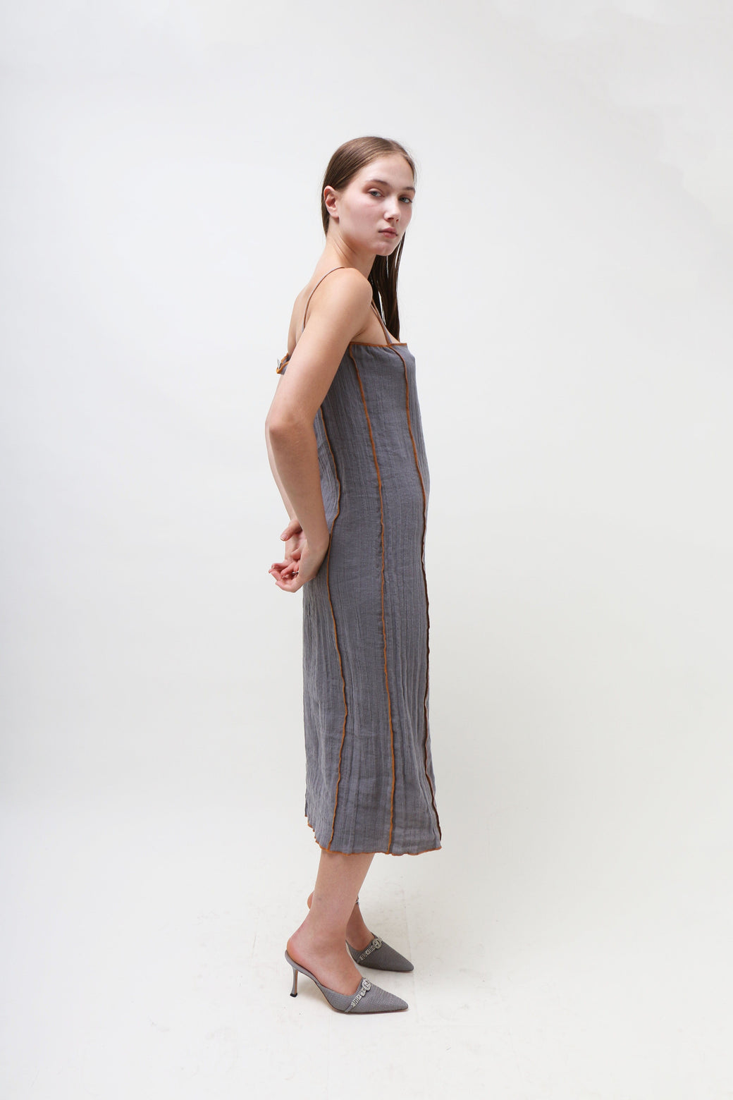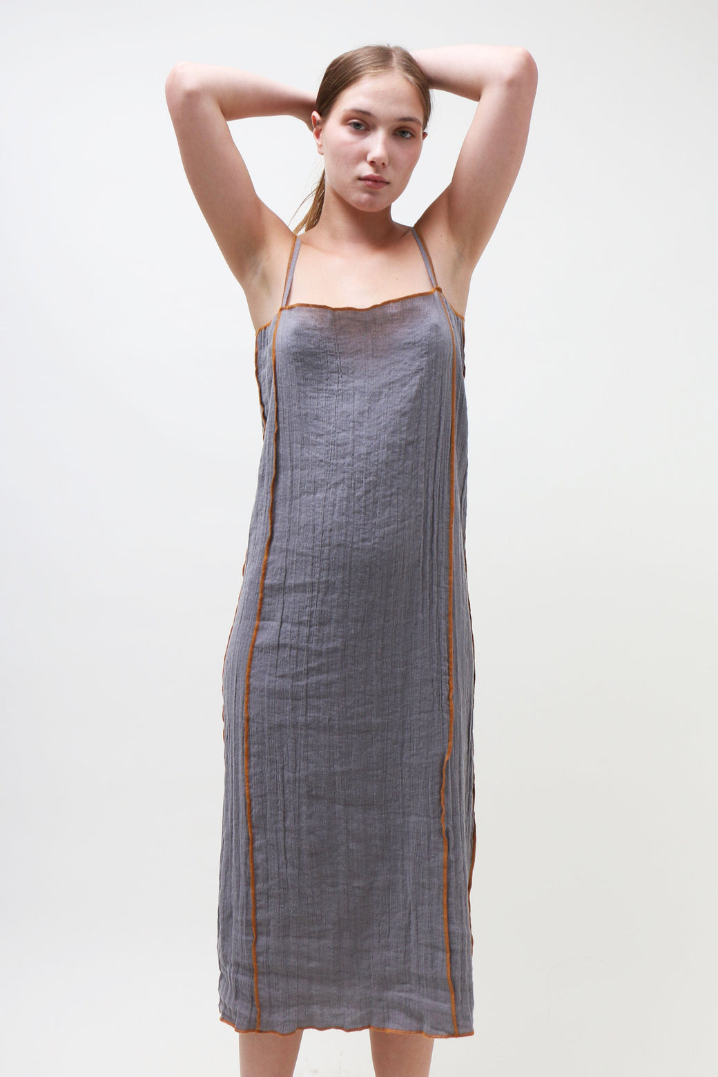 Crinkle grey linen slip dress with exposed orange contrast seams, a straight neckline, and delicate thin shoulder straps.