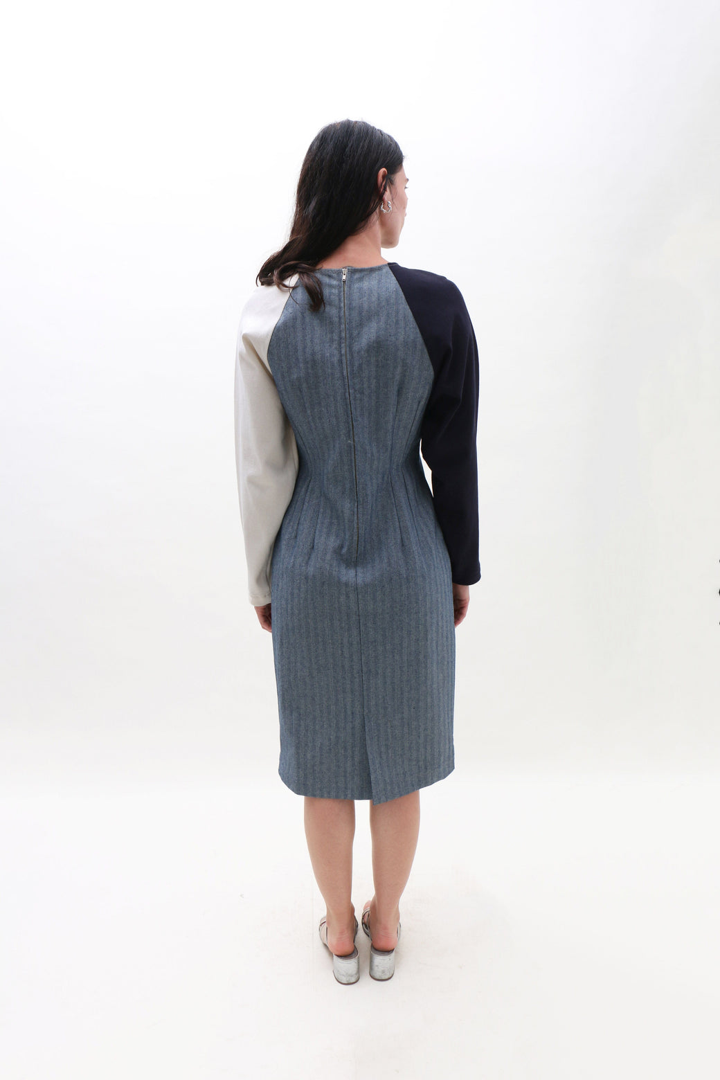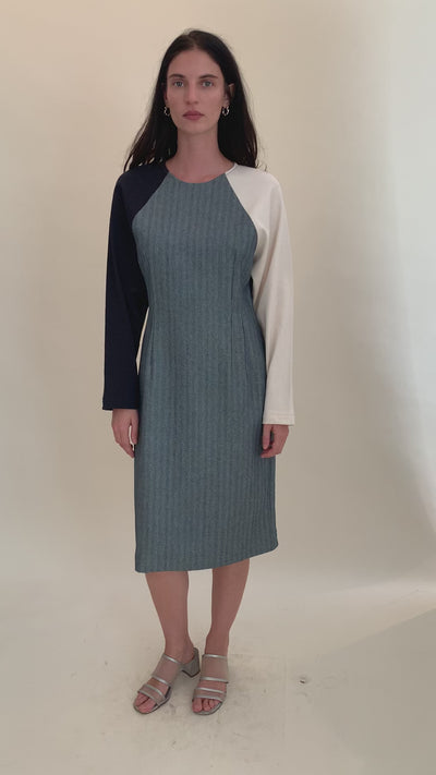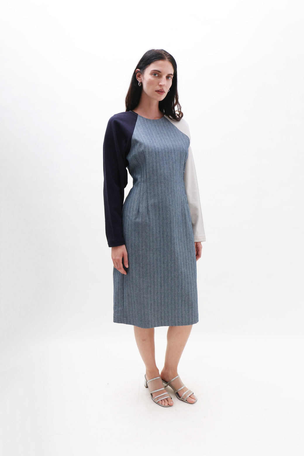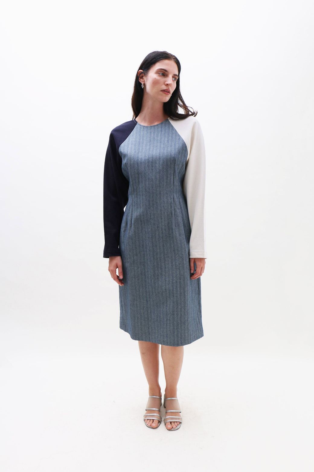A thick cotton long-sleeve dress with slightly oversized, mismatched raglan sleeves and a herringbone stripe body. Darts at the waist shape a soft, tailored silhouette finished with a zipper closure along the back.