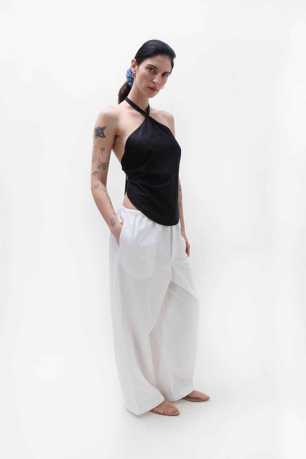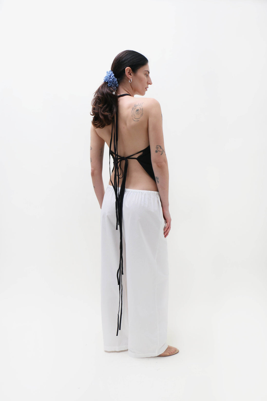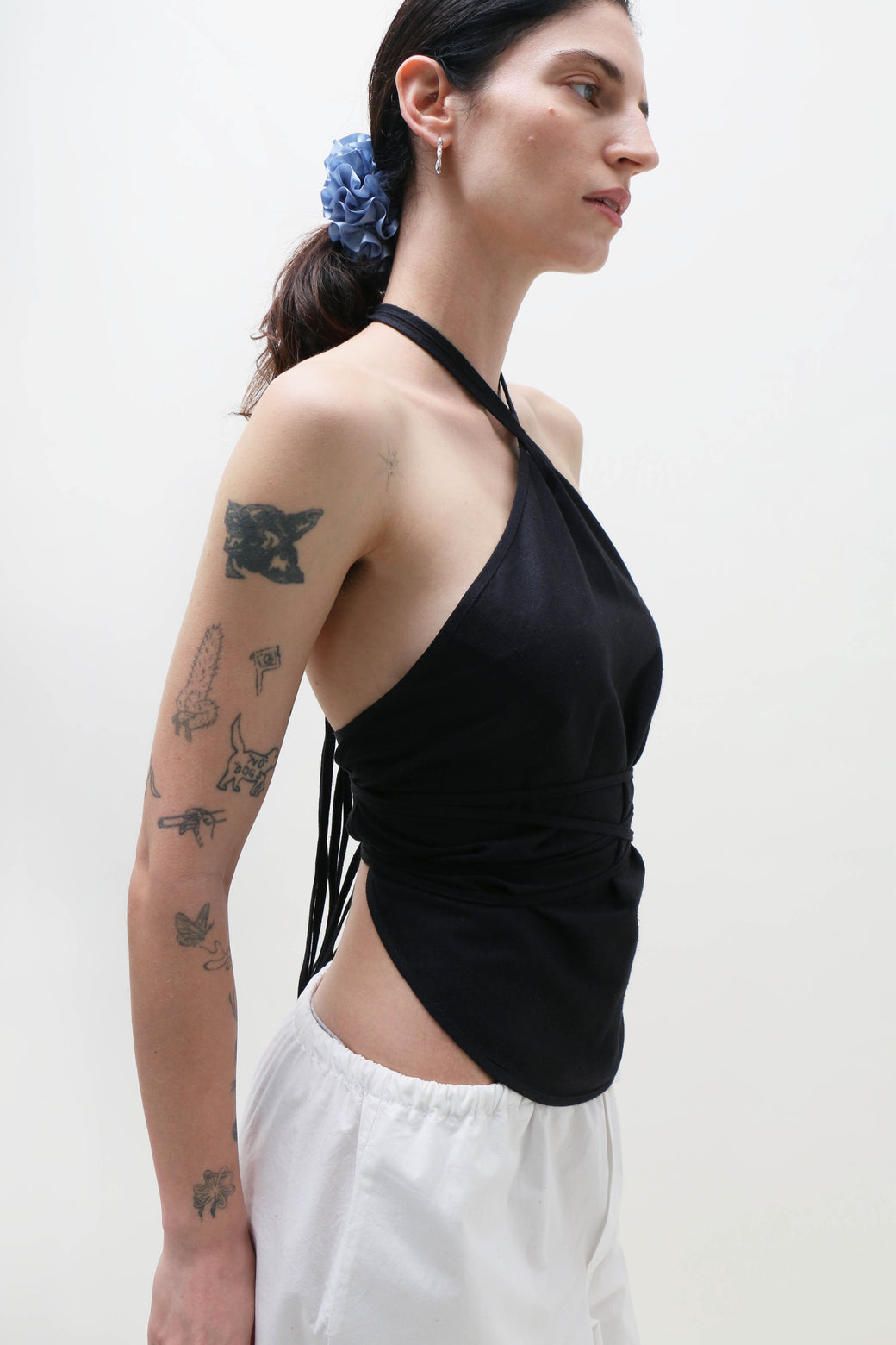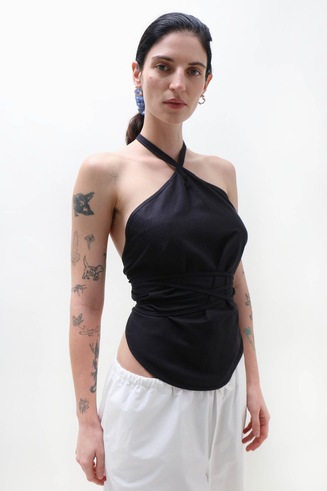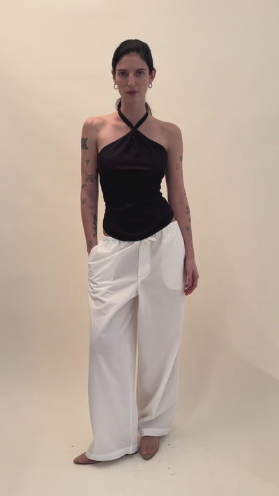The Mar top is made from wild silk and features a criss-cross halter neck, an open back, and self-tie details at both the neck and waist.