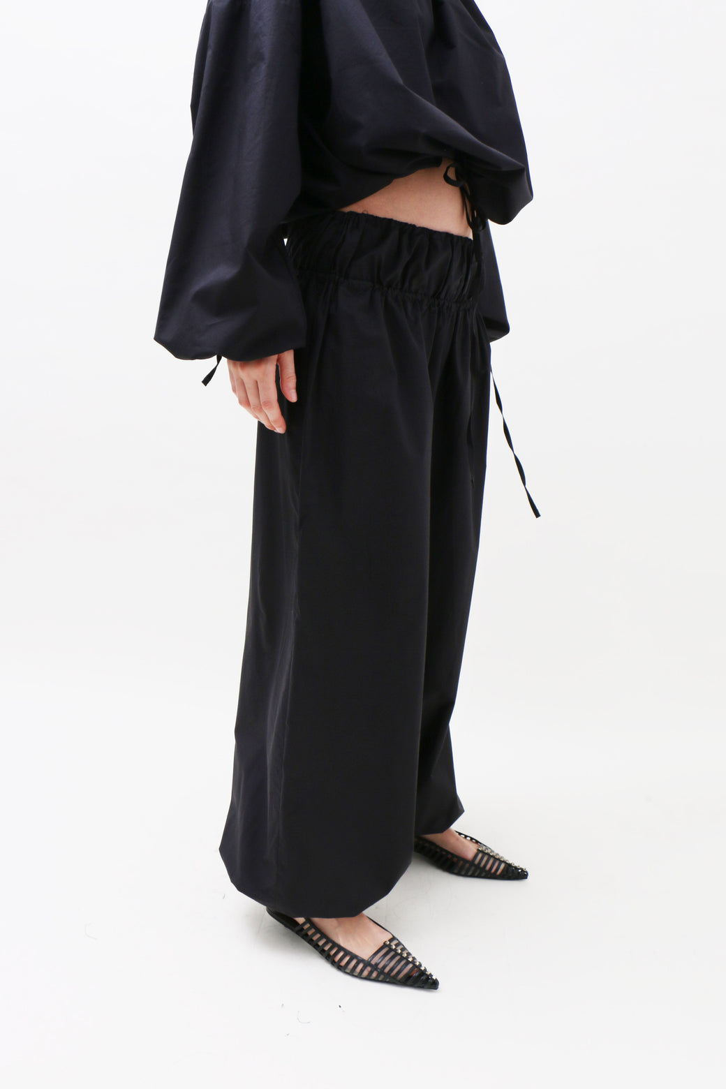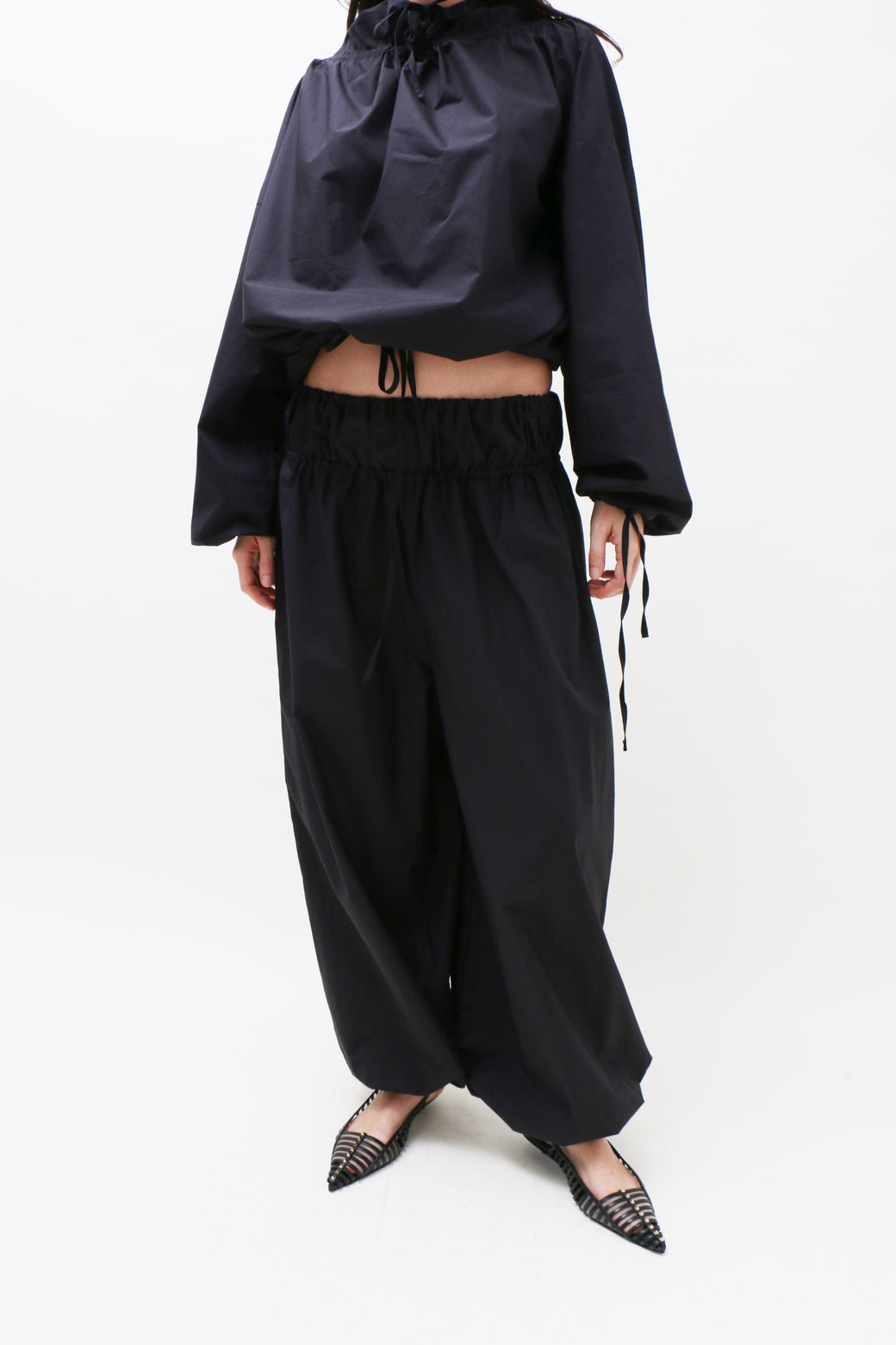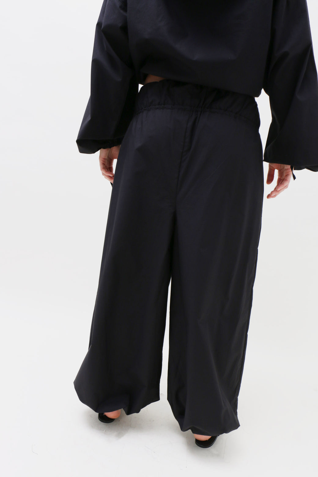 High-waisted black cotton poplin pants designed with a relaxed wide-leg fit. Featuring a drawstring closure and a double elasticated waistband.