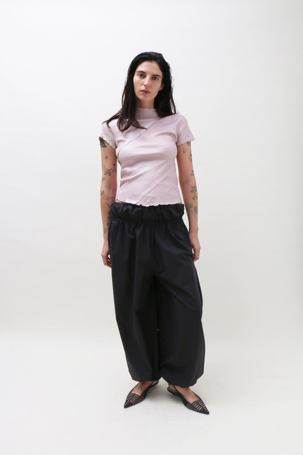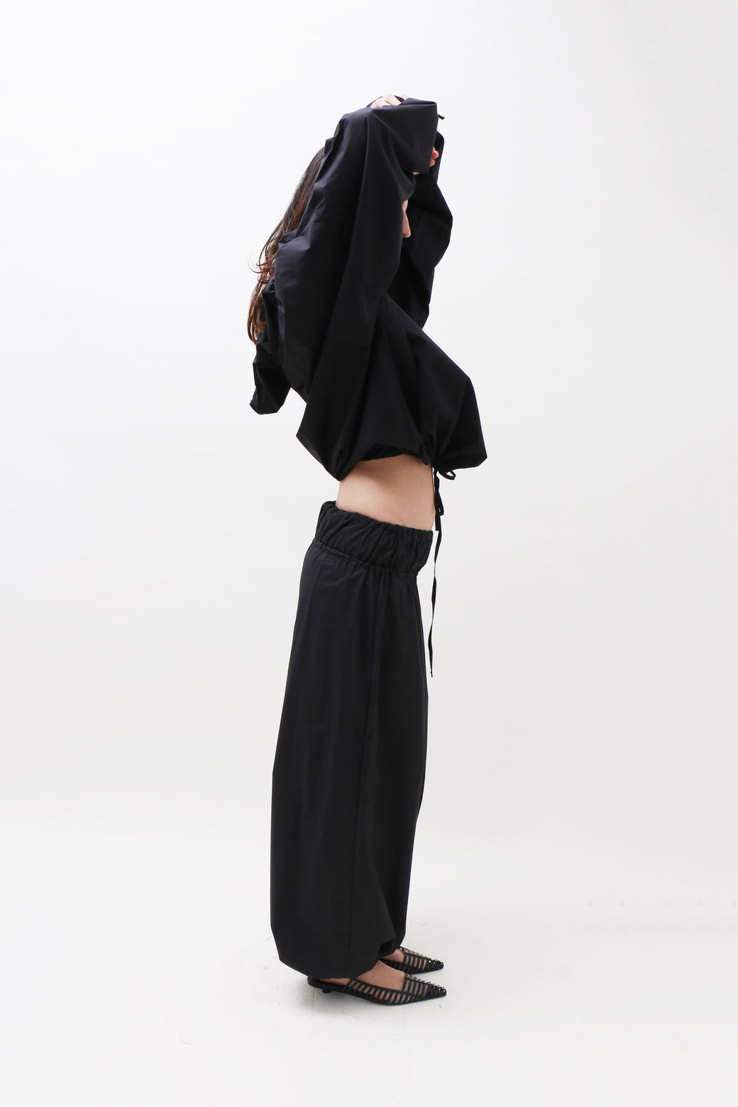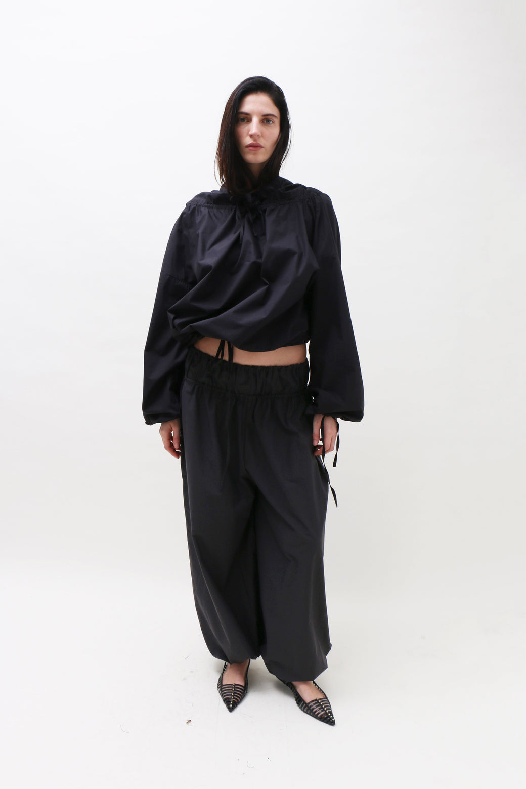 High-waisted black cotton poplin pants designed with a relaxed wide-leg fit. Featuring a drawstring closure and a double elasticated waistband.