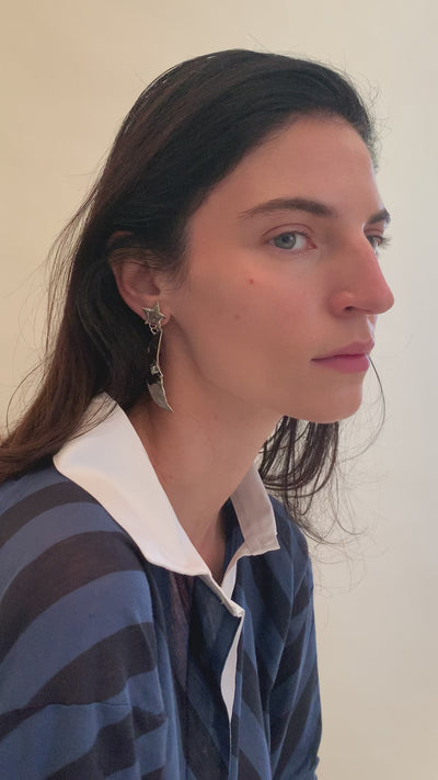 Sterling silver post-back earrings with crescent moon faces. Each set with 4mm glass cabochon. White Bronze. Dimensions: 1 x 3 inches. Comes with designer's own Jewelry Box. Each piece is hand-made in Mondo Mondo's Los Angeles studio and may vary slightly.