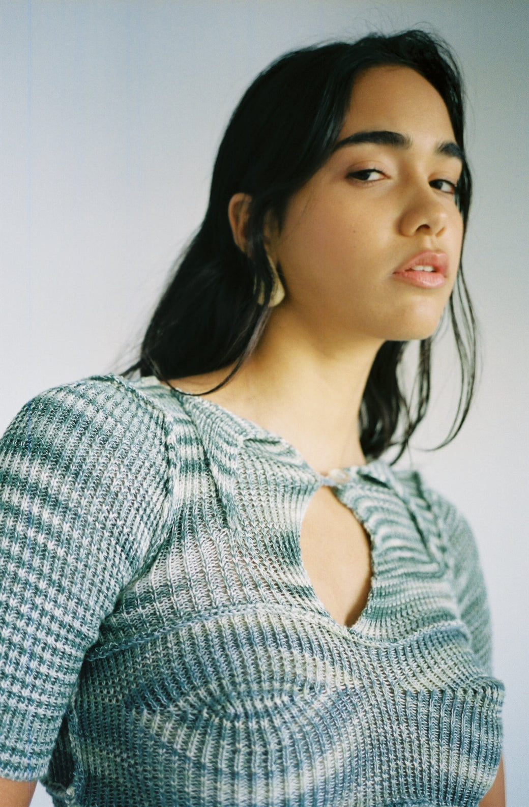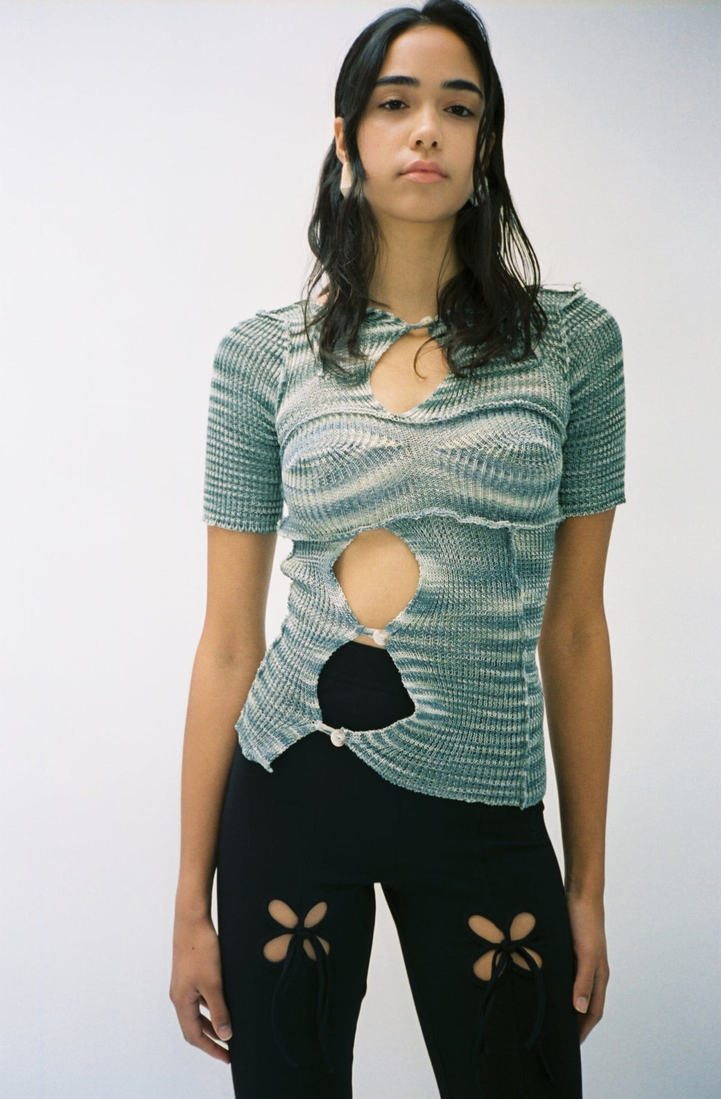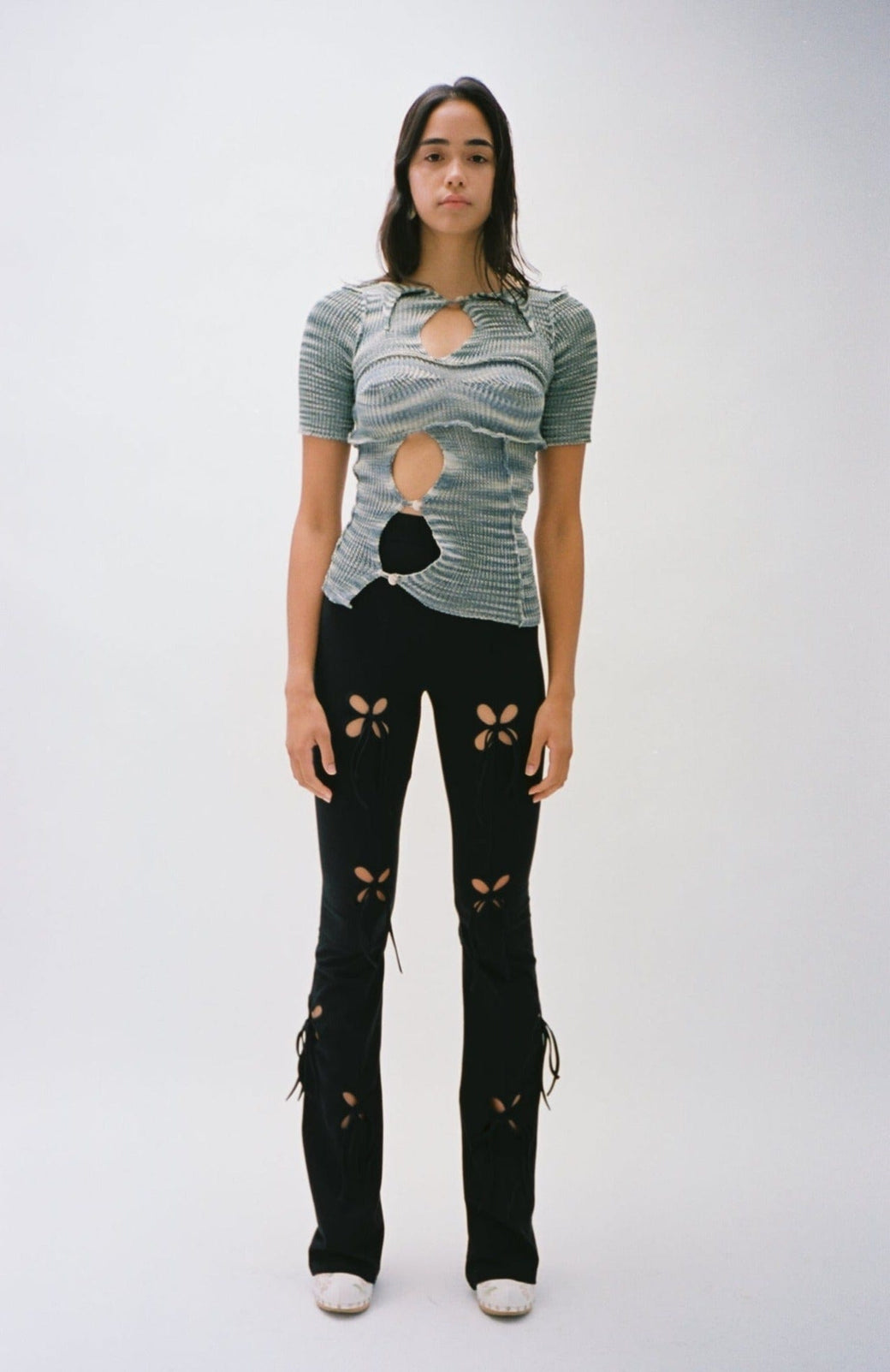 Handcrafted Rib-knit cotton-blend polo. Cutouts throughout. Paneled construction. Mock spread collar. Button closures. Warped hues of gray and green throughout. Fitted. Gabe Gordon's new collection was inspired by adrenaline and anxiety. Its influences narrowed between films like "It Follows." As well as the swirling makeout session of shame and horror at the prom in "Carrie." As clothes decay, this brand never will, and the overall brand speaks as a personal narrative. Worn with the J. Kim Black Petal Leggings and the Avery Gregory Édafos Stone Earrings.