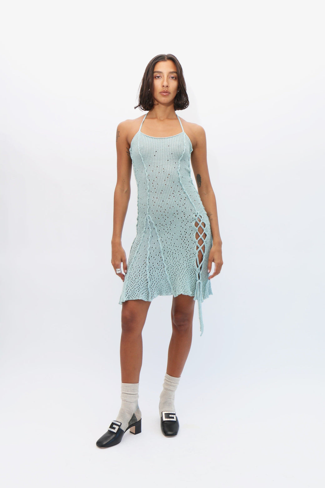 Sparkly Dress, featuring "Moth-Hole" eyelet holes and godets cascading along the body. The front right side of the dress features a stylish lacing detail, allowing personalized fit. Midi length dress, halter with tie closure.